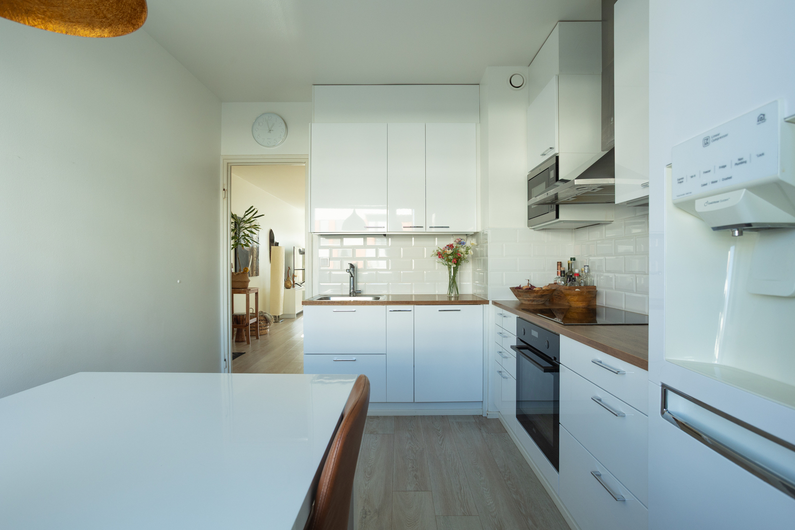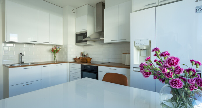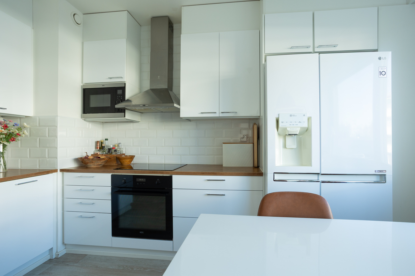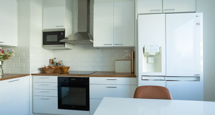 Tyylikäs ja ajaton keittiö sekä yhtenäiset lattiat on uusittu vuonna 2018, luoden harmonisen kokonaisuuden.