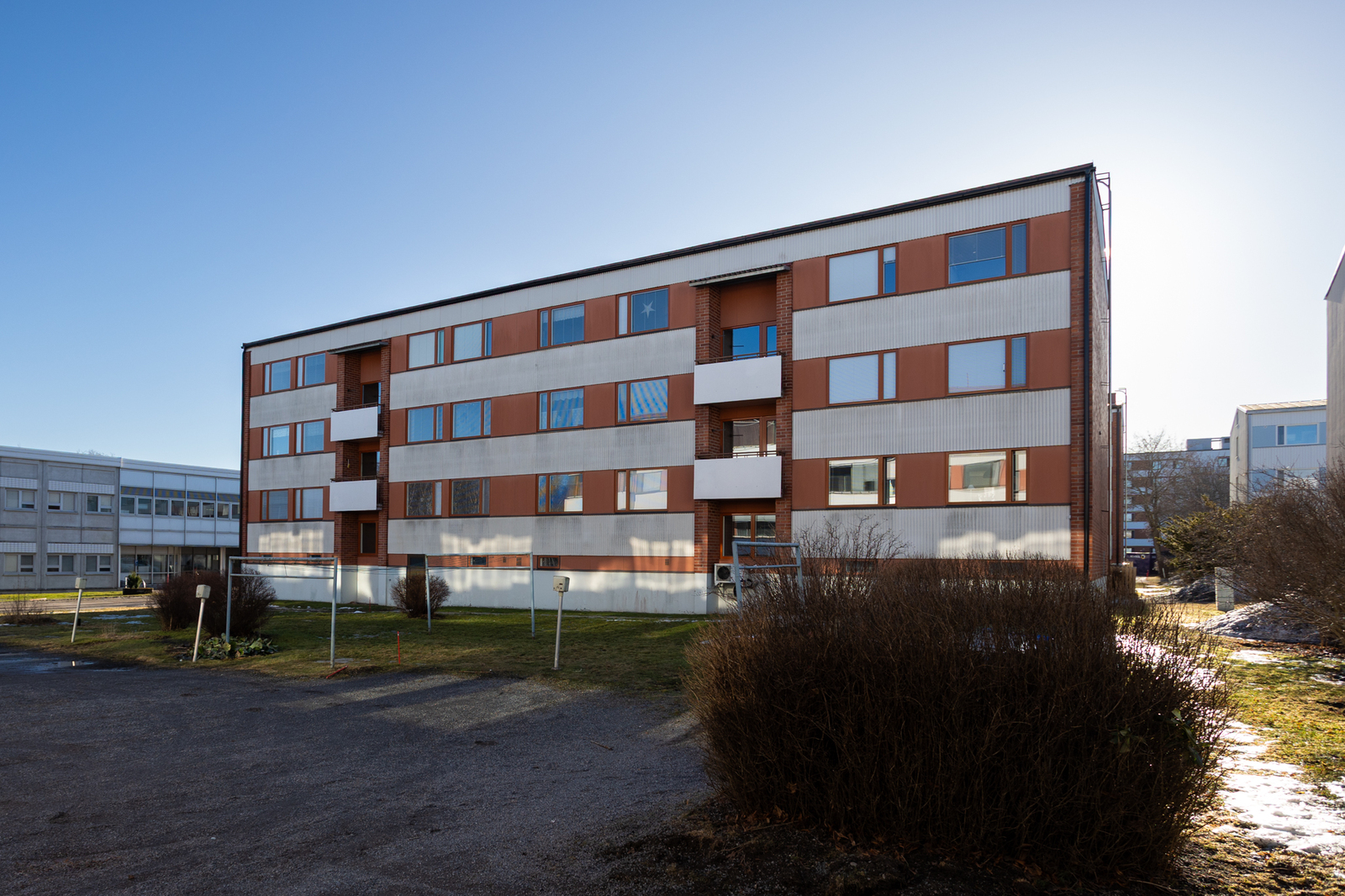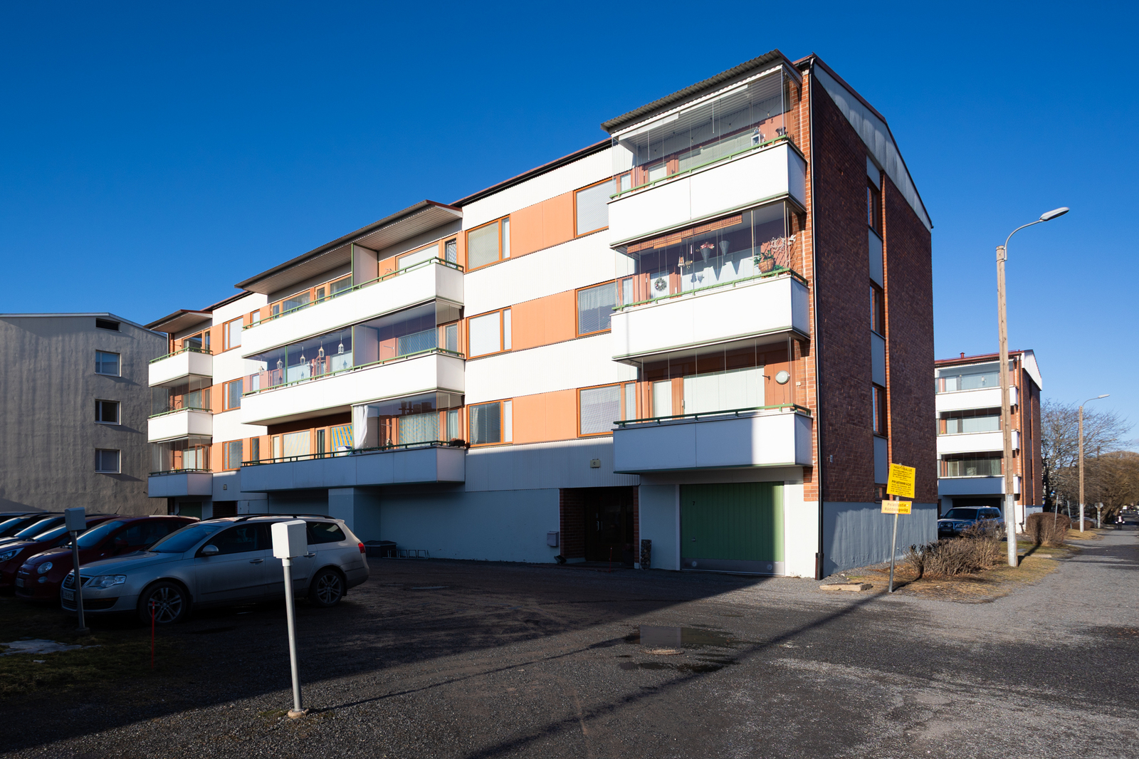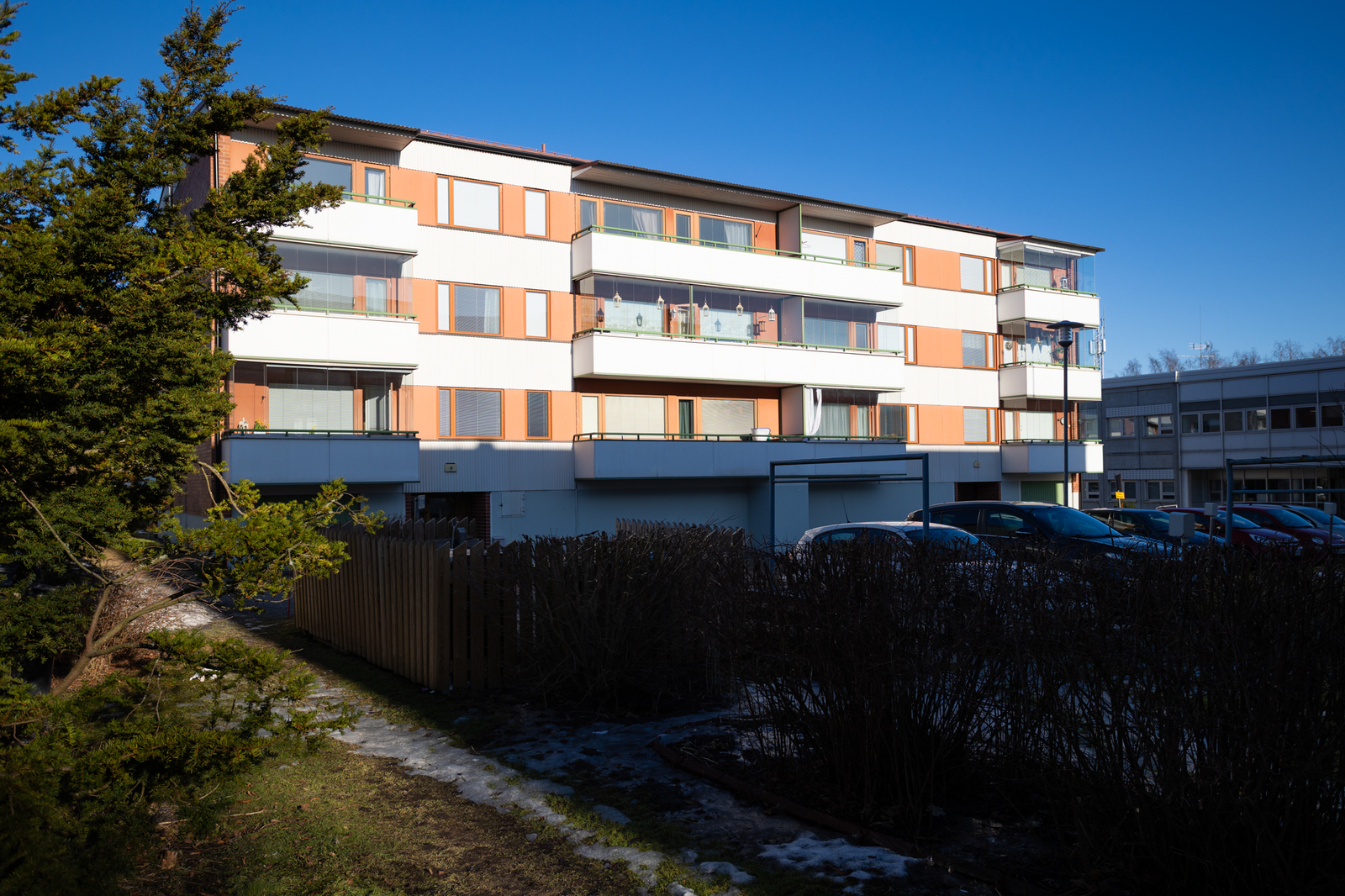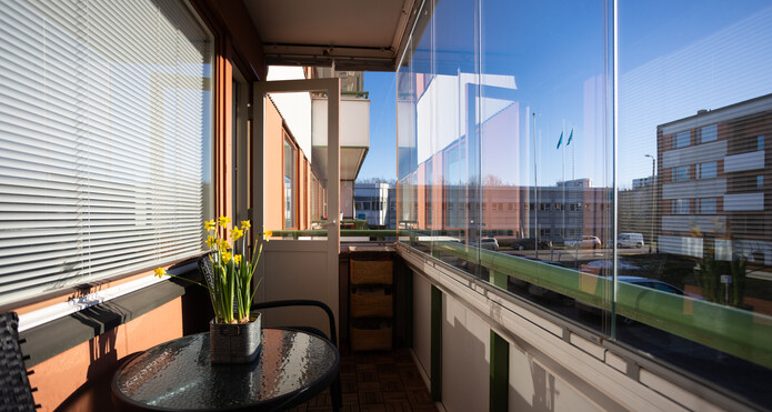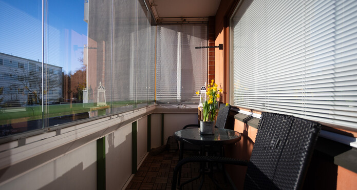 Balkongen öppnar sig mot sydväst och erbjuder ett trevligt ställe för samvaro och för att njuta av solen. Till lägenheten hör en motorvärmarplats.