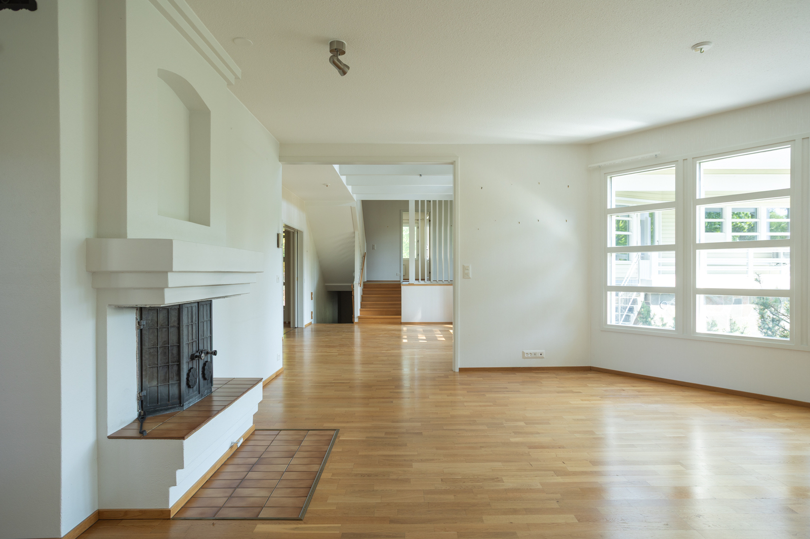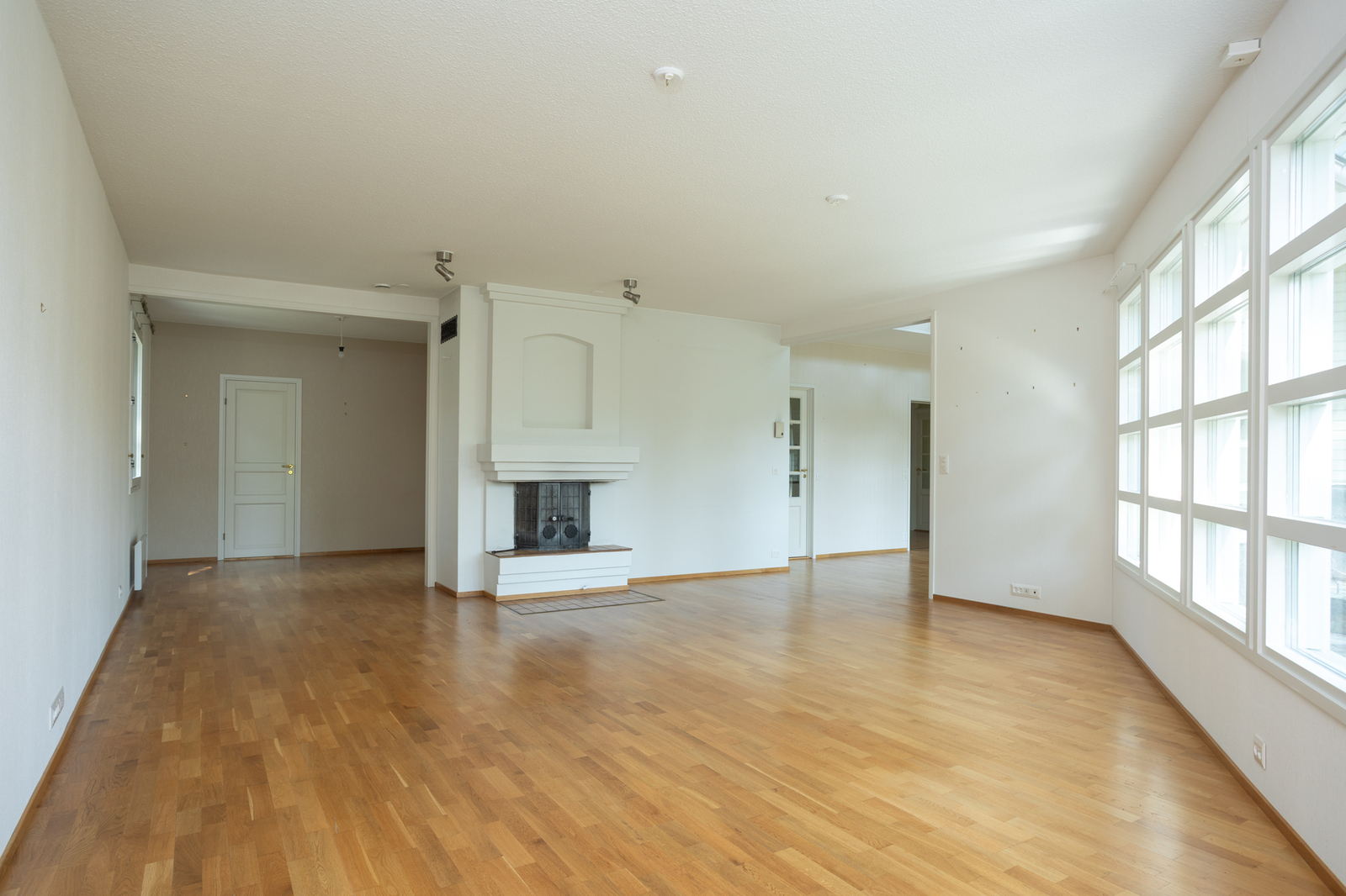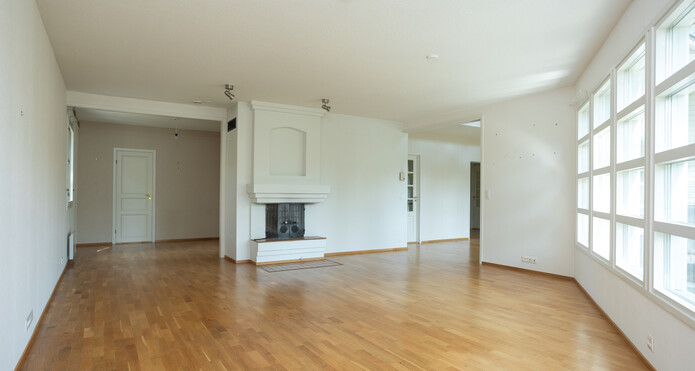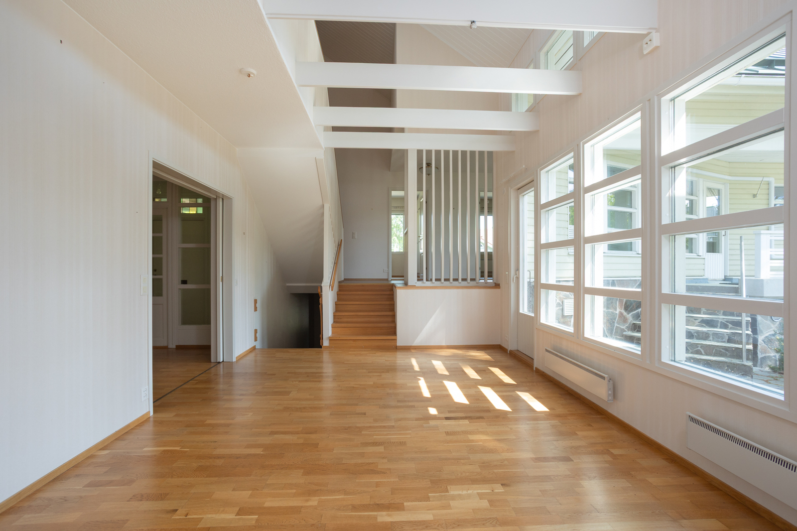 Lisäksi keittiön kyljessä on huone ruokailuun tai työhuoneeksi. Olohuone on iso ja sinne suorastaan tulvii valoa korkeista ikkunoista. Talvi-iltoina on mukava istua takkatulen ääressä viettäen yhteistä aikaa.