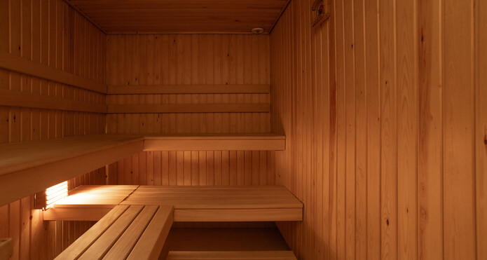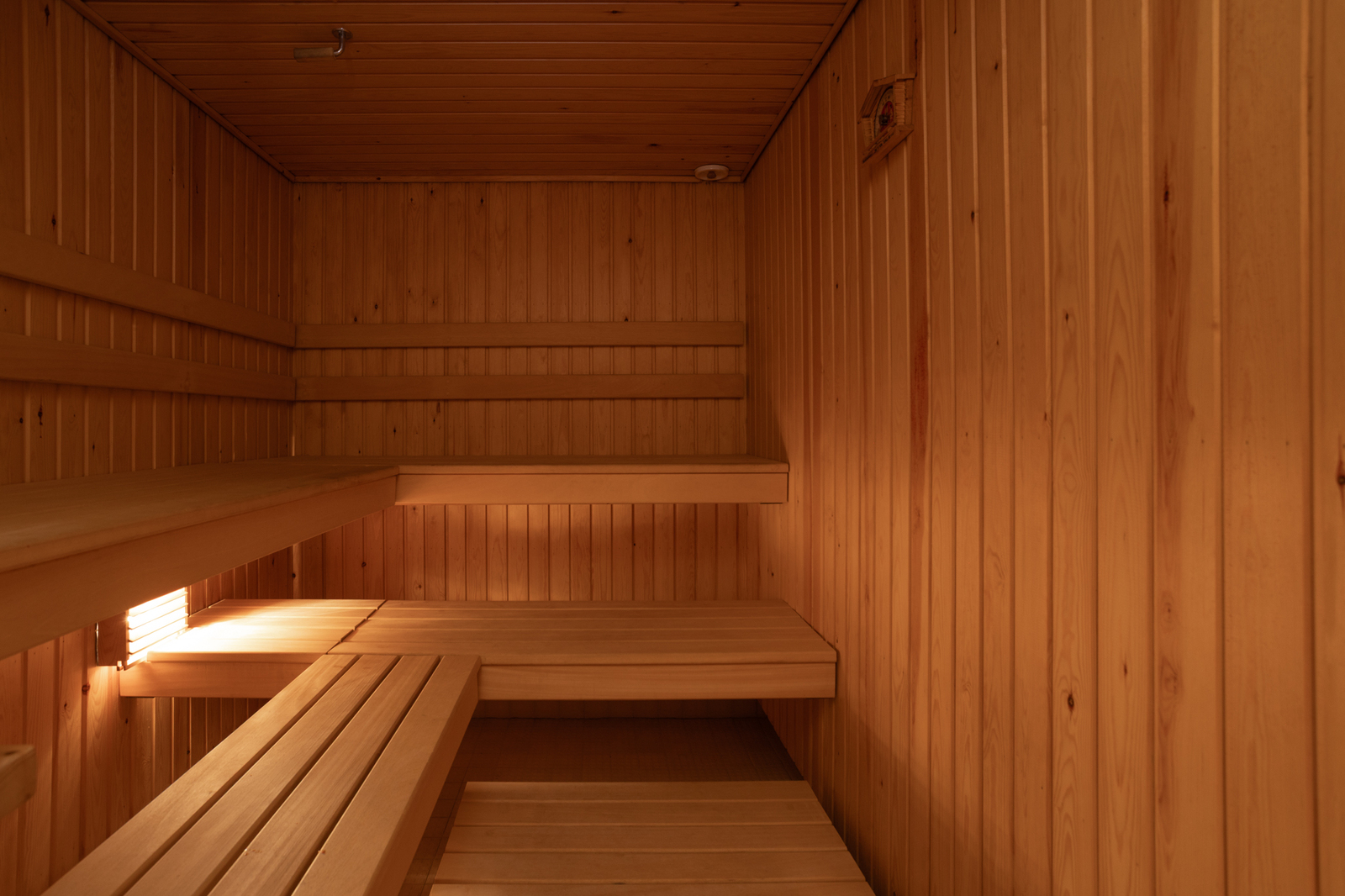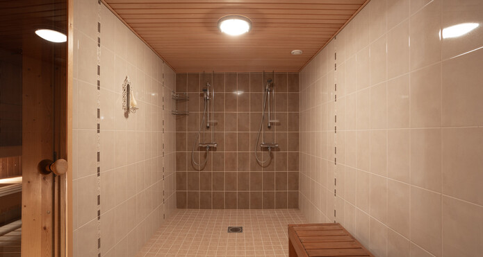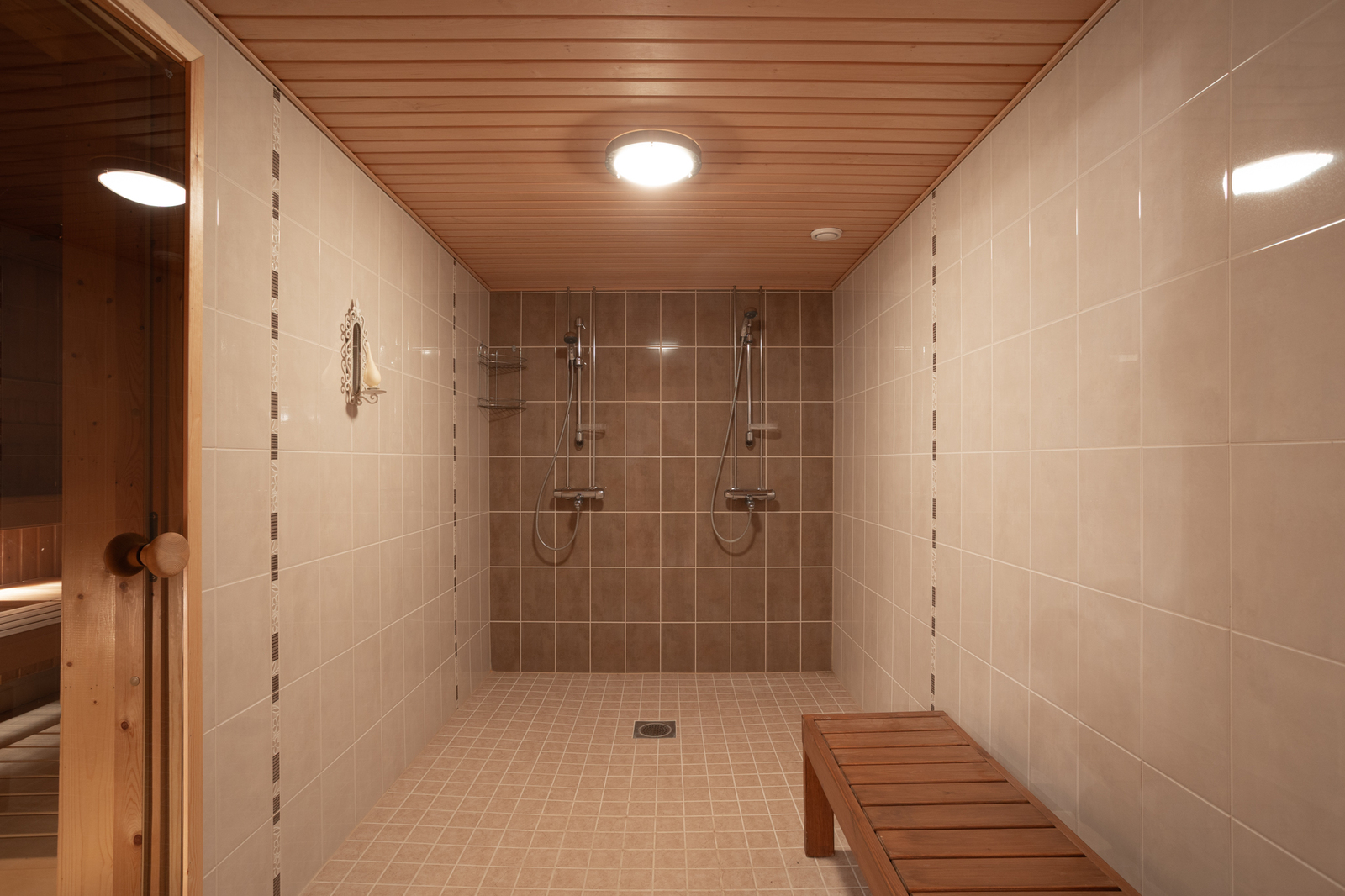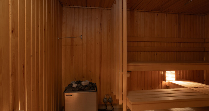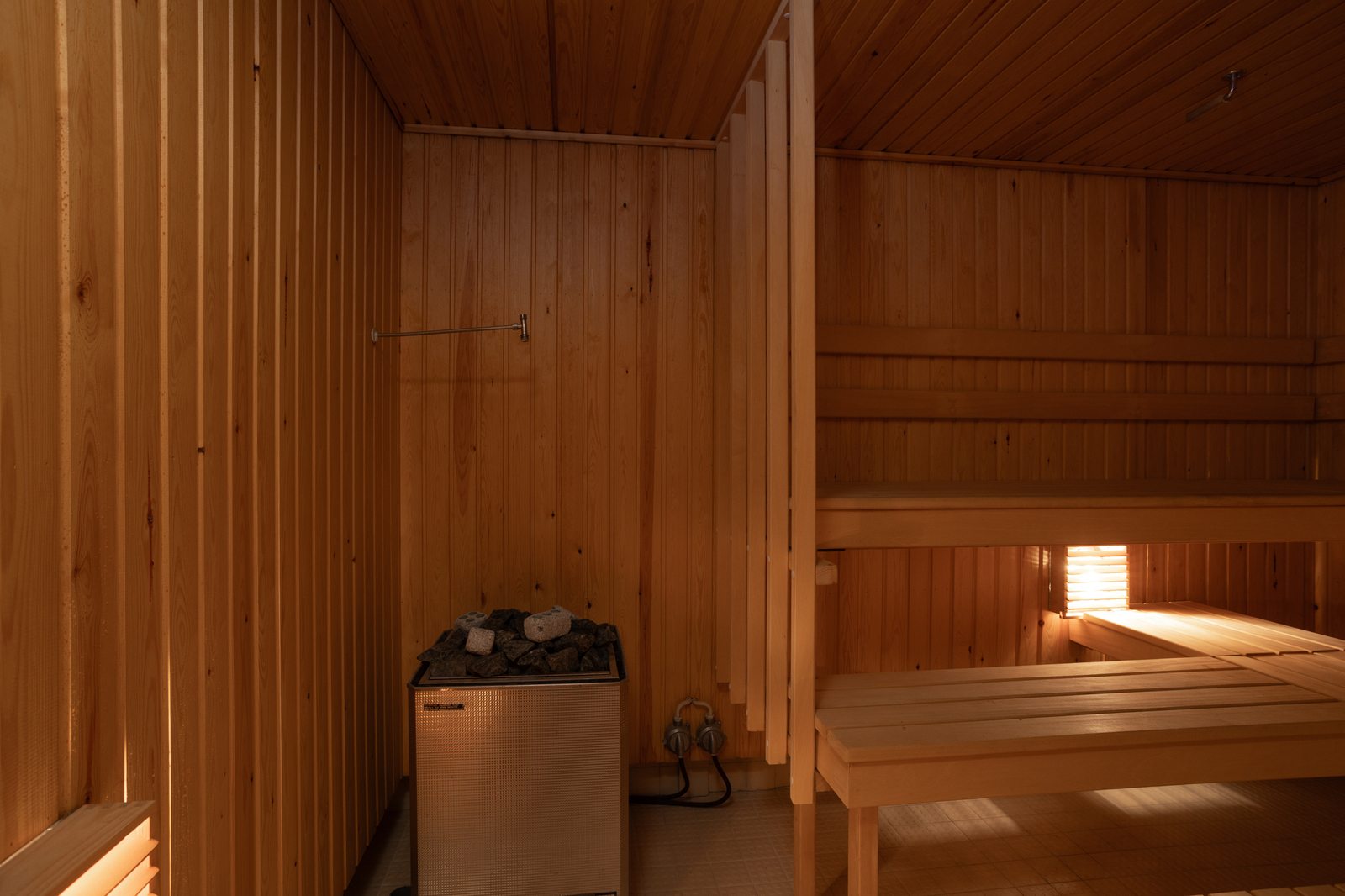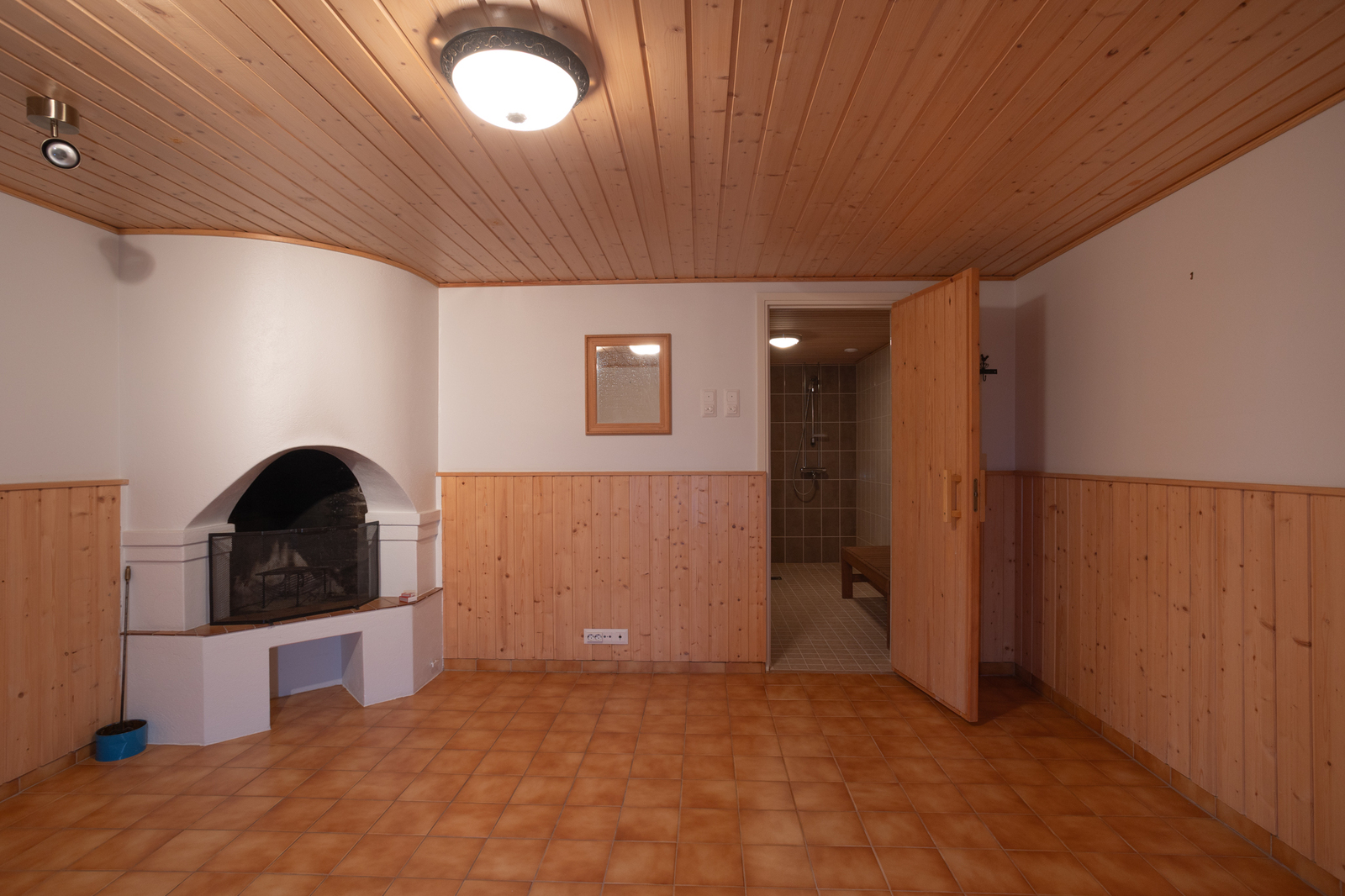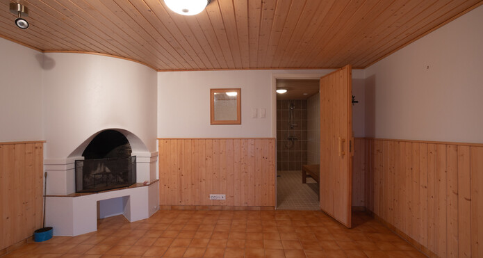 Bastuavdelningen är verkligt rymlig. Efter bastun är det härligt att sitta och koppla av i sällskapsrummet framför den öppna spisen.