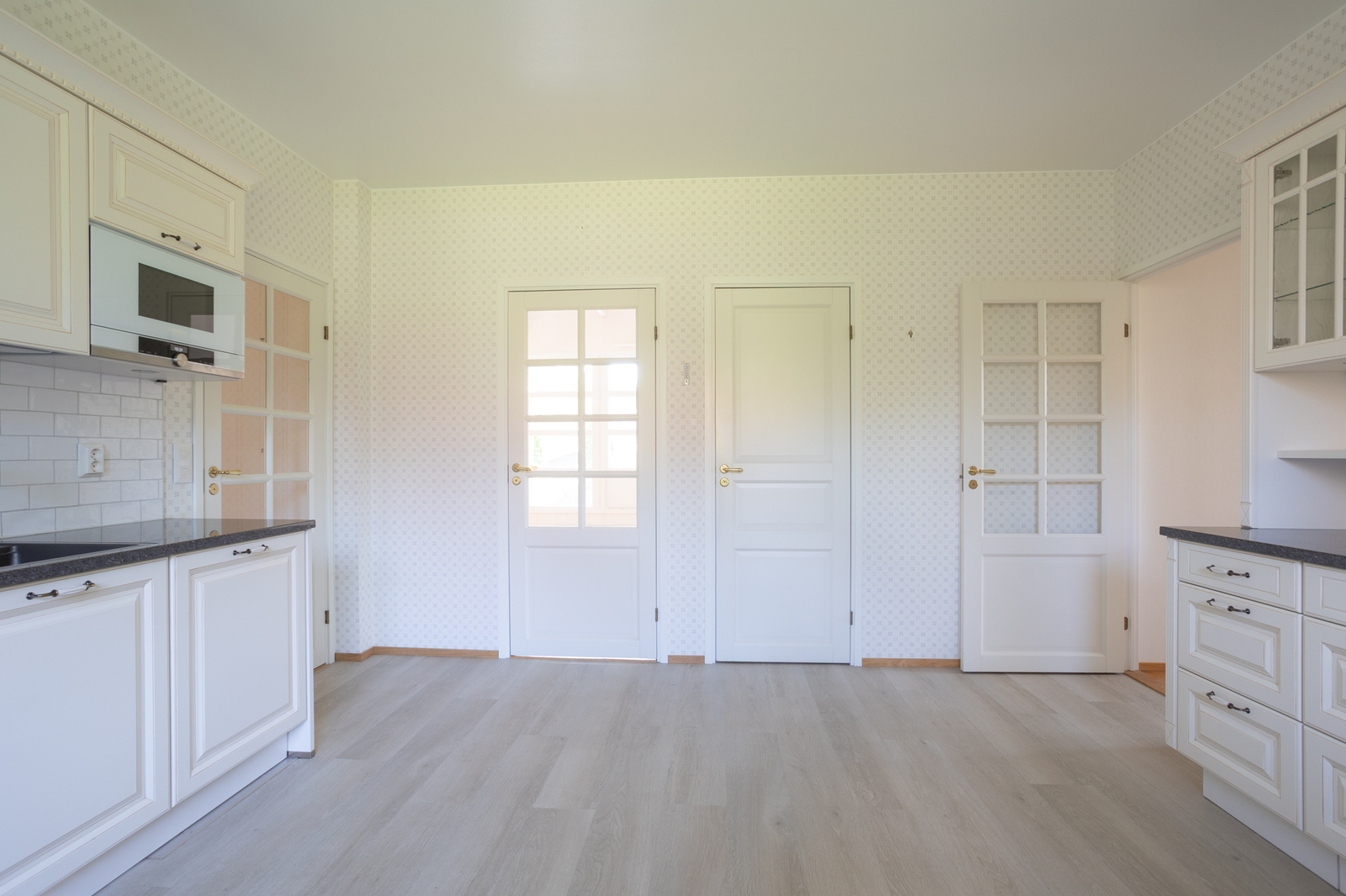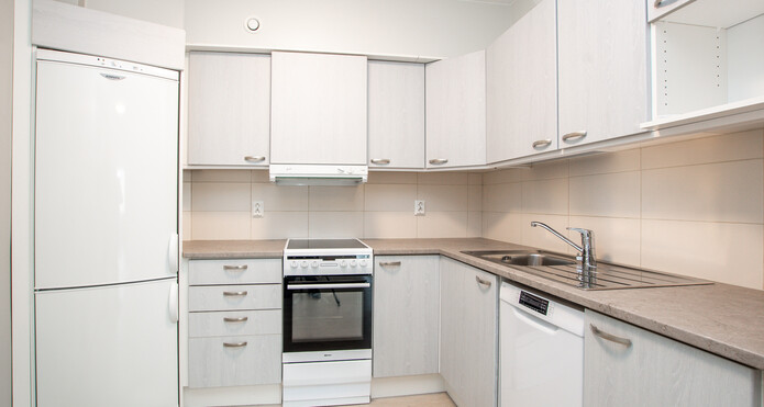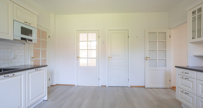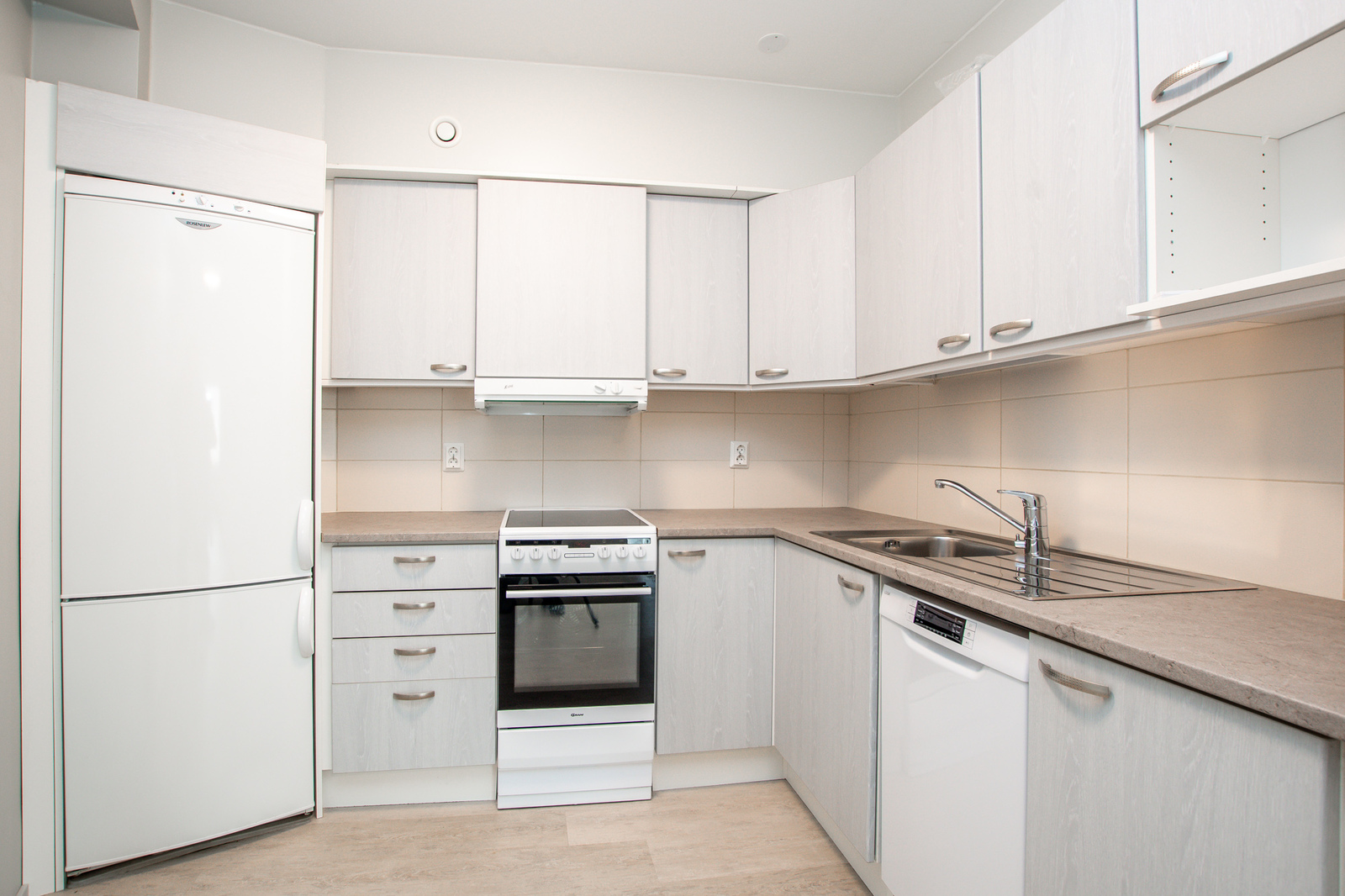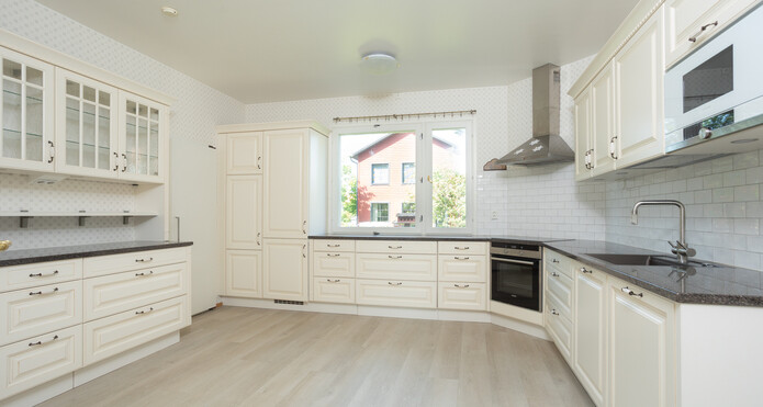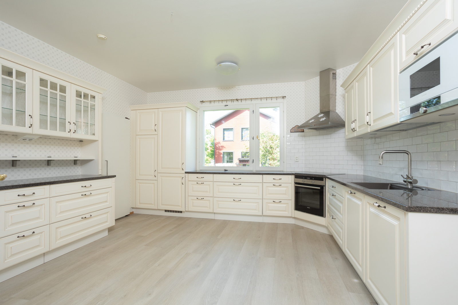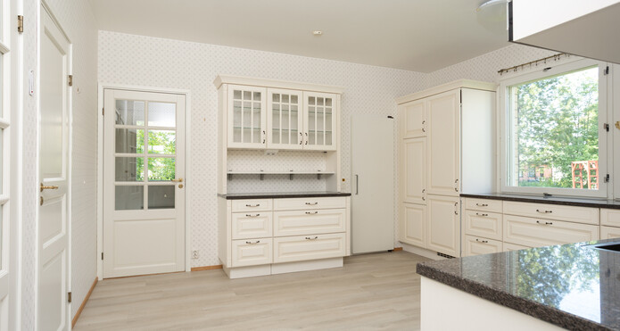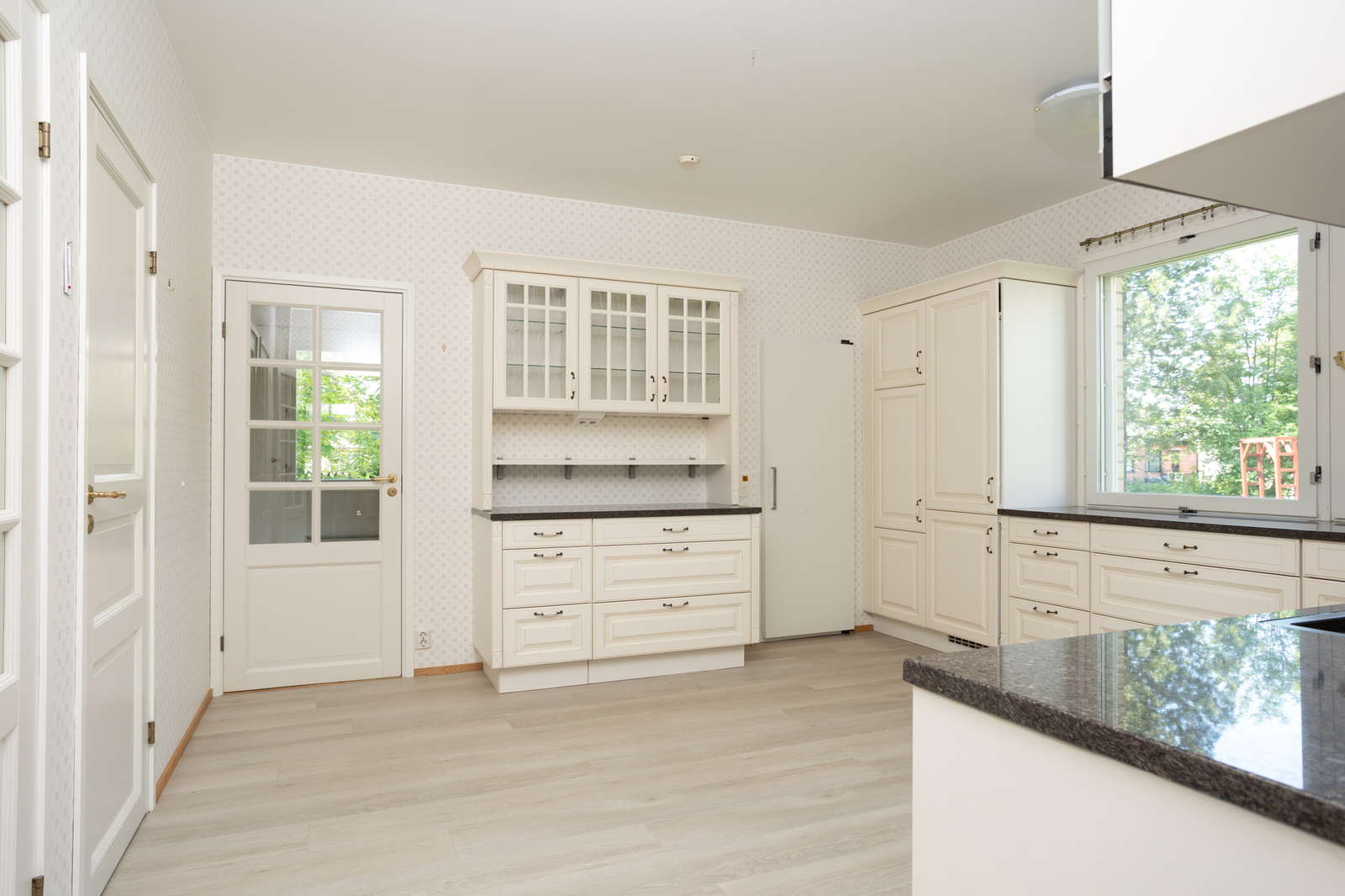 Asuinkerroksessa on vaalea ja kodikas vuonna 2017 uusittu Noblessa keittiö kivitasoilla. Keittiössä on talon toinen kylmiö, joten isompienkin juhlien ruuat mahtuvat sutjakkaasti viileään.