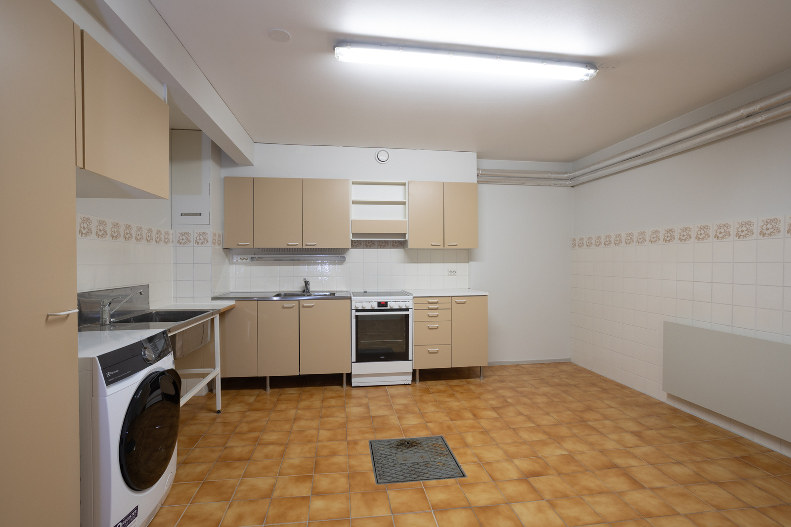 Kellarikerroksessa on iso kodinhoitohuone, jossa saa näppärästi talven hillot keitettyä ja pyykin huollettua. Tässäkin kerroksessa on talon toinen kylmiö sekä erillinen wc.