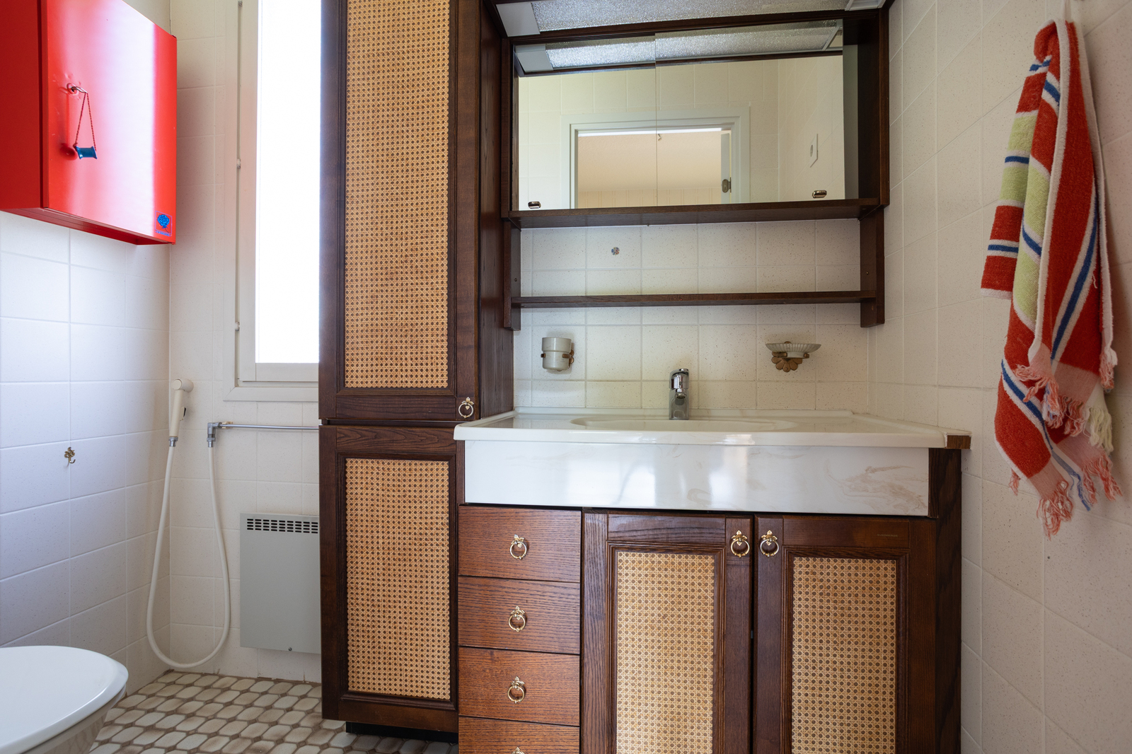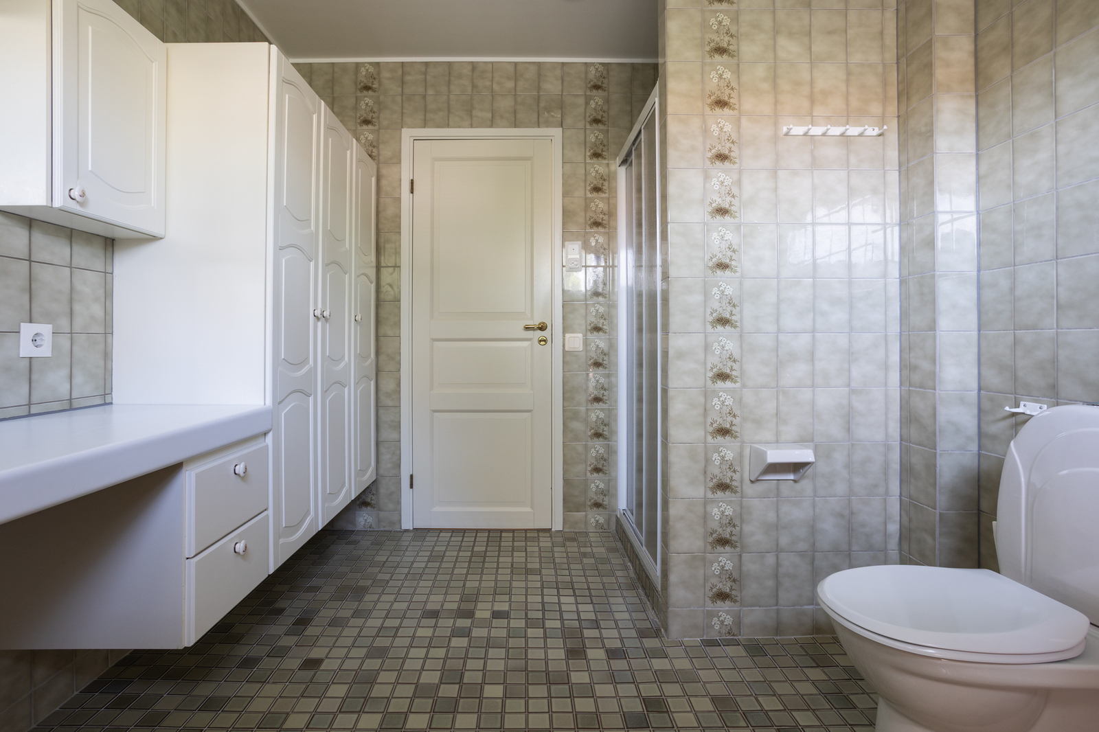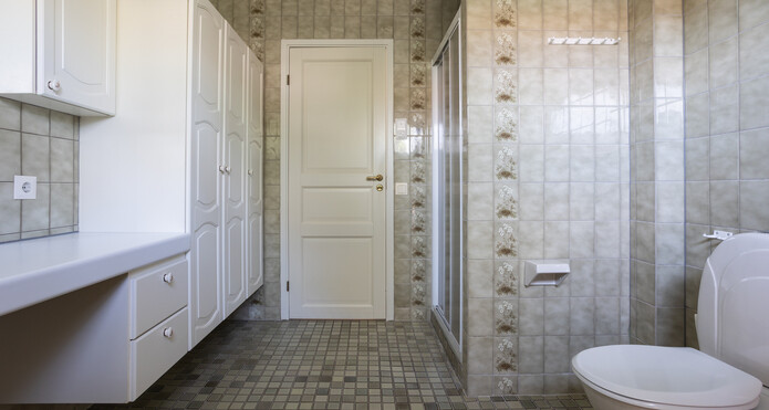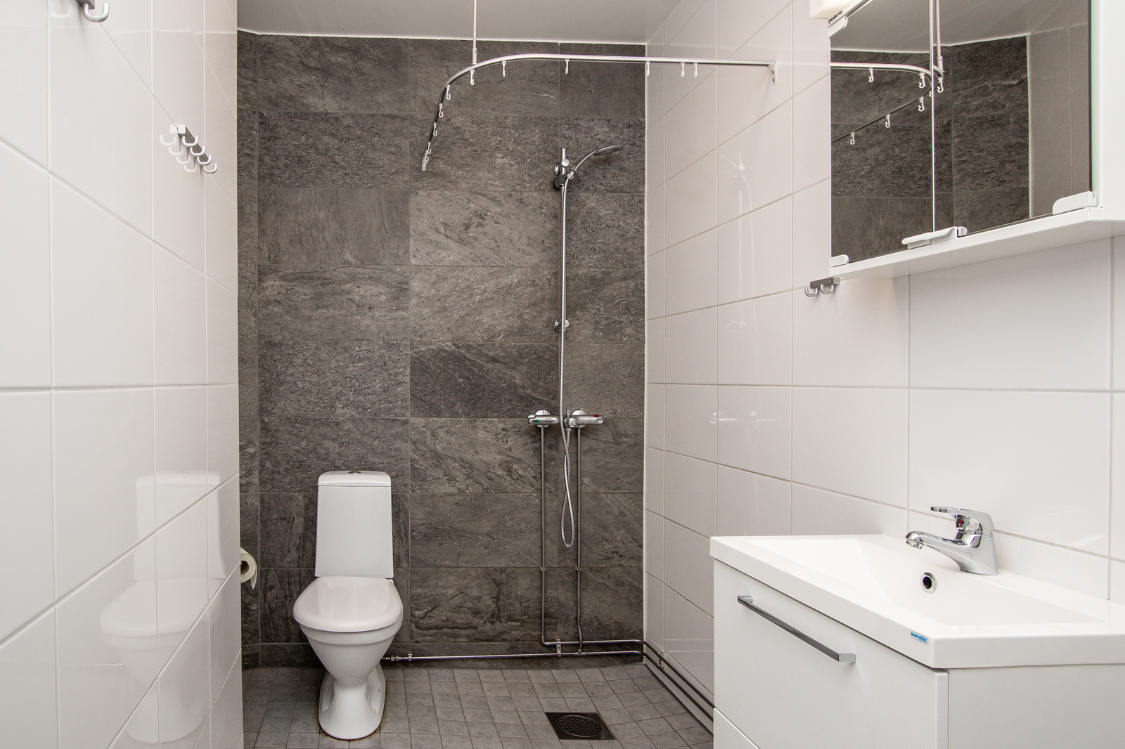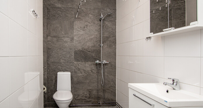 Asuinkerroksen kylpyhuoneessa lattia klinkkeri ja seinät kaakeli. Kylpyhuoneessa wc-istuin, suihku - ja pidesuihku, peili ja kylpyhuonekaapisto. -