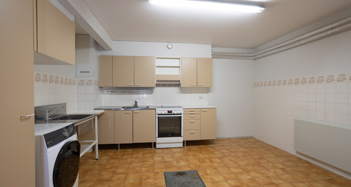 Liesi ja pyykinpesukone. Kodinhoitohuoneessa lattiakaivo, jossa pumppu joka pumppaa veden kellarikerroksen saunasta ja suihkusta. Kodinhoitotilassa lämminvesivaraaja. -