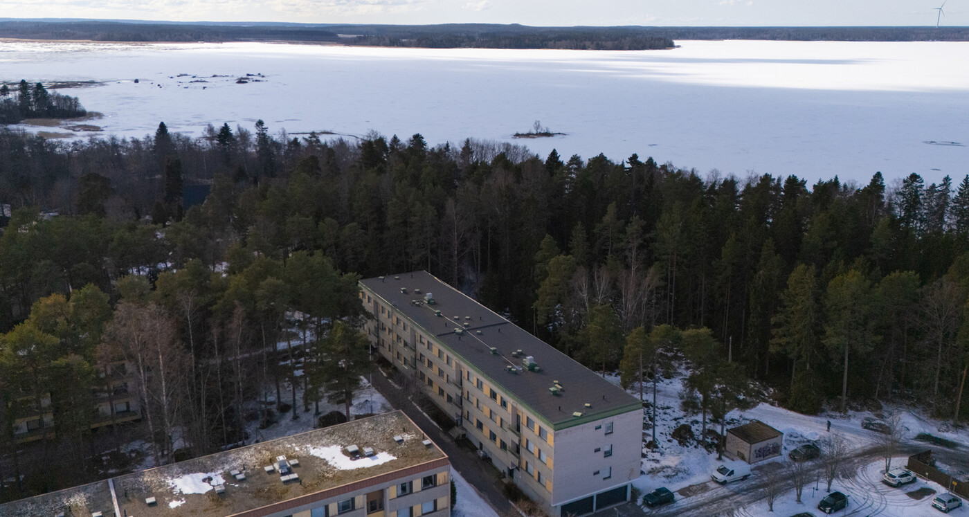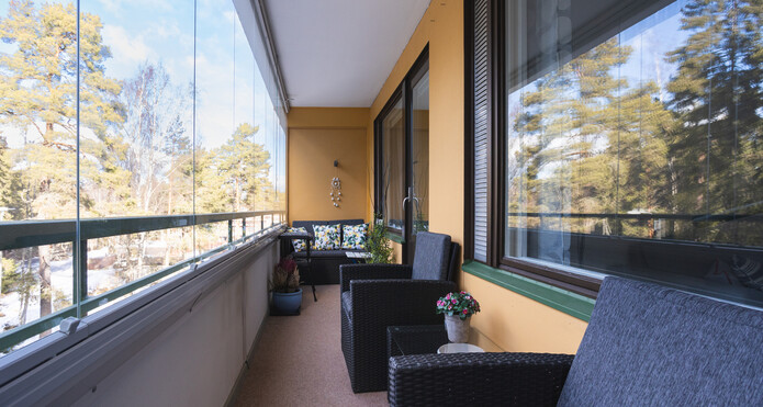 UtsikterHuoneistosta metsäiset näkymät leveältä lännenpuoleiselta lasitetulta parvekkeelta. Olohuoneen ja kahden makuuhuoneen ikkunat länteen. Keittiö ja yksi makuuhuoneista itään.