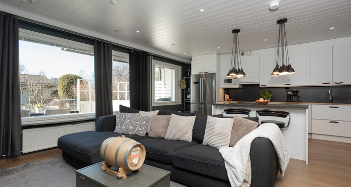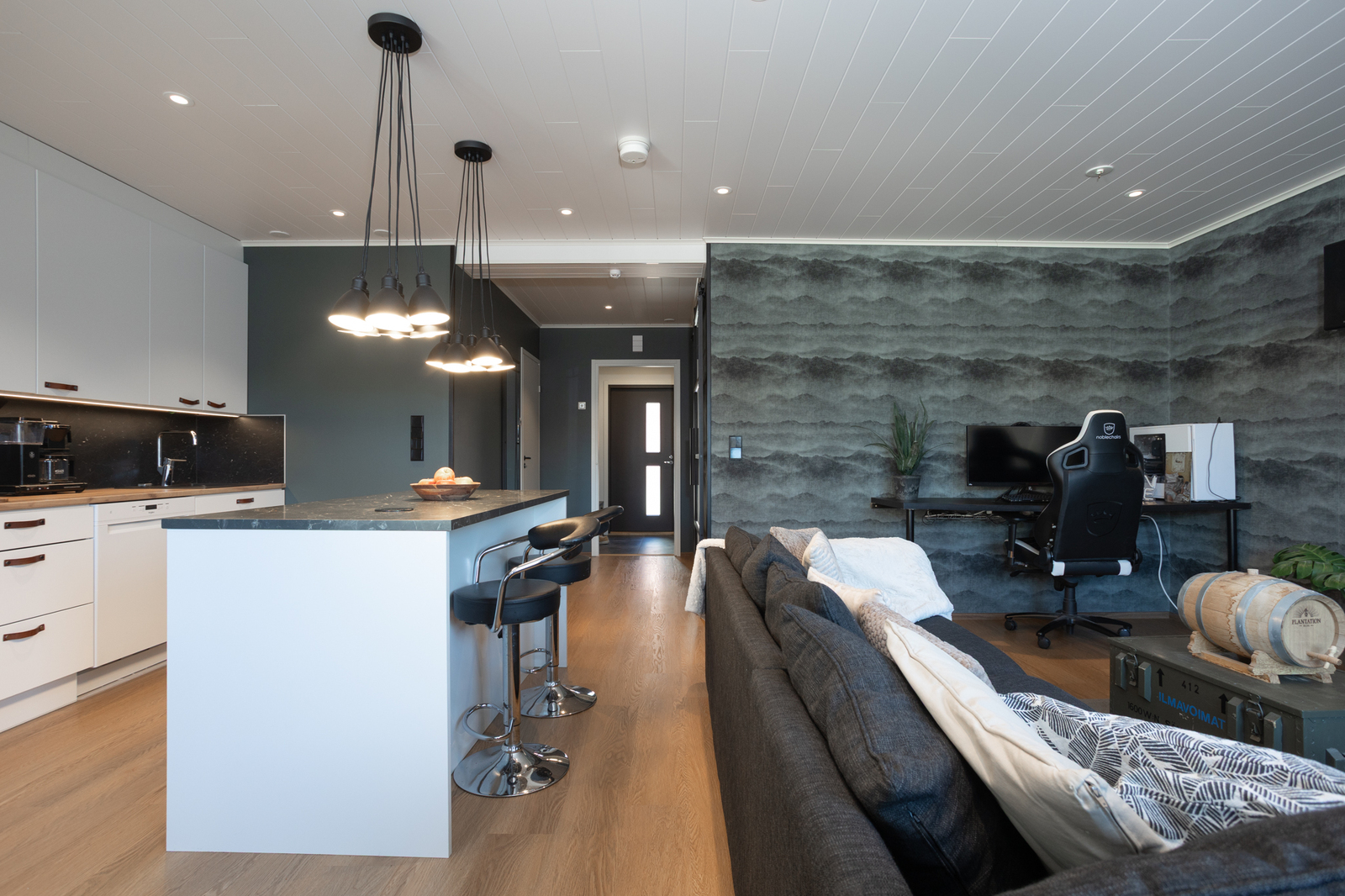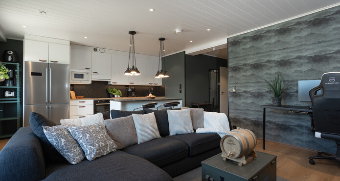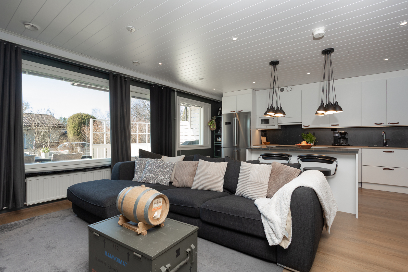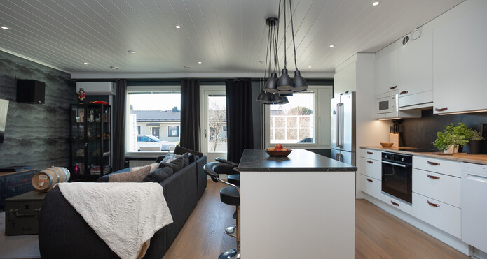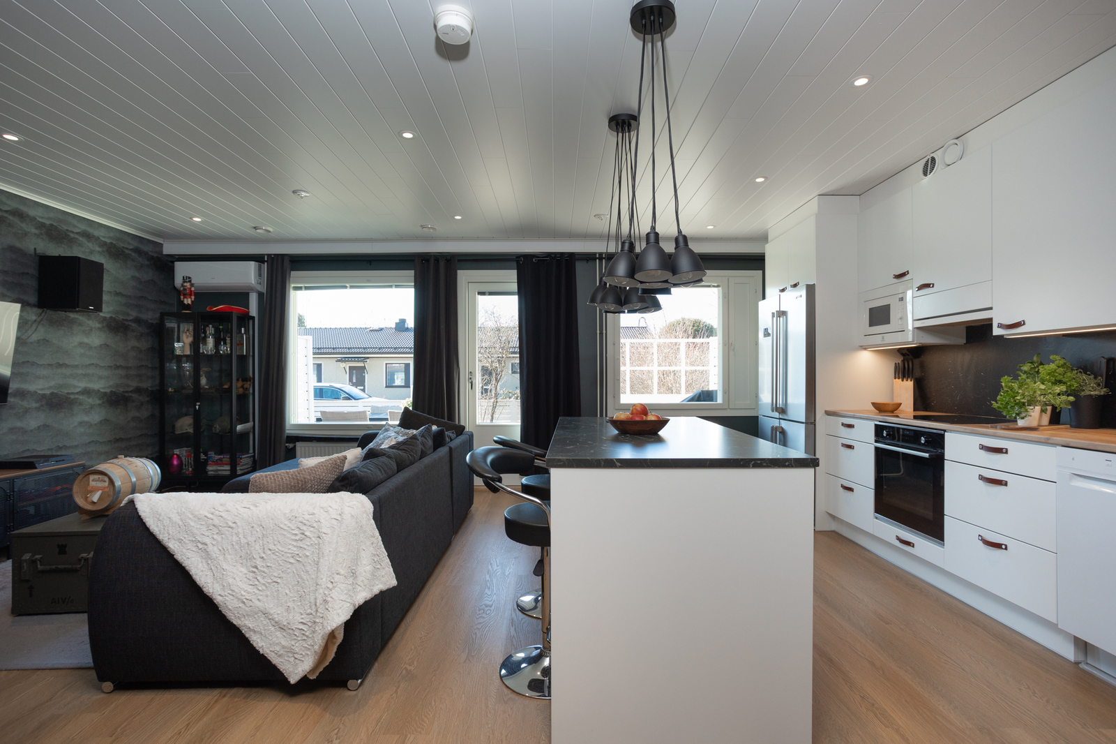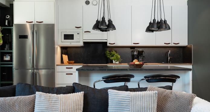 Keittiö on raikkaan vaalea, jota korostavat tyylikkäät tummat seinäpinnat.