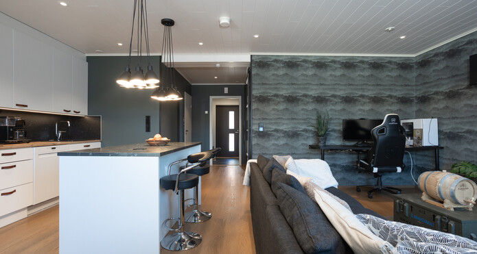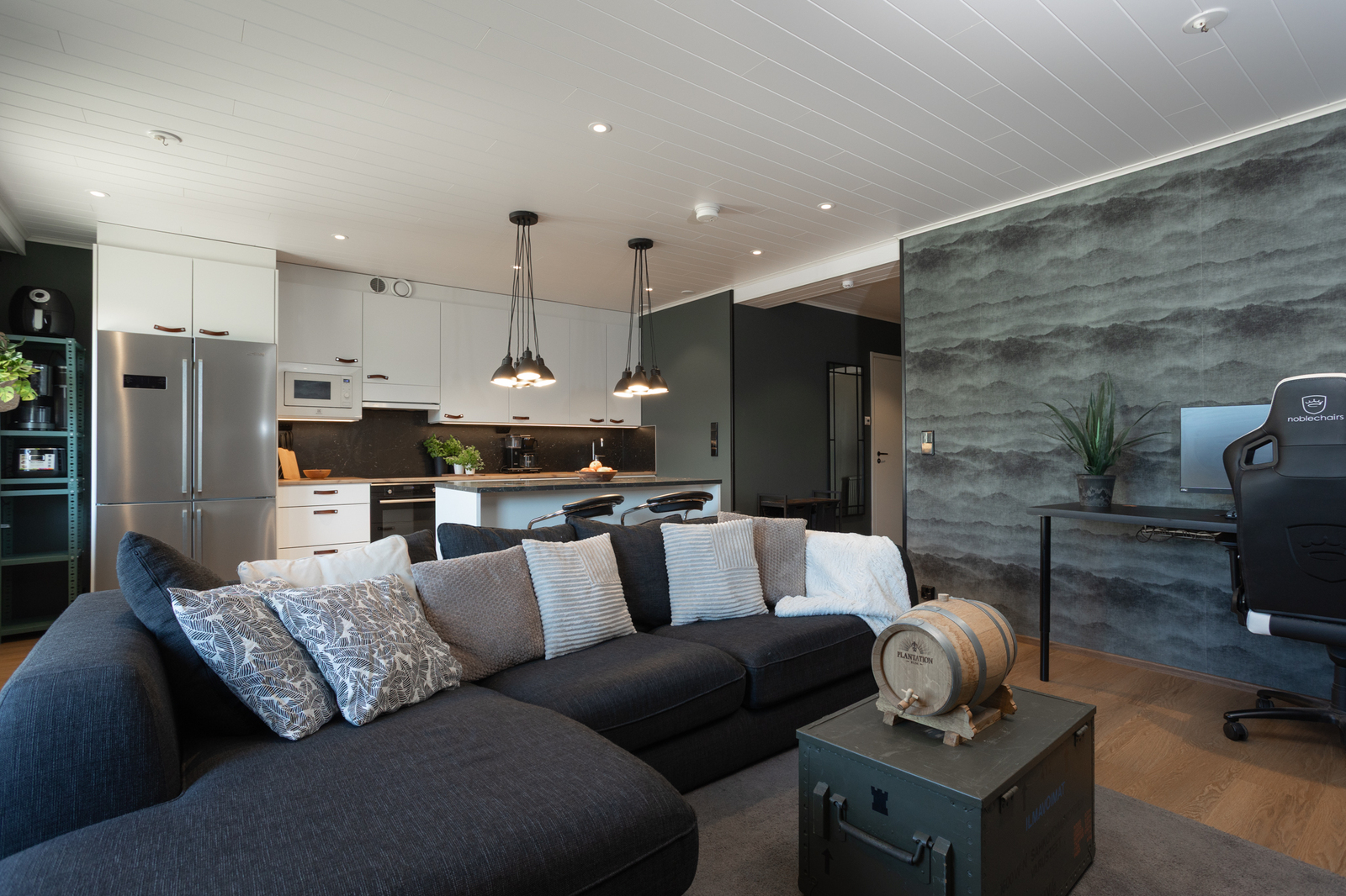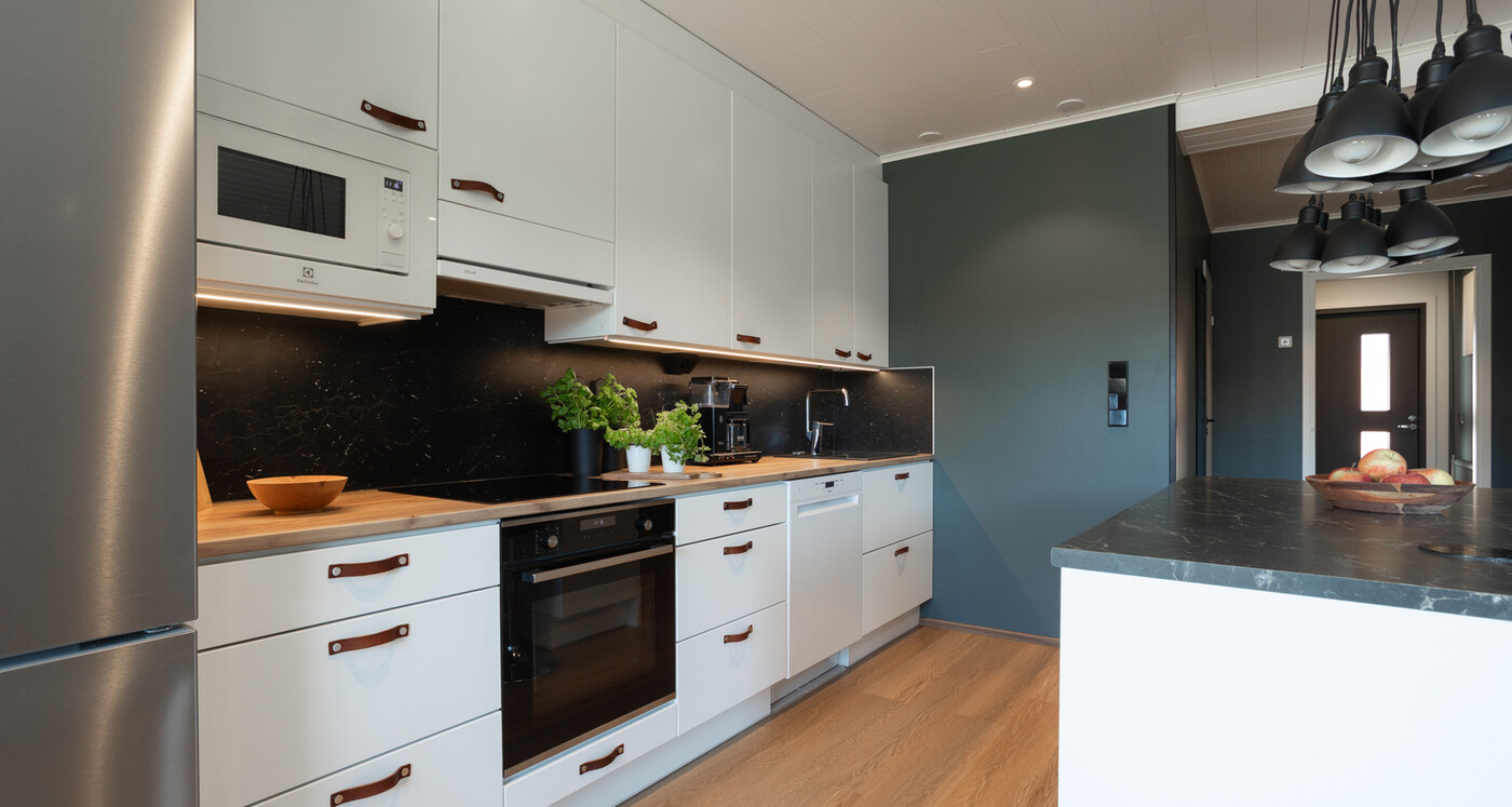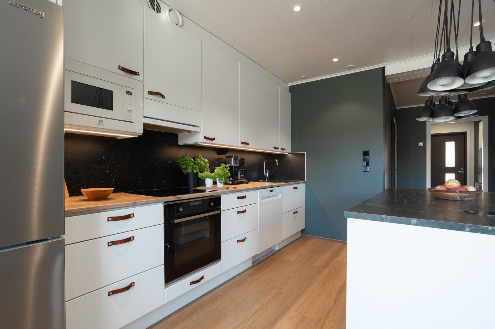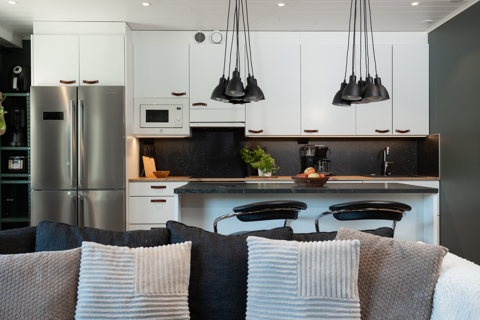 Köket är ljust och fräscht och framhävs av de stilfulla mörka väggytorna.