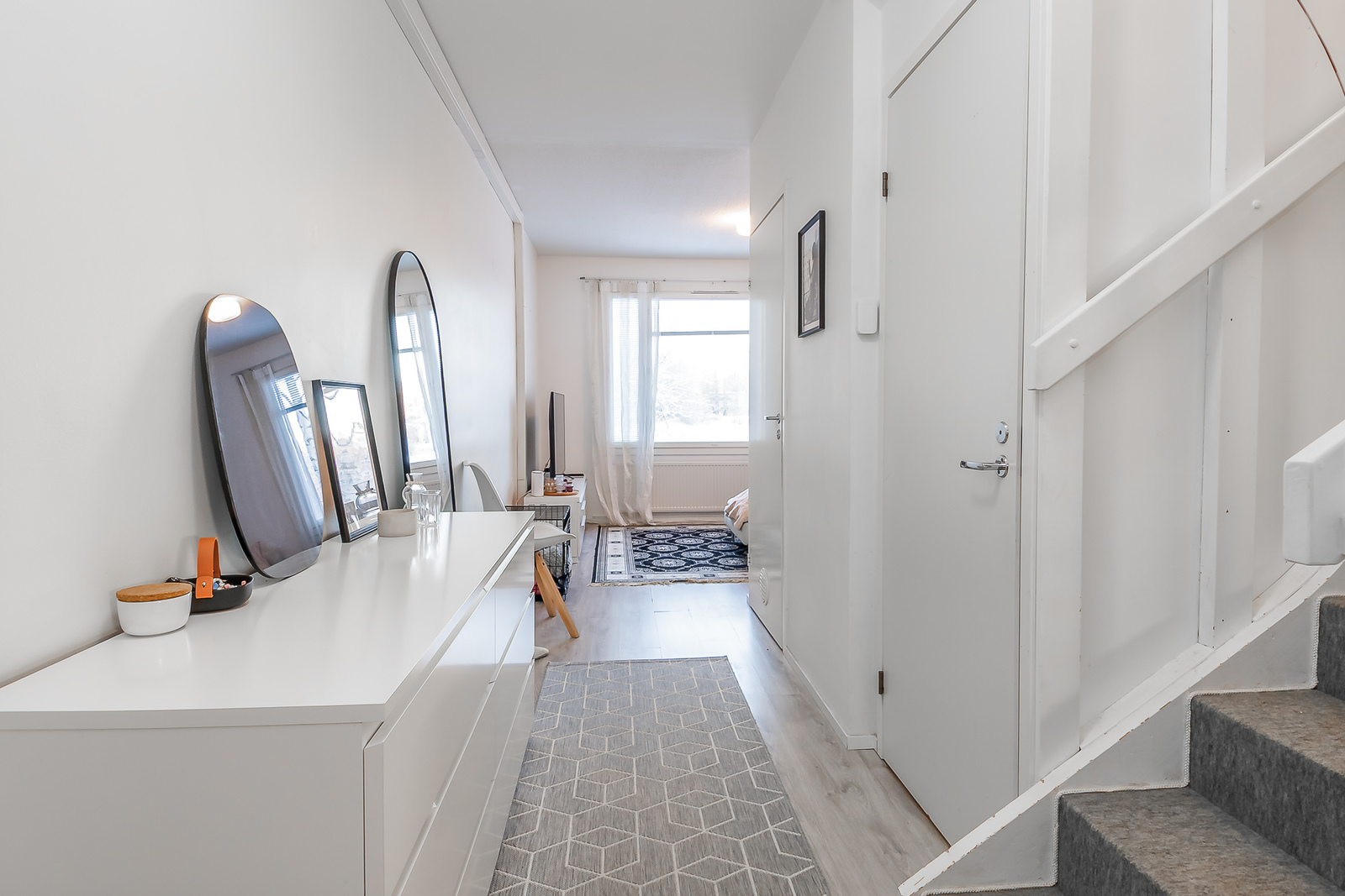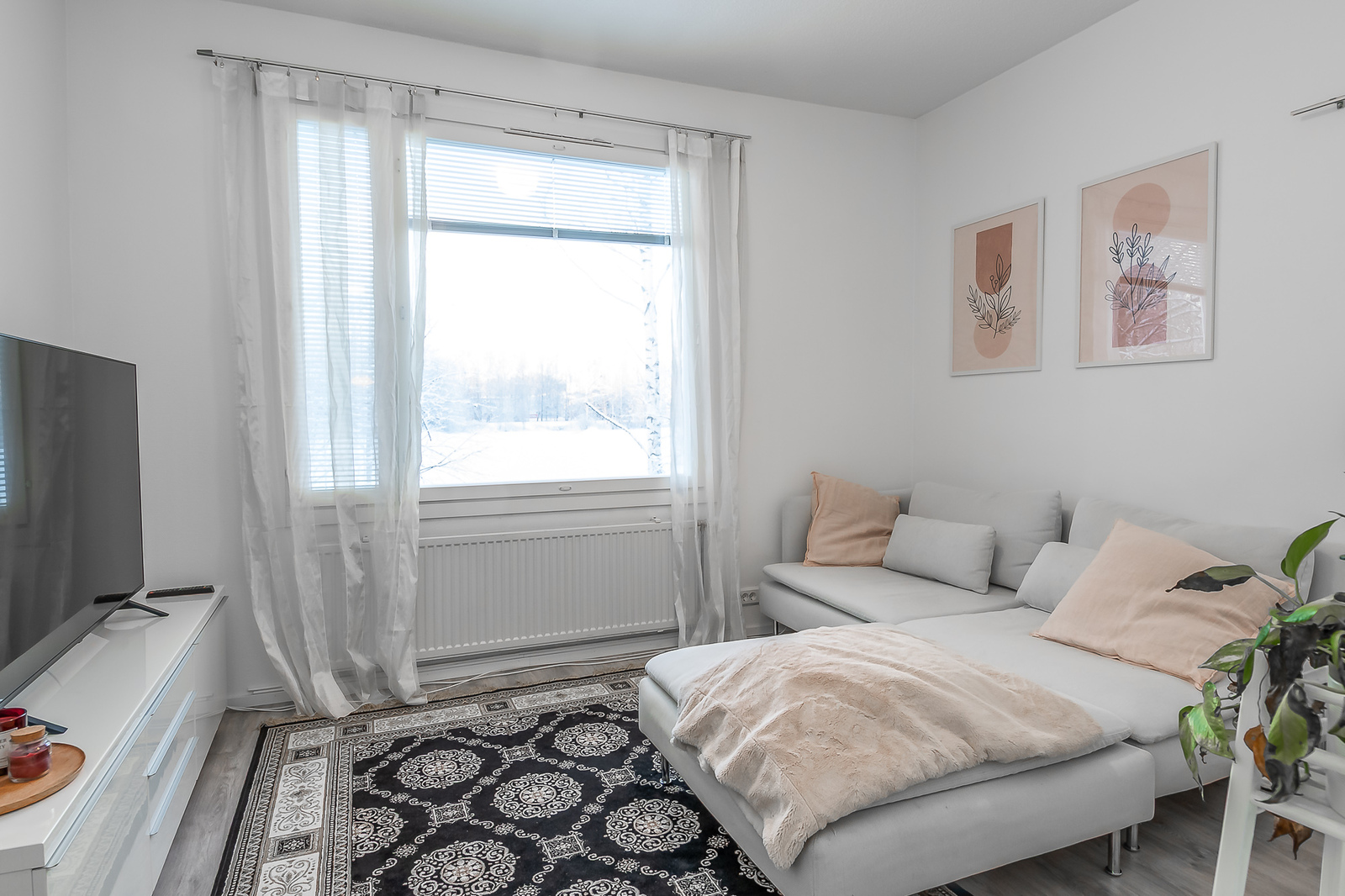 Beskrivning av vardagsrummetLattioissa laminaatti. Seinäpintoja juuri maalattu. Seinät valkoiset.
