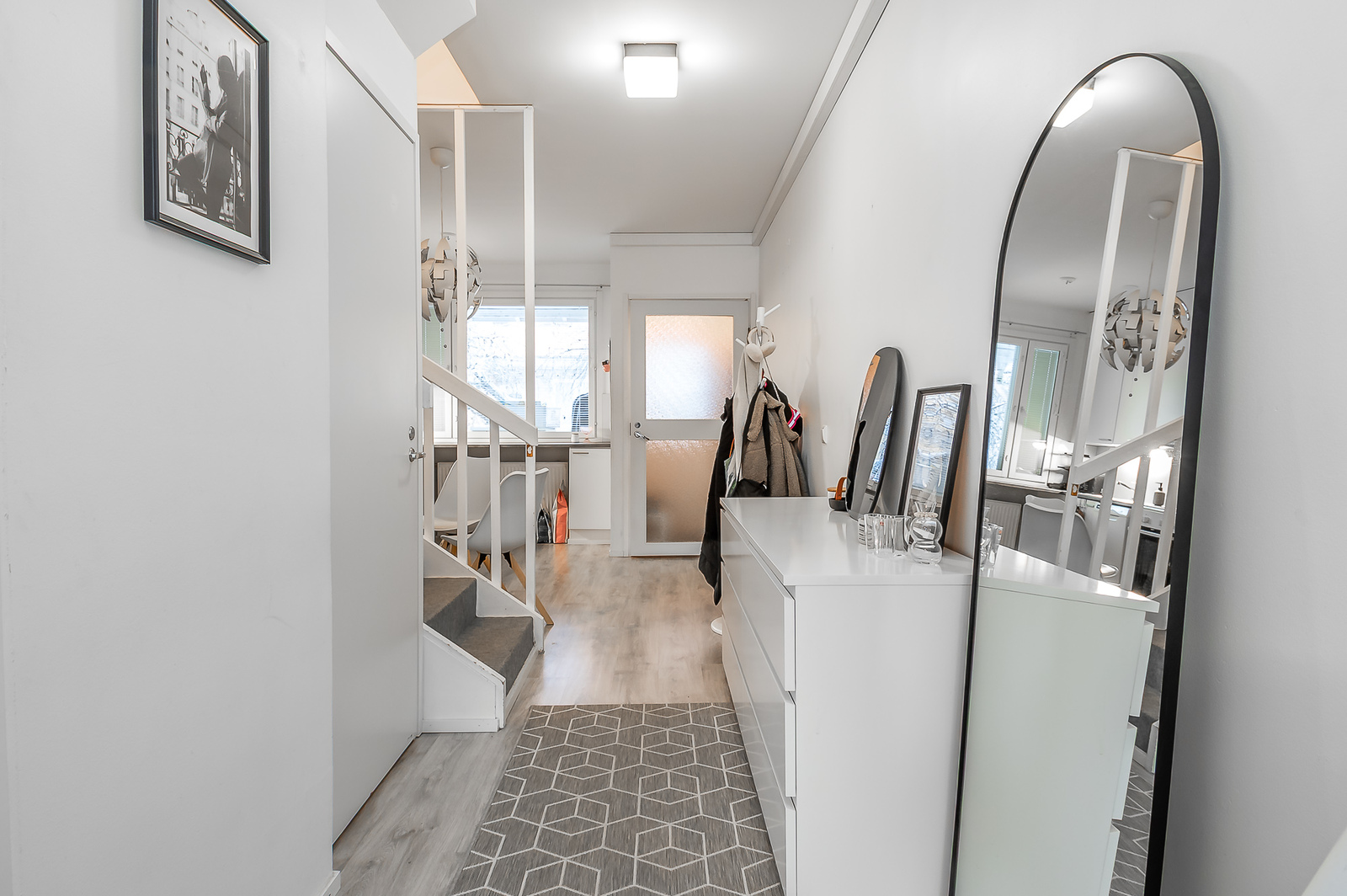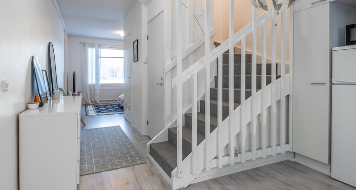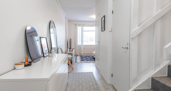 Bostaden har så gott som helrenoverats under de senaste 10 åren. Ytorna har nyligen blivit målade och uppfräschade. Köket har vita skåp och i anslutning till köket finns en matplats med rum för t.ex. en matgrupp för 4 personer. Det finns gott om skåputrymme och avlastningsytor och framför fönstret finns också en bänk, under vilken det ryms barstolar. Vardagsrummet är mycket ljust; alla väggytor är vitmålade och golven är belagda med snyggt planklaminat.