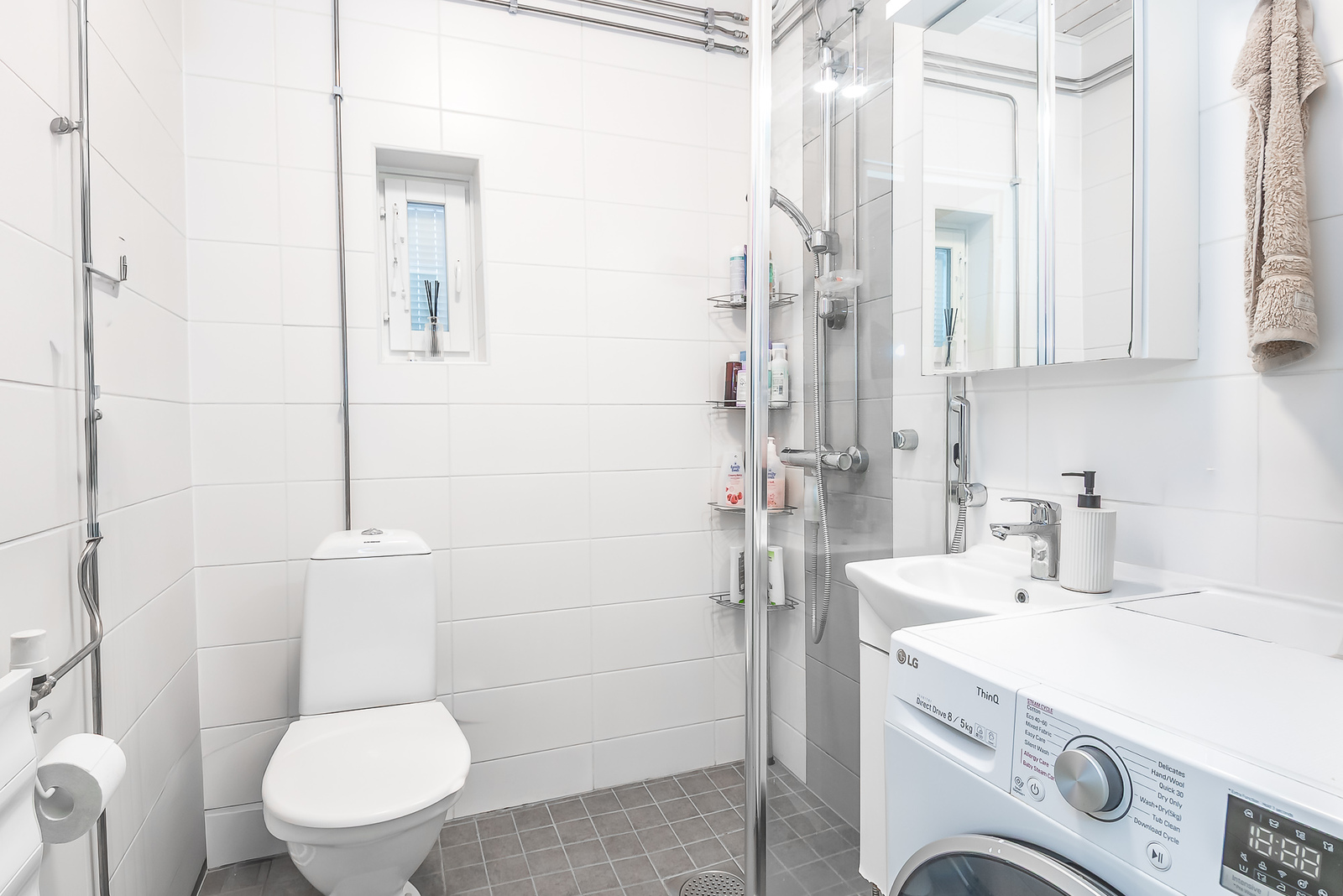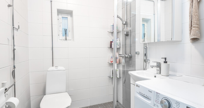 Tyylikäs kylpyhuone on värimaailmaltaan skandinaavisen harmoninen. Suihkunurkka on rajattu suihkuseinämällä ja kylpyhuoneeseen mahtuu pesutorni.