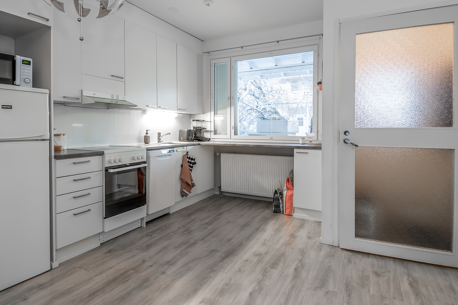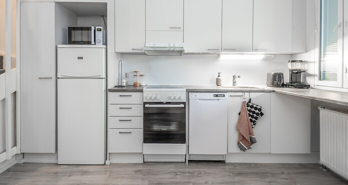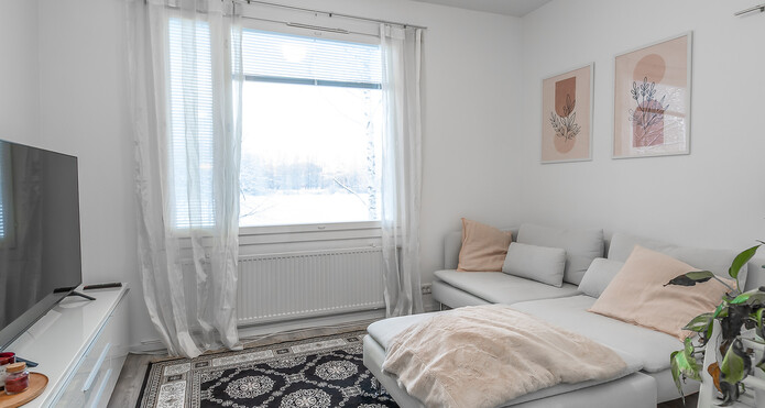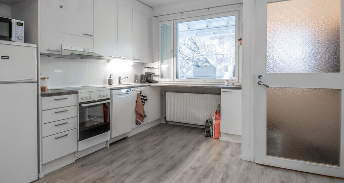 Asunto on lähes täydellisesti remontoitu viimeisen 10 vuoden aikana. Pintoja on juuri maalaamalla raikastettu. Keittiössä on valkoiset kaapistot ja sen yhteydessä on ruokailutila, johon saa helposti mahtumaan esimerkiksi 4 hlön ruokailuryhmän. Kaappi- ja laskutilaa on runsaasti ja ikkunan edessä on myös taso, jonka alle sopii baarijakkarat. Olohuone on todella valoisa; kaikki seinäpinnat ovat valkoisiksi maalatut ja lattioissa on siistit lankkulaminaattilattiat.