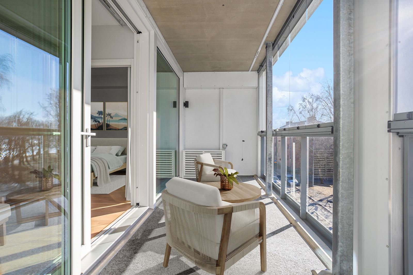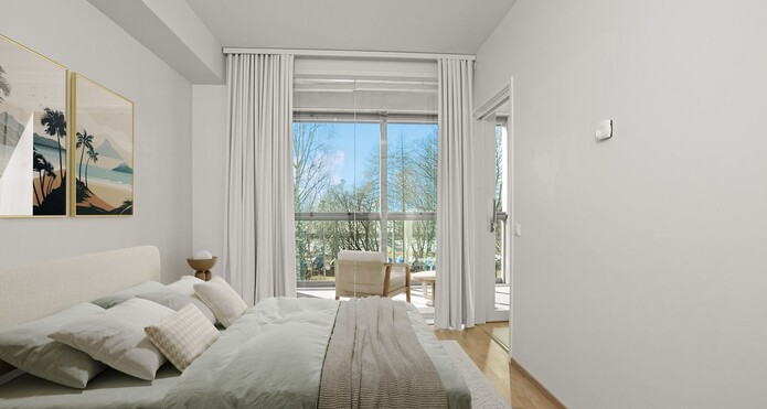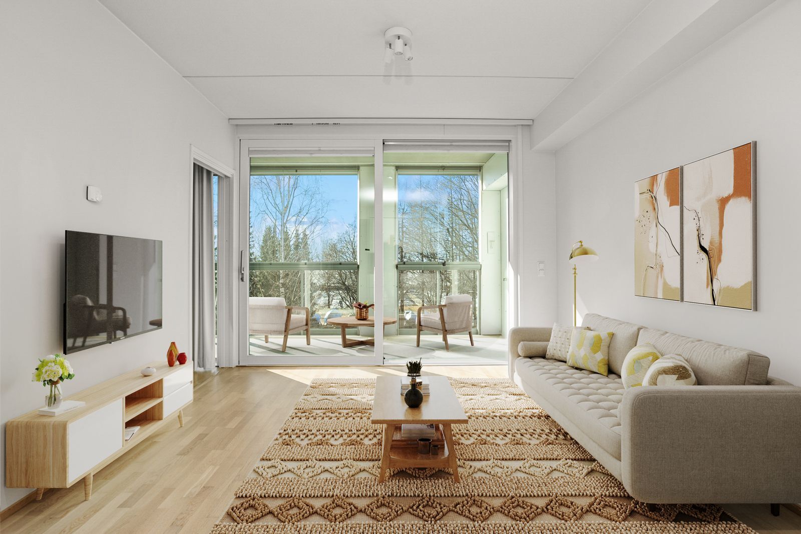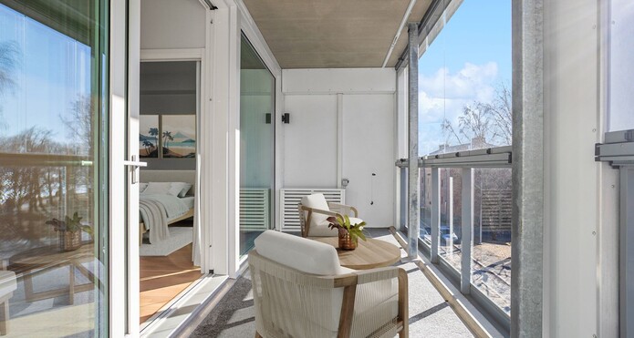 Olohuoneesta kulku lännenpuoleiselle lasitetulle parvekkeelle. -