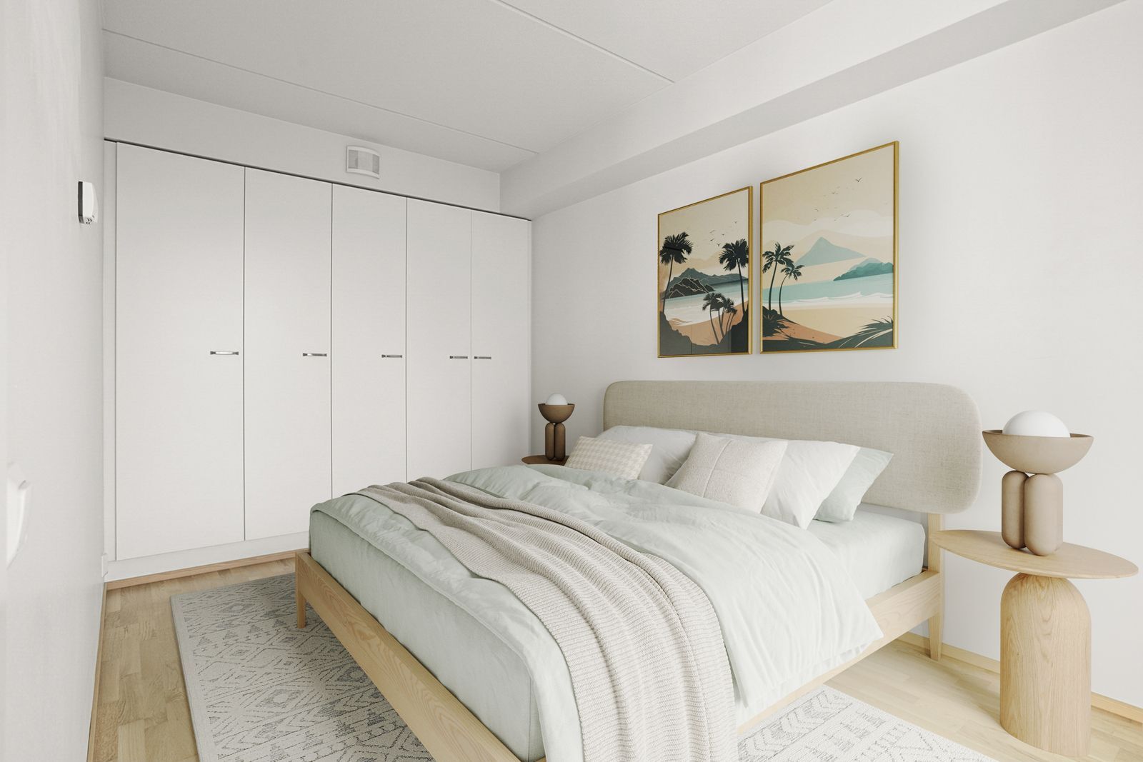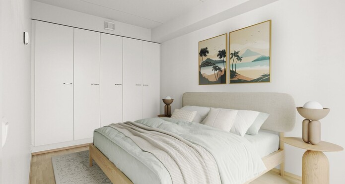 Makuuhuoneessa seinän leveydeltä vaatekaappeja. -
