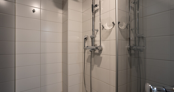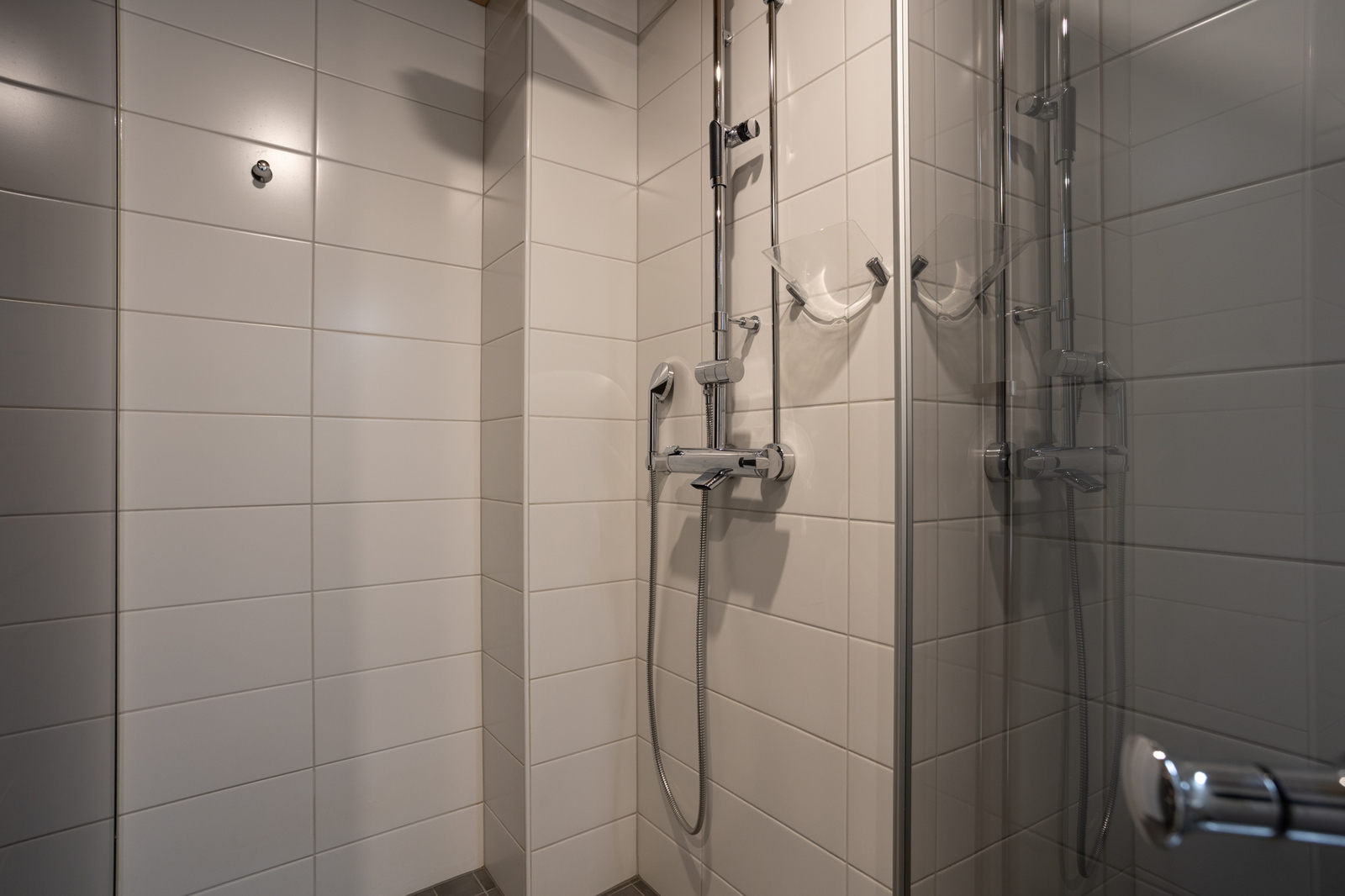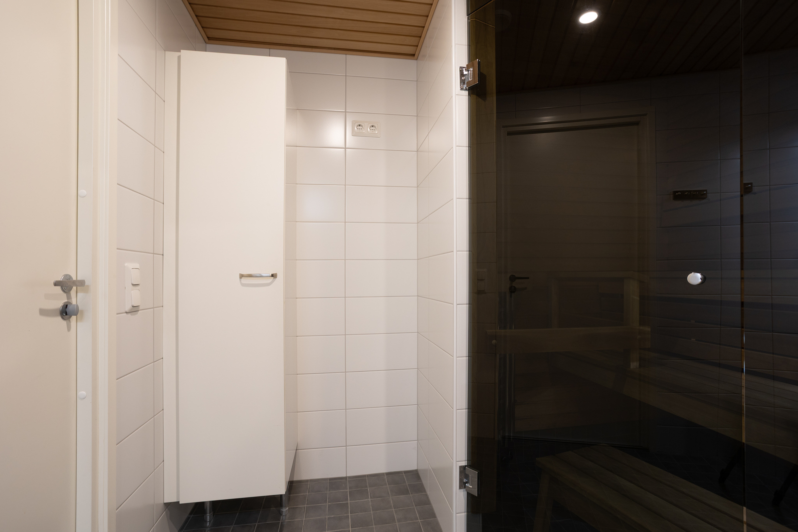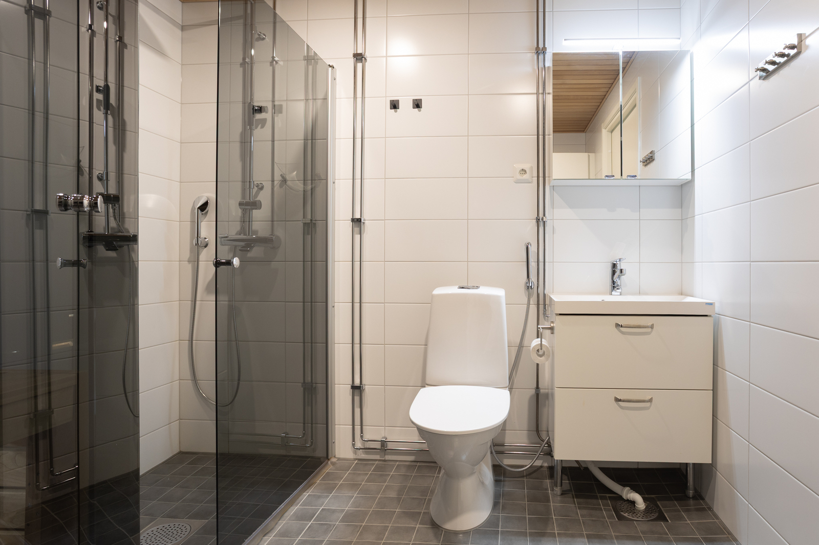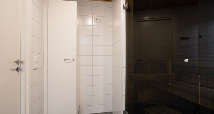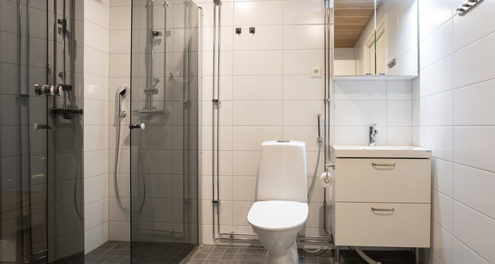 Varusteet: suihkuseinä, pesukoneliitäntä, lattialämmitys, suihku, peilikaappi -