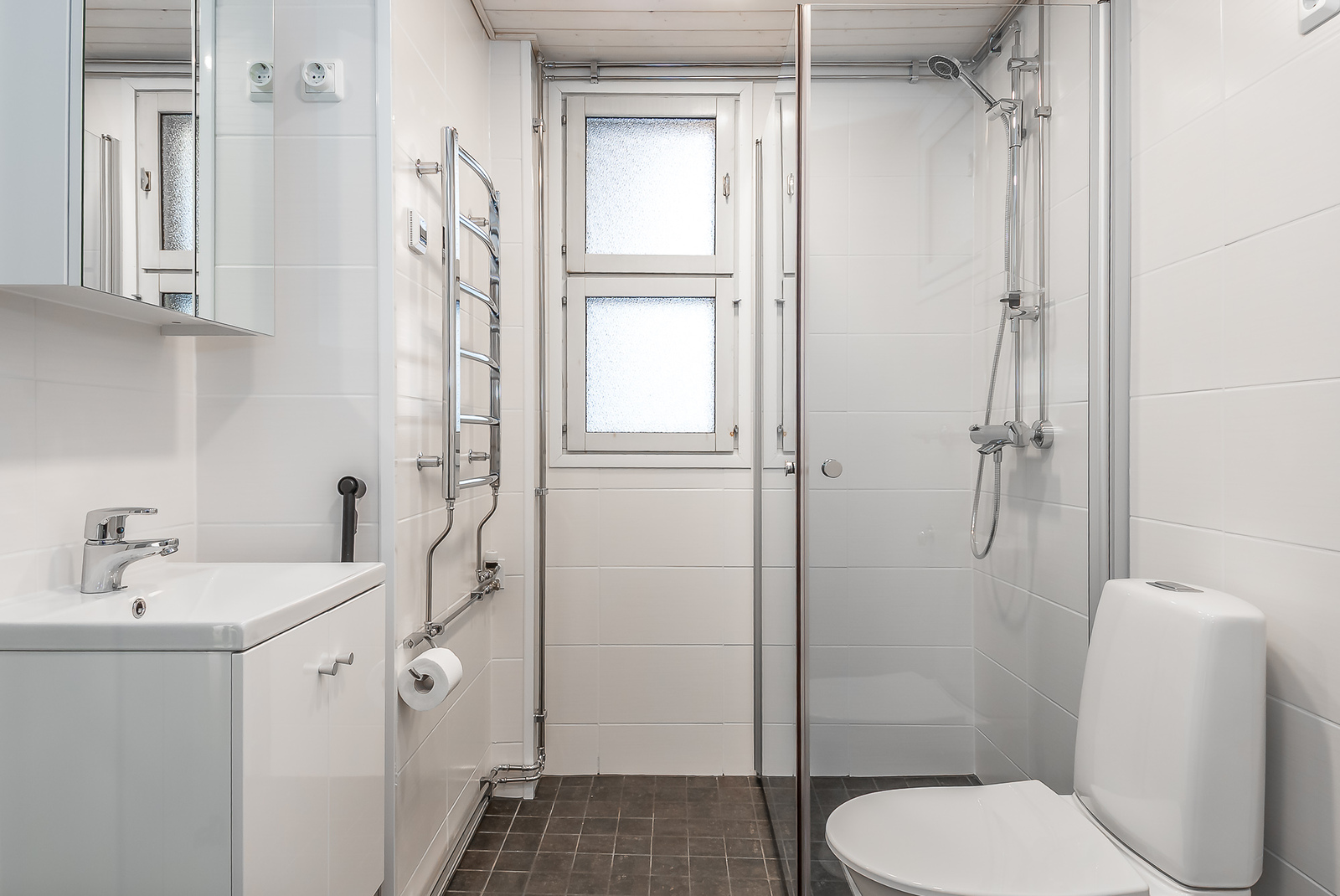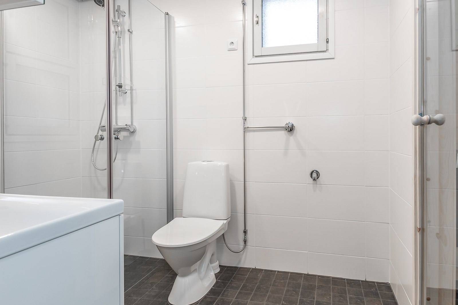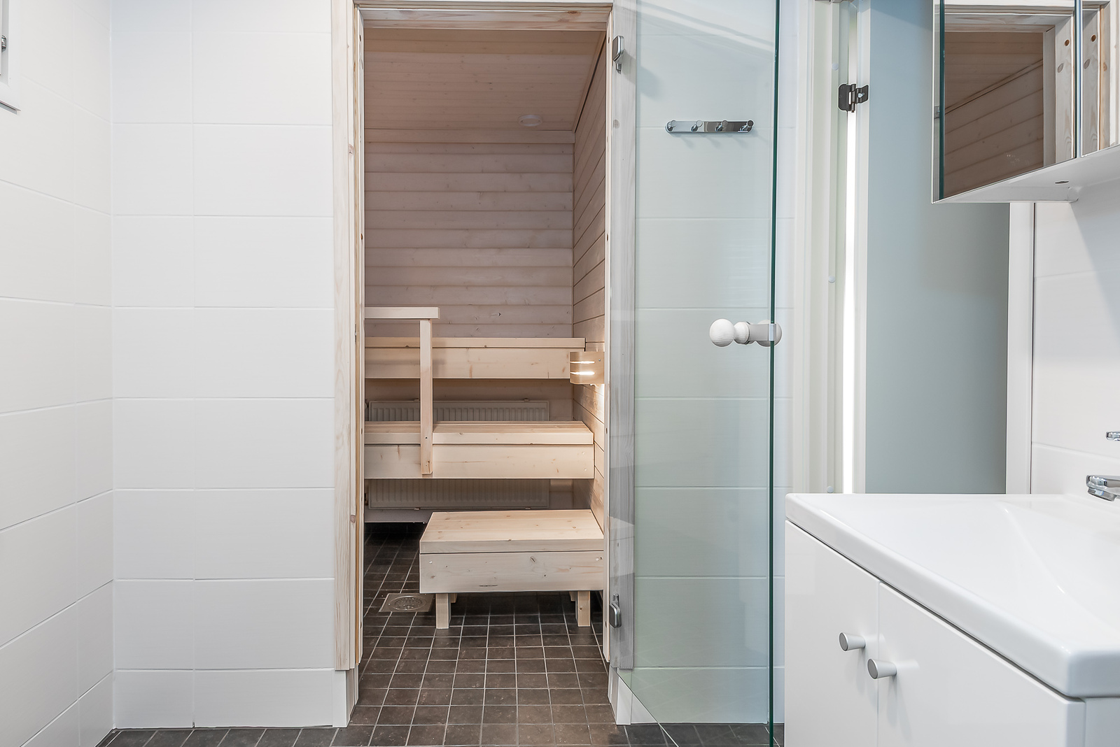 Upeasti remontoitu vaaleasävyinen kylpyhuone ja sauna. -