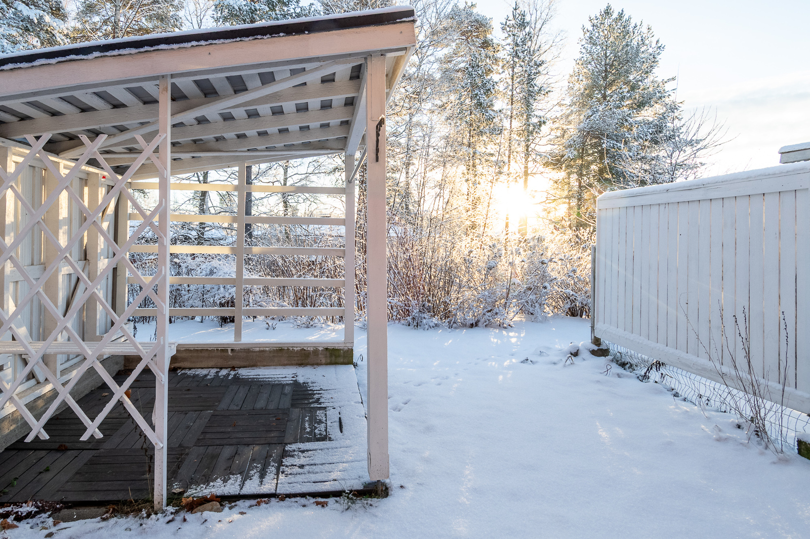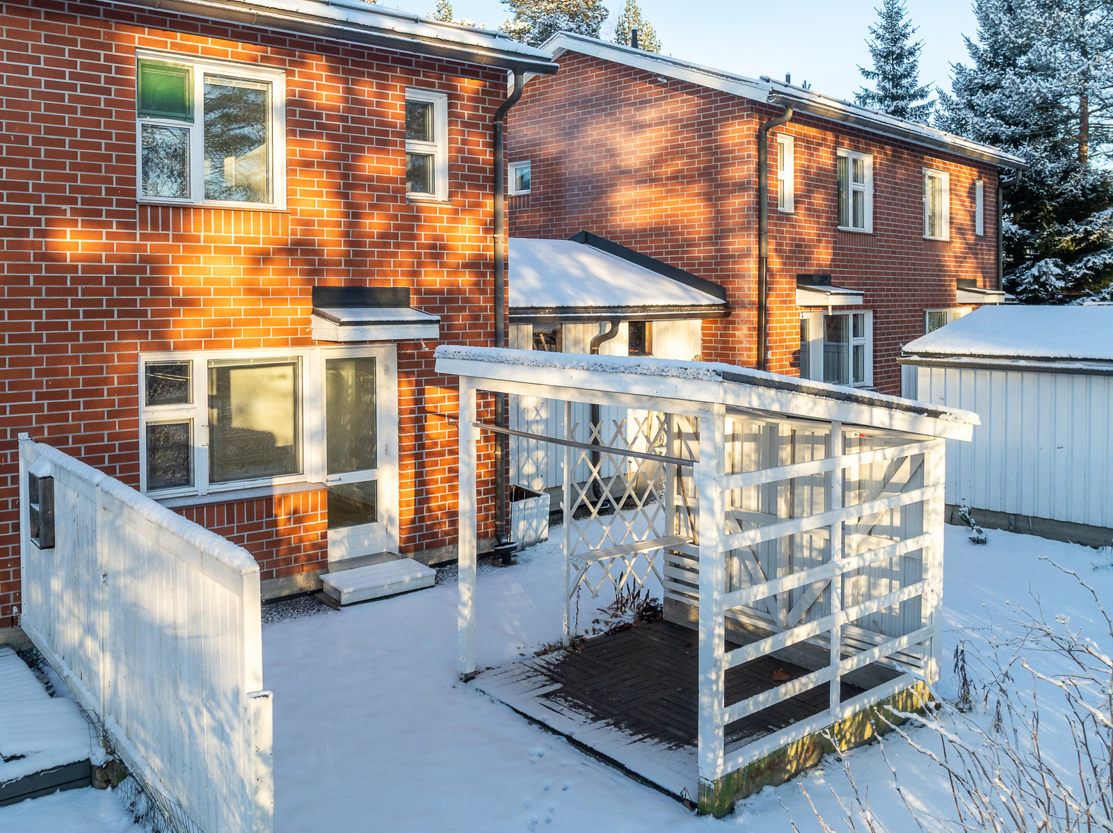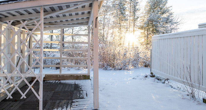 Suojaisalle takapihalle on kulku olohuoneesta. Pihassa on niin terassi kuin katettu pergolakin kauniista kesäpäivistä nauttimiseen.