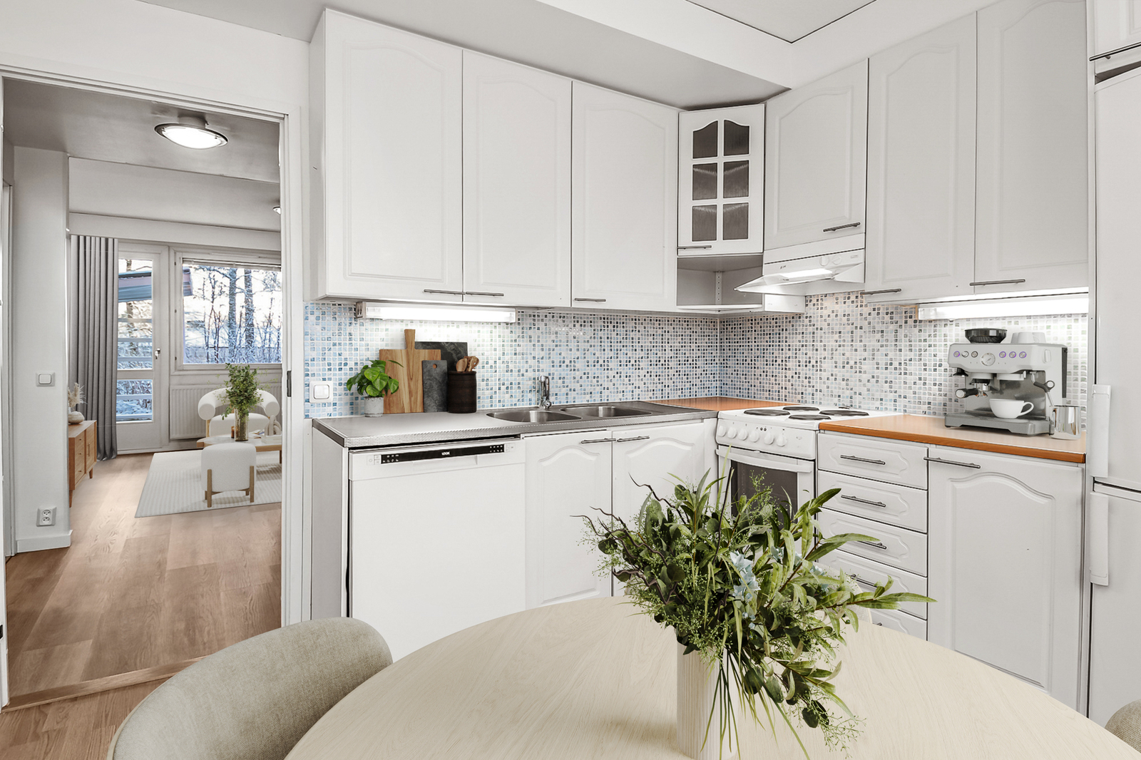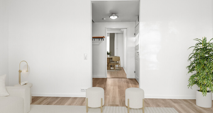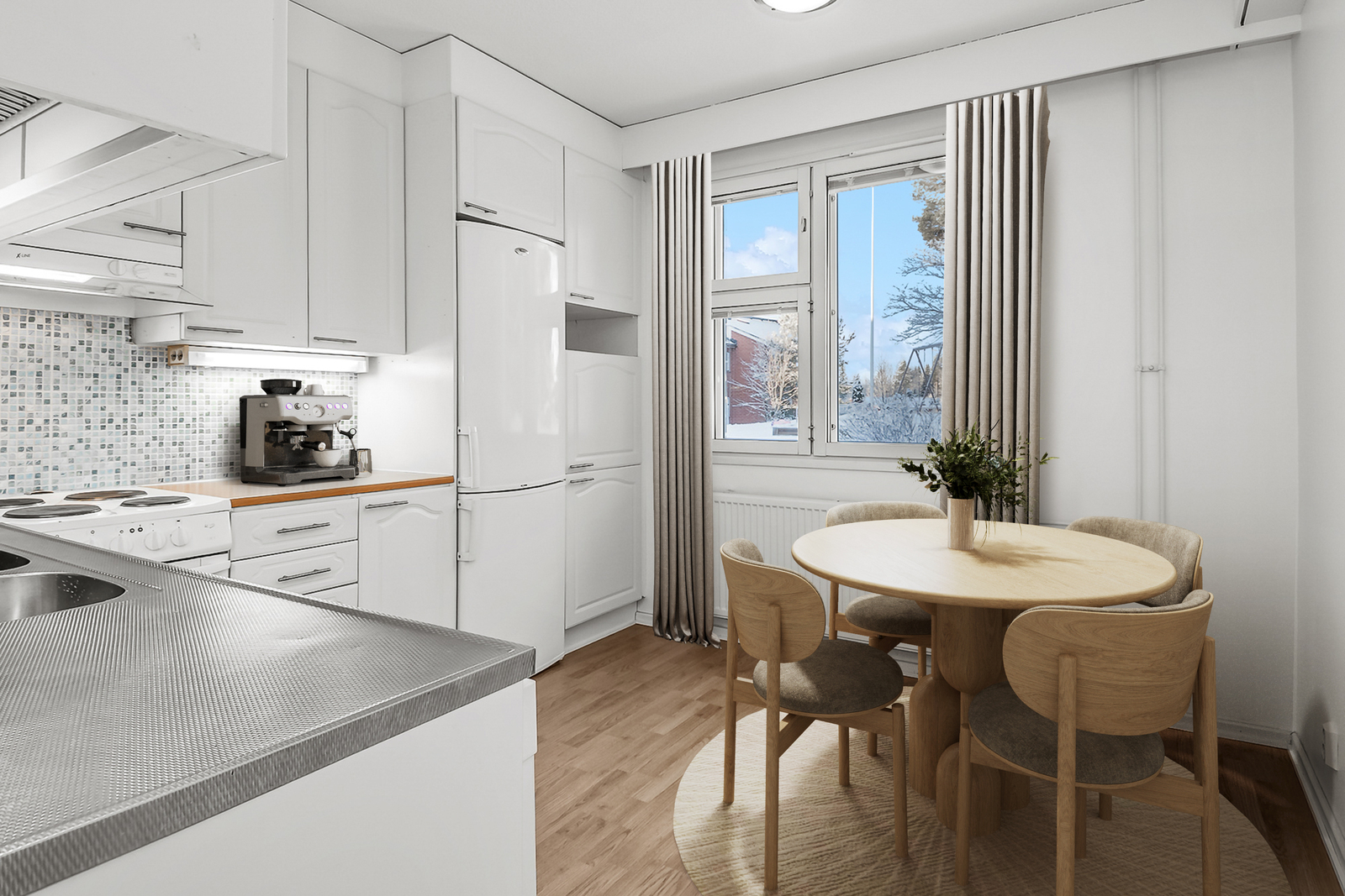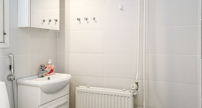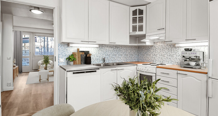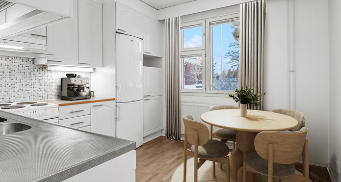 Golven i lägenheten har nyligen förnyats överallt förutom i köket. Samma högklassiga vinylplankor har införskaffats färdigt för köket, ifall köparen vill ha samma stil i köket som i övrigt i lägenheten.