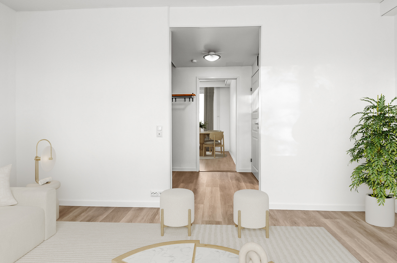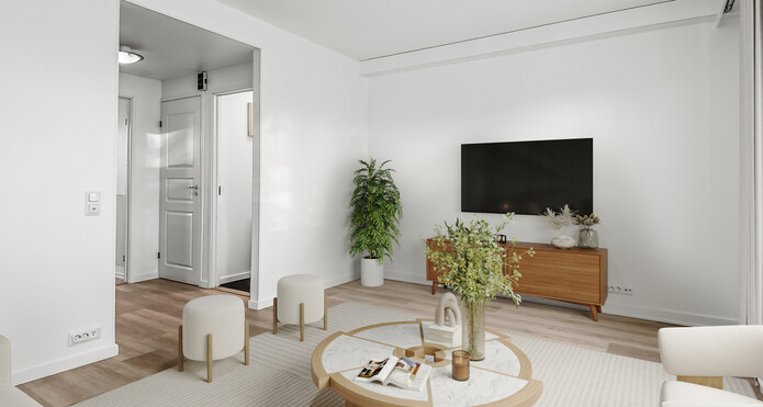 I vardagsrummet finns utgången till den skyddade bakgården. På gården finns både en terrass och en pergola med tak där man kan njuta av vackra sommardagar.