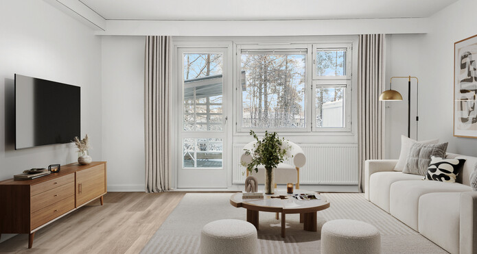 Tämä hyvin hoidetun taloyhtiön asunto sijaitsee rauhallisella ja hiljaisella puolella tonttia ja takapiha on pensasaidoin suojattu takana kulkevan kevyenliikenteenväylän suuntaan.
