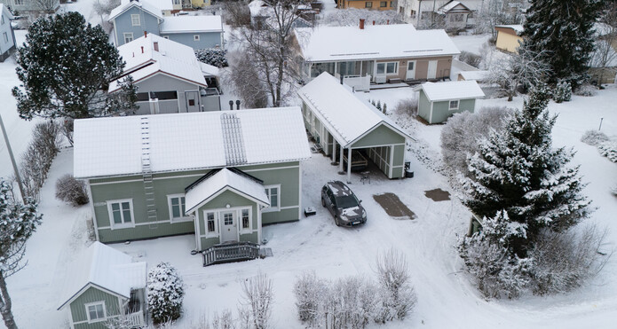 I gårdsbyggnaden finns ett biltak och dessutom en verklig överraskning: ett trivsamt gästrum med eget kök och badrum. Detta utrymme passar utmärkt som t.ex. distansarbetsrum, som ungdomarnas egna herradöme eller som gästrum - och också här finns luftvärmepump.