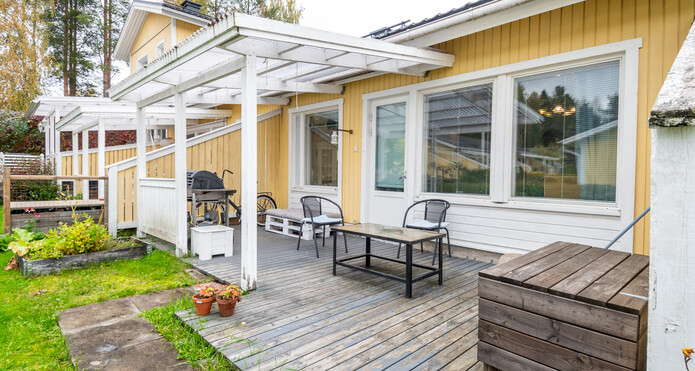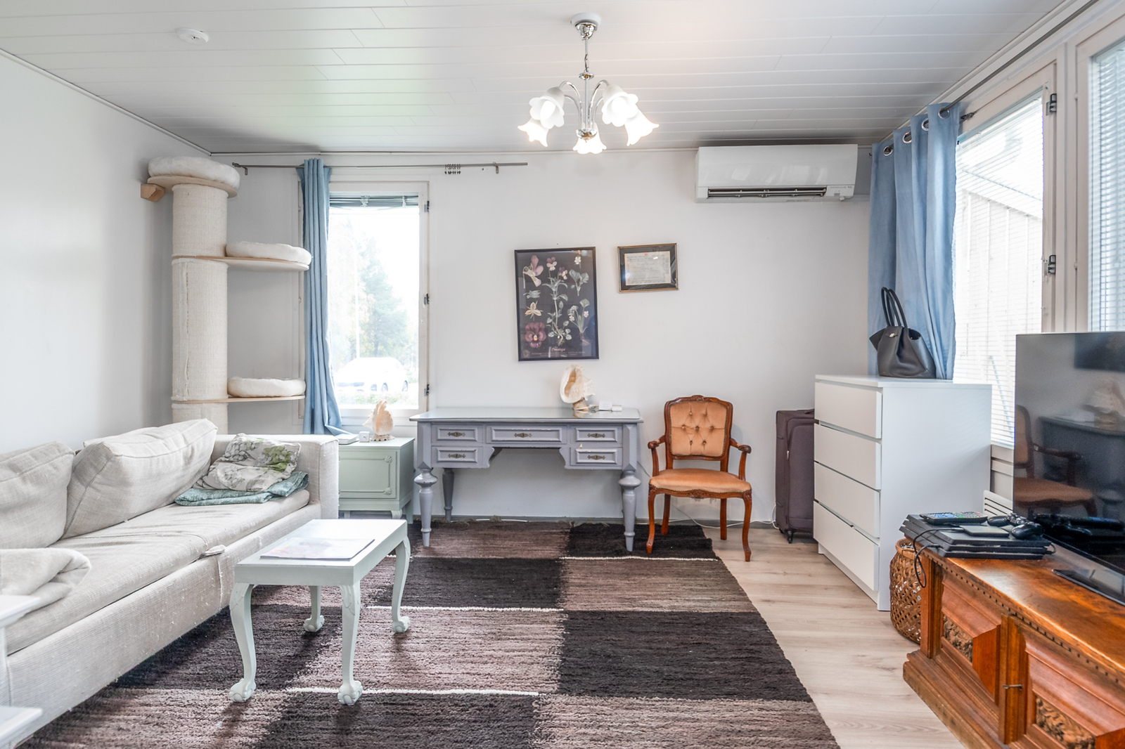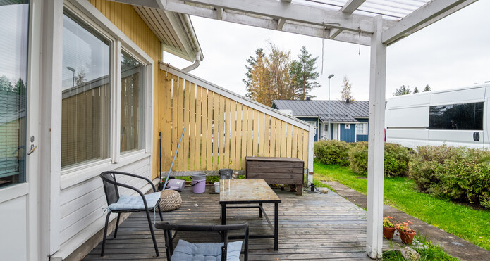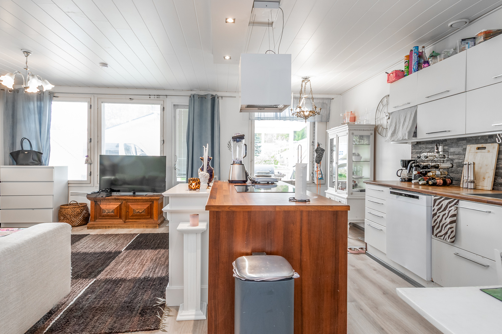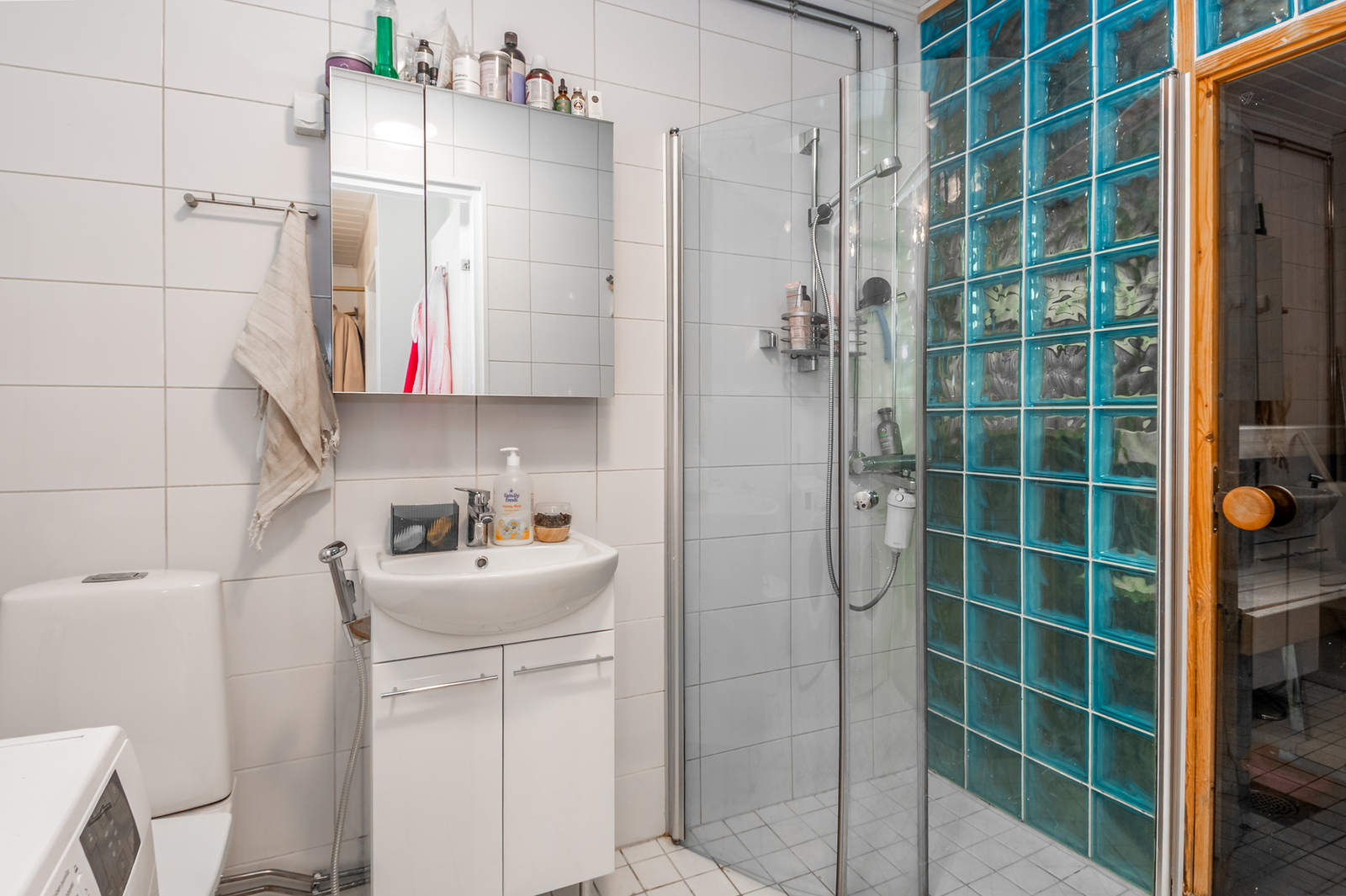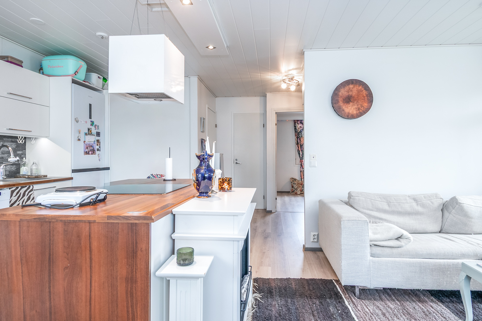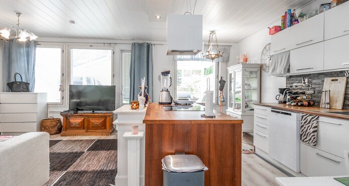 Detta hem befinner sig i ett välskött husbolag och har renoverats för att uppfylla dagens boendekrav: det fantastiska köket har öppnats mot vardagsrummet och som rumsavdelare fungerar en köksö. I vardagsrummet finns utgången till terrassen och den egna bakgården. Till den höga utrustningsnivån hör också luftvärmepumpen som installerats i vardagsrummet. Sovrummet är i bra storlek och i anslutning till detta finns bostadens andra garderob. I anslutning till det vackra badrummet finns också en egen bastu.