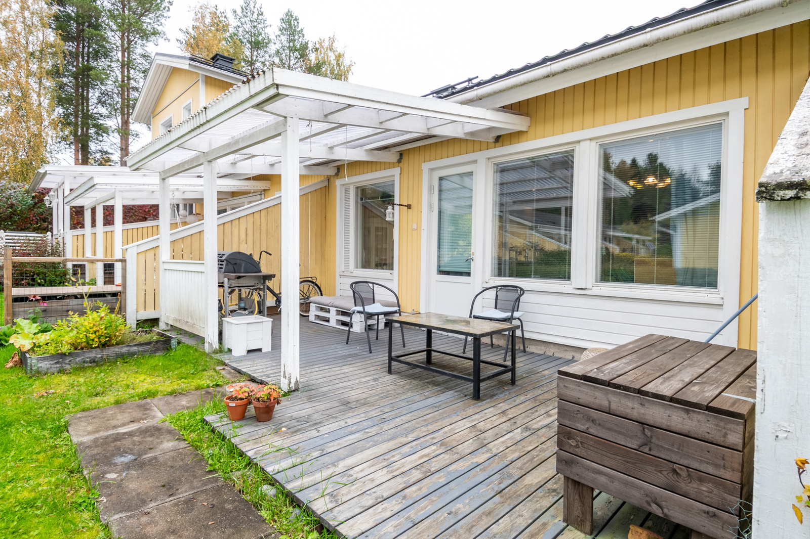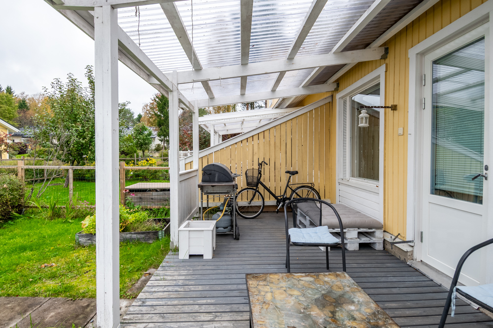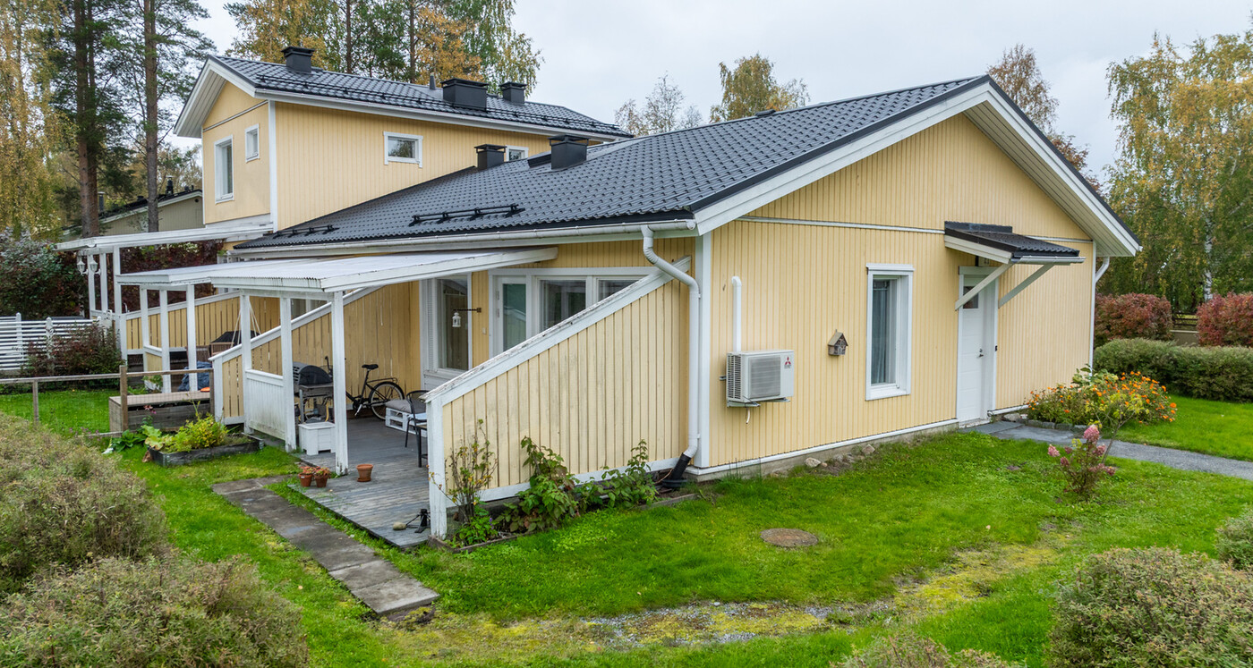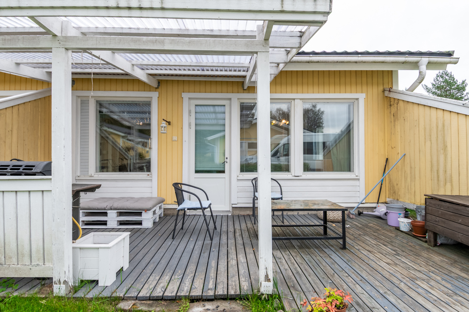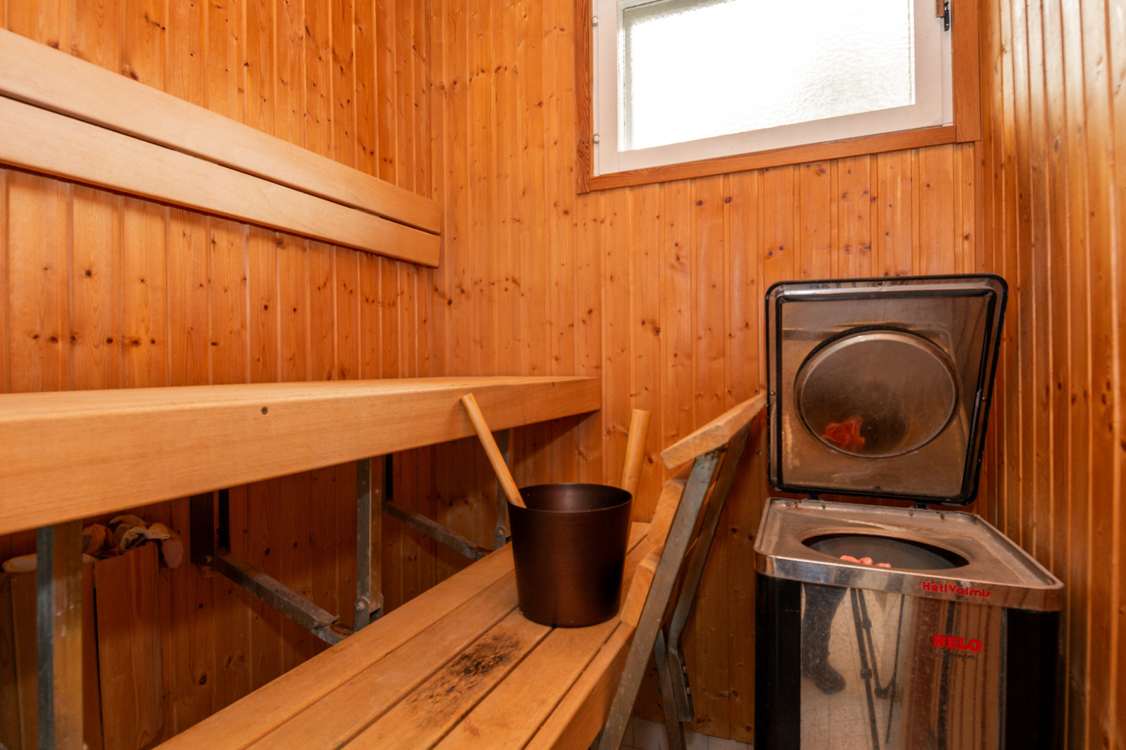 Detta hem befinner sig i ett välskött husbolag och har renoverats för att uppfylla dagens boendekrav: det fantastiska köket har öppnats mot vardagsrummet och som rumsavdelare fungerar en köksö. I vardagsrummet finns utgången till terrassen och den egna bakgården. Till den höga utrustningsnivån hör också luftvärmepumpen som installerats i vardagsrummet. Sovrummet är i bra storlek och i anslutning till detta finns bostadens andra garderob. I anslutning till det vackra badrummet finns också en egen bastu.