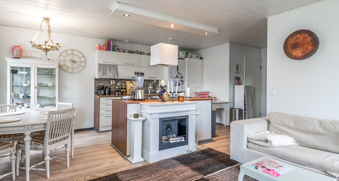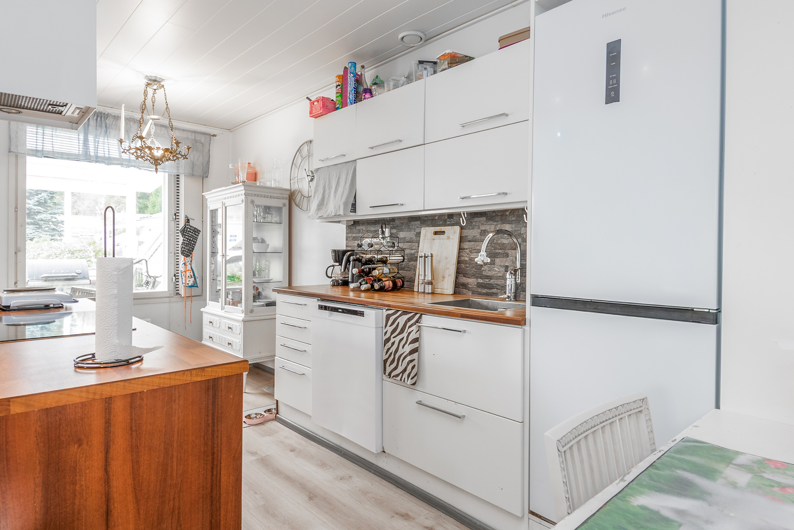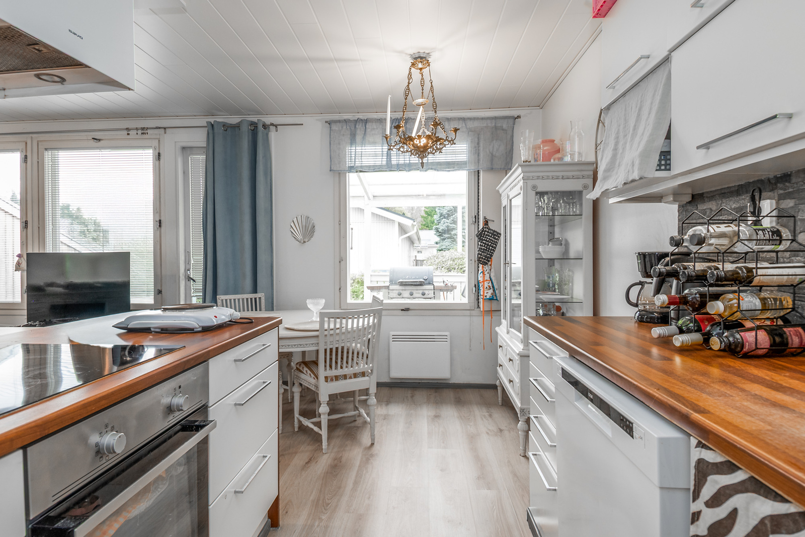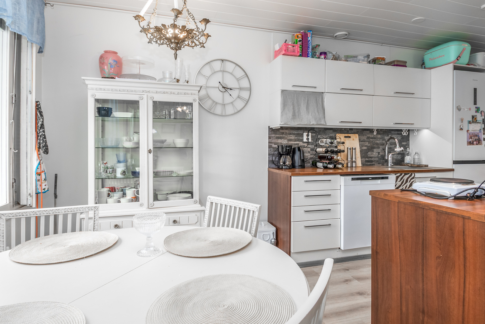 Tämä hyvin hoidetussa taloyhtiössä sijaitseva koti on remontoitu vastaamaan tämän päivän asumistoiveita: upea keittiö on avattu olohuoneeseen ja tilanjakajana toimii saareke. Olohuoneesta on kulku terassille ja omalle takapihalle. Korkeaan varustelutasoon kuuluu myös olohuoneeseen asennettu ilmalämpöpumppu. Makuuhuone on hyvänkokoinen ja sen yhteydessä on asunnon toinen vaatehuone. Hyväkuntoisen kylpyhuoneen yhteydessä on myös oma sauna.