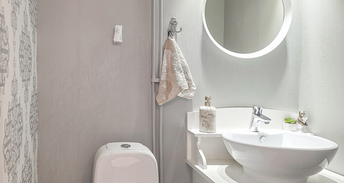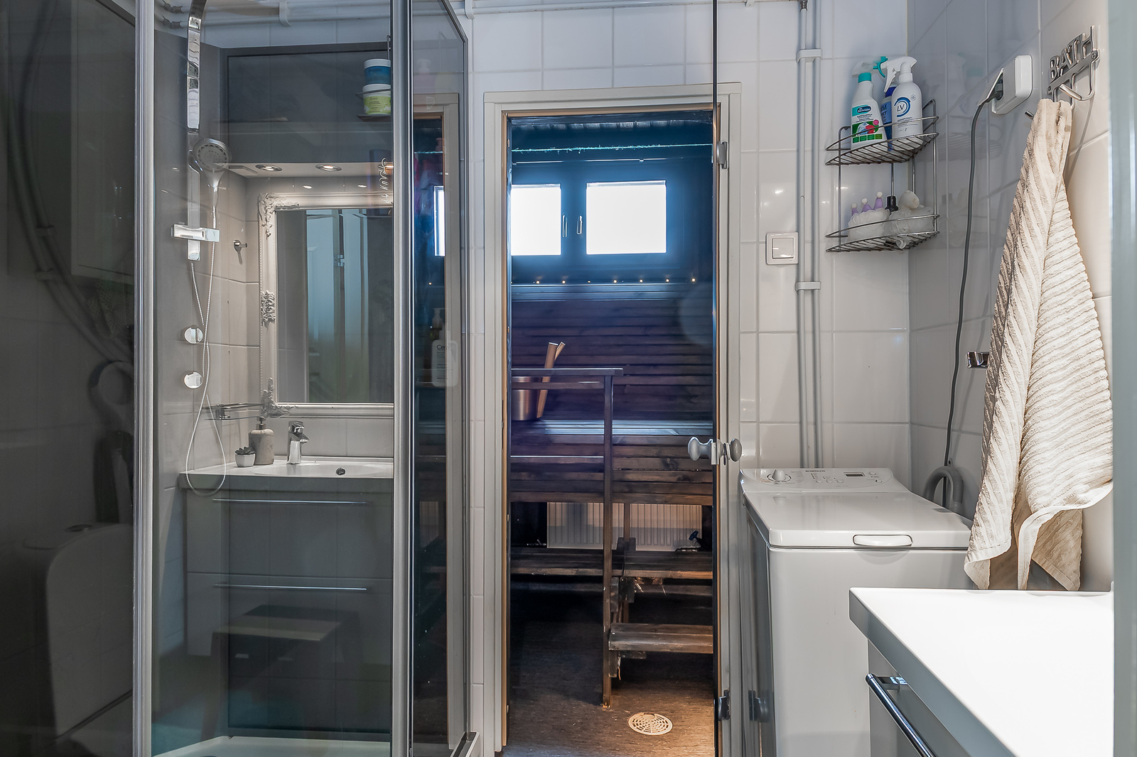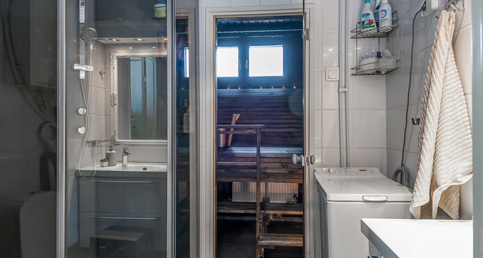 Varusteet: pesukoneliitäntä, lattialämmitys, suihku, peili -