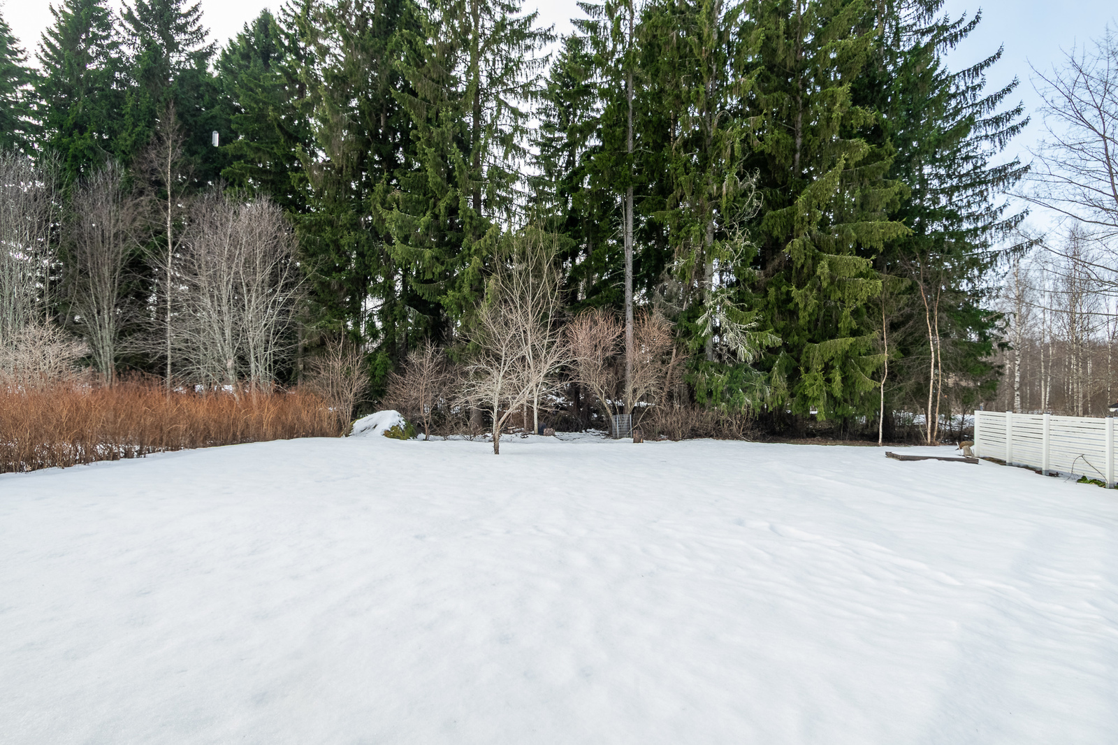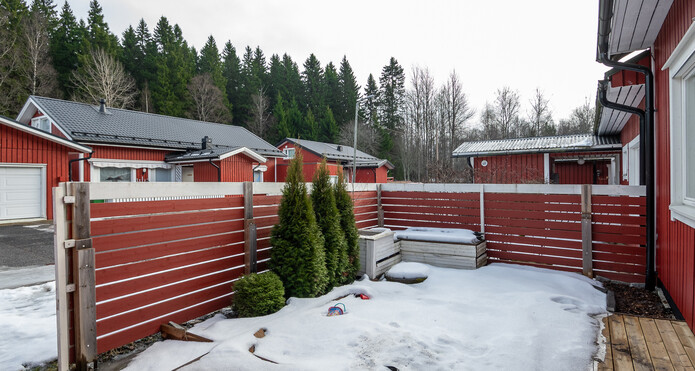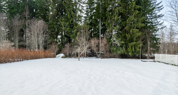 Hyvänkokoinen tasamaatontti on alueelle poikkeuksellisesti omaksi lunastettu. Takapiha on aidattu ja pääosin nurmea. Autolle on talli ja lisäksi toinen auto mahtuu etupuolen sisääntulon viereen.