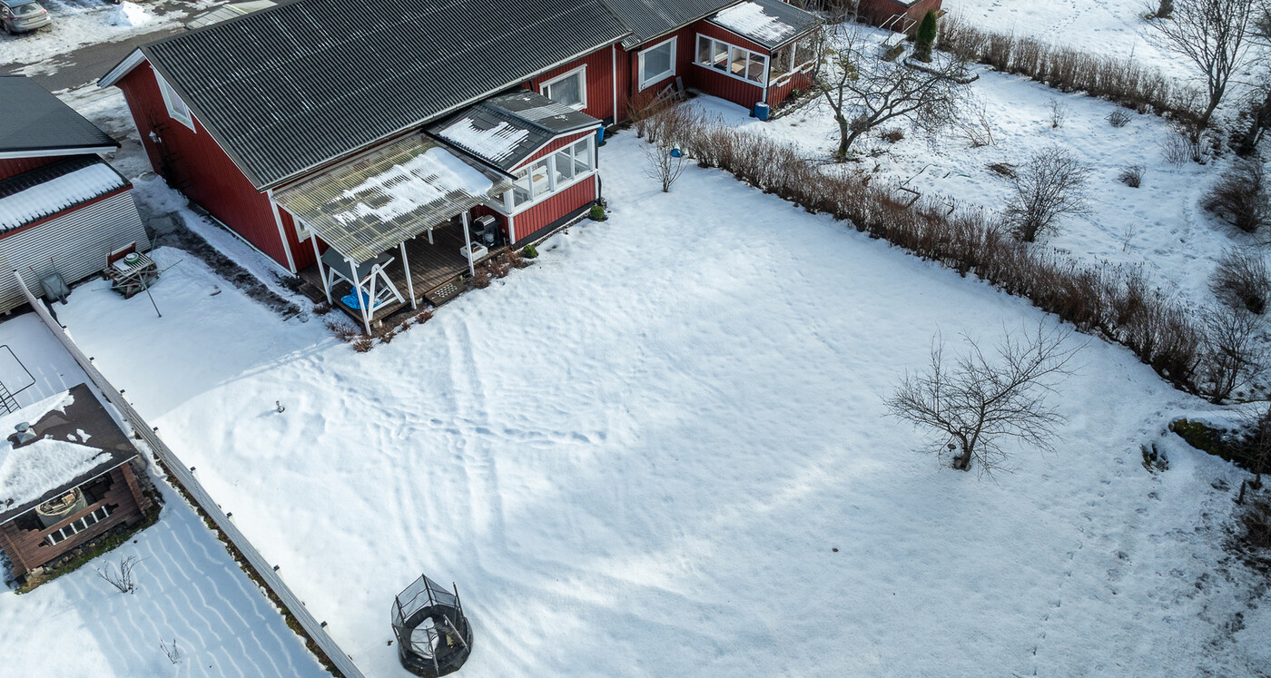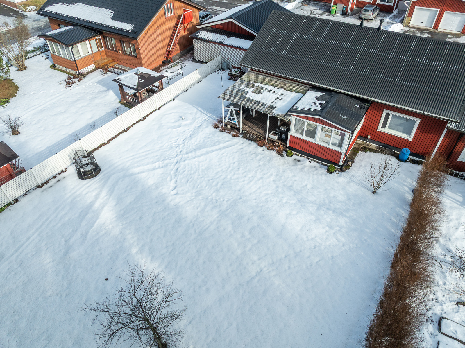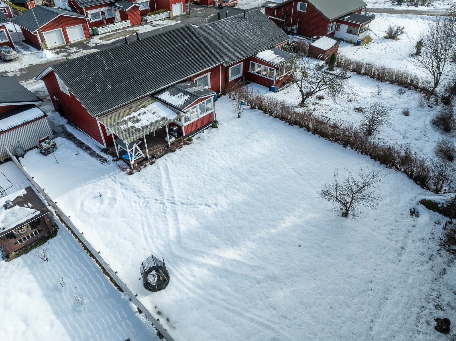 Den jämna tomten är i bra storlek och är inlöst, vilket är ovanligt för detta område. Bakgården är inhägnad och består främst av gräsmatta. Det finns ett garage för bilen och dessutom ryms även en andra bil på framsidan bredvid ingången.