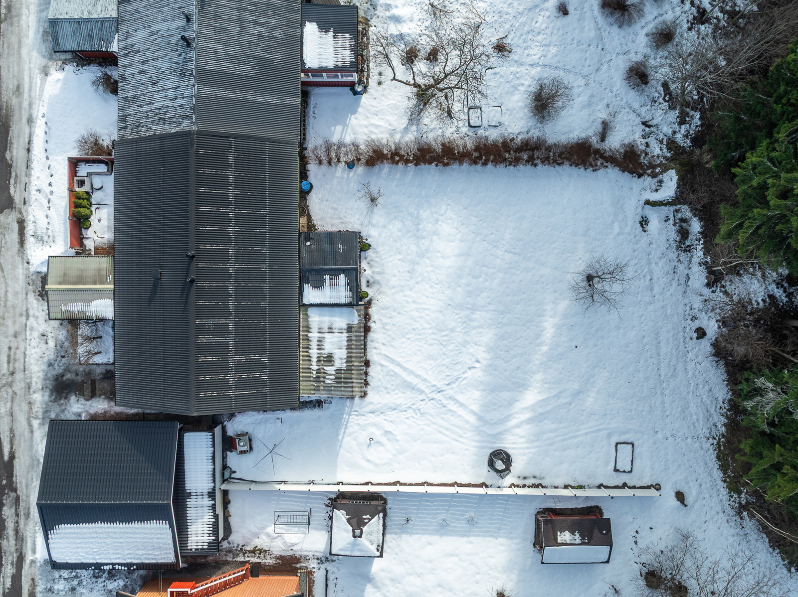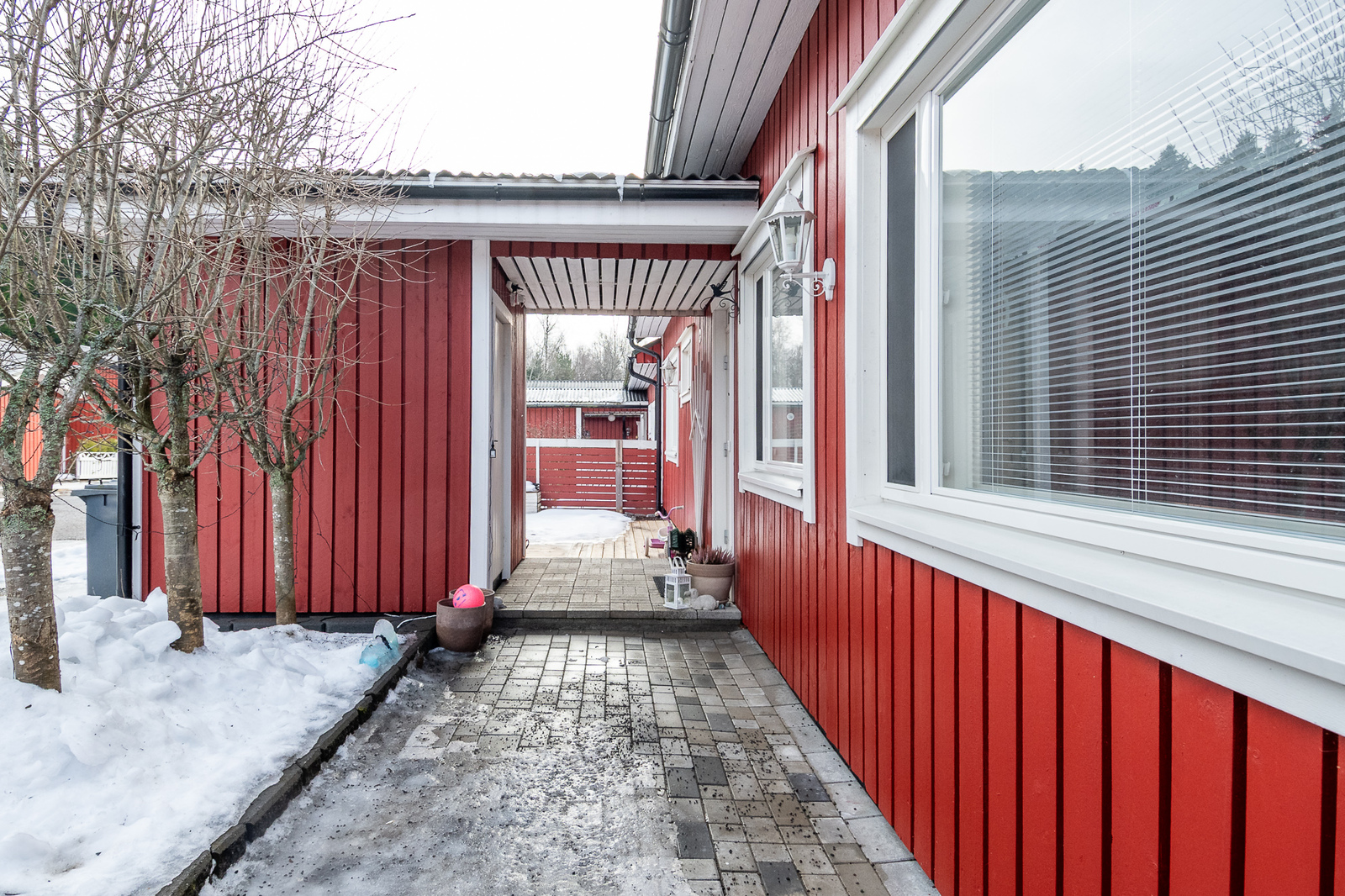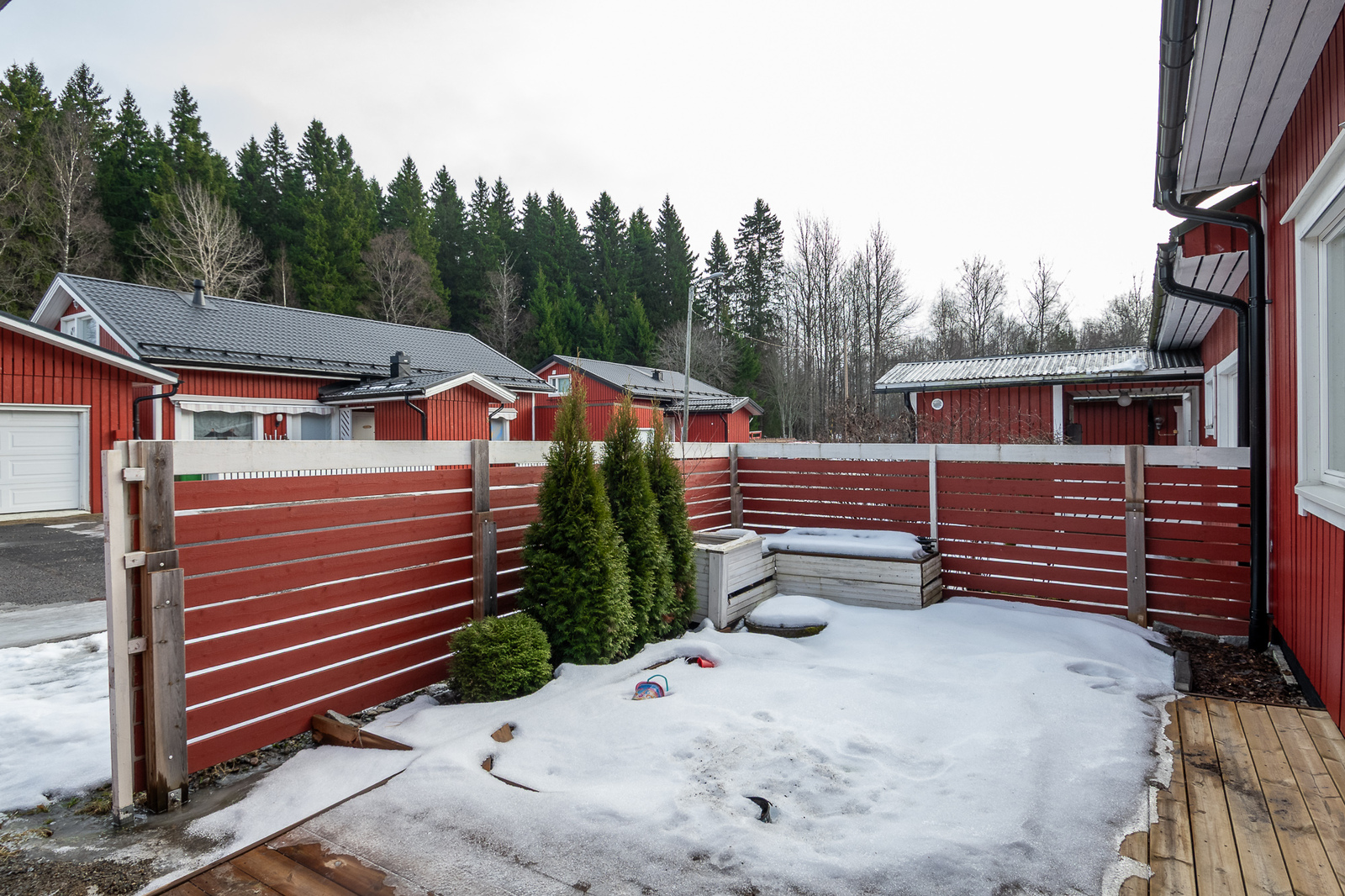Den jämna tomten är i bra storlek och är inlöst, vilket är ovanligt för detta område. Bakgården är inhägnad och består främst av gräsmatta. Det finns ett garage för bilen och dessutom ryms även en andra bil på framsidan bredvid ingången.