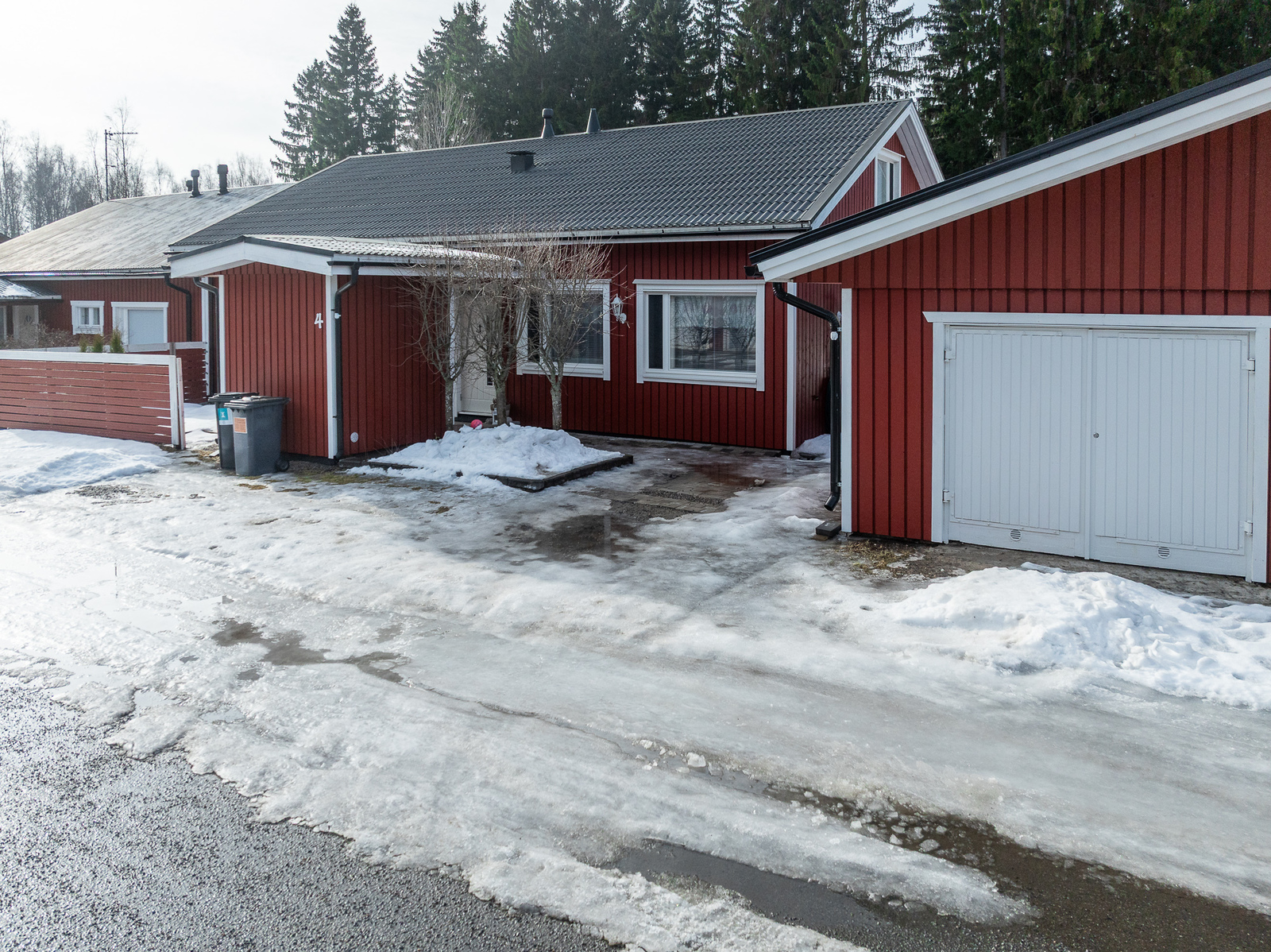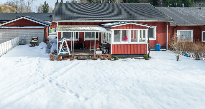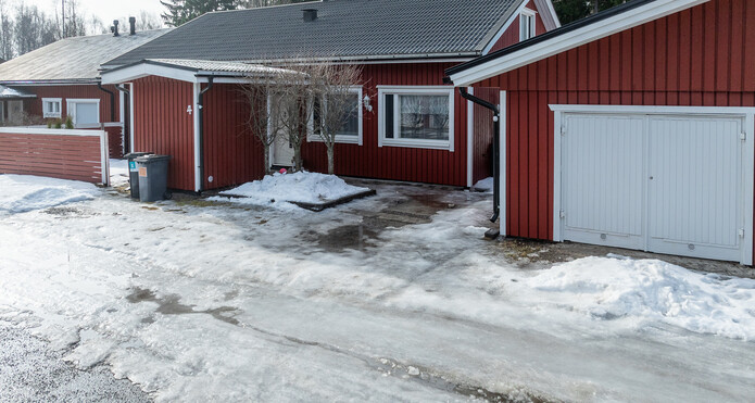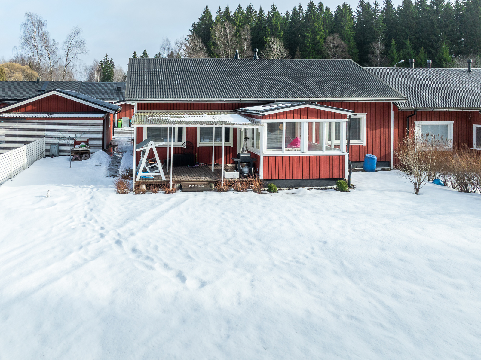 Detta enplanshem har renoverats omfattande inomhus och består av fyra sovrum, ett rymligt vardagsrum, badrum, bastu, ett separat WC, kök och matplats. Det finns gott om förvaringsutrymme; här finns en garderob och dessutom ett vindsutrymme som gjorts i samband med takändringen. Det finns också möjlighet till mera boendeutrymmen på vinden.