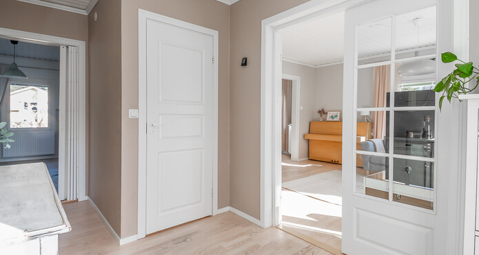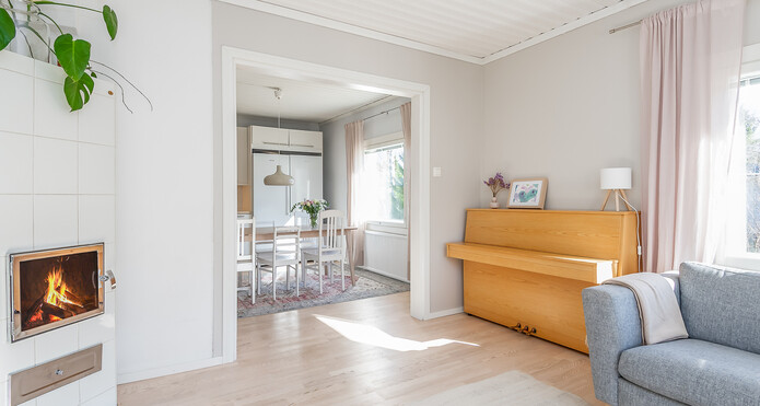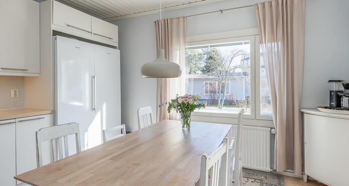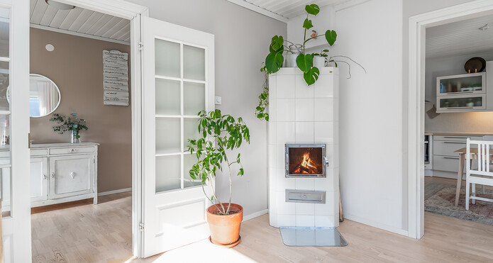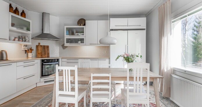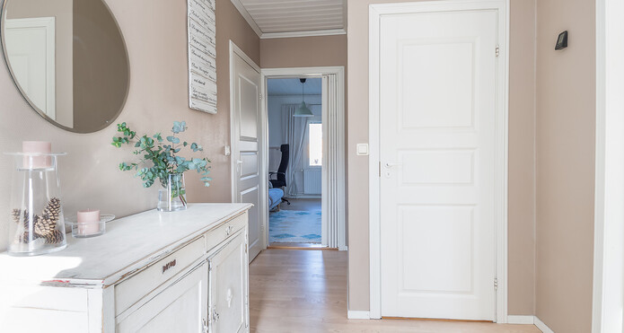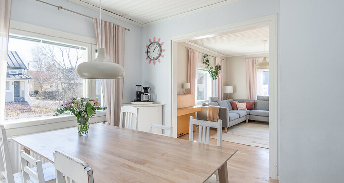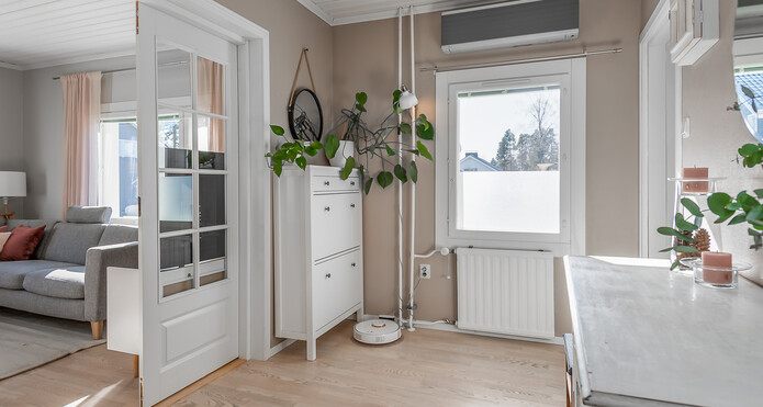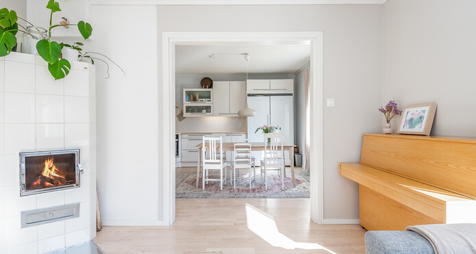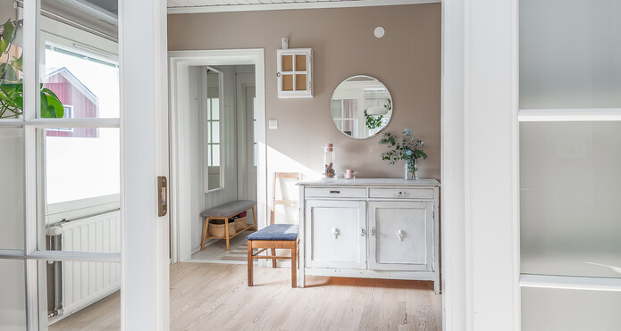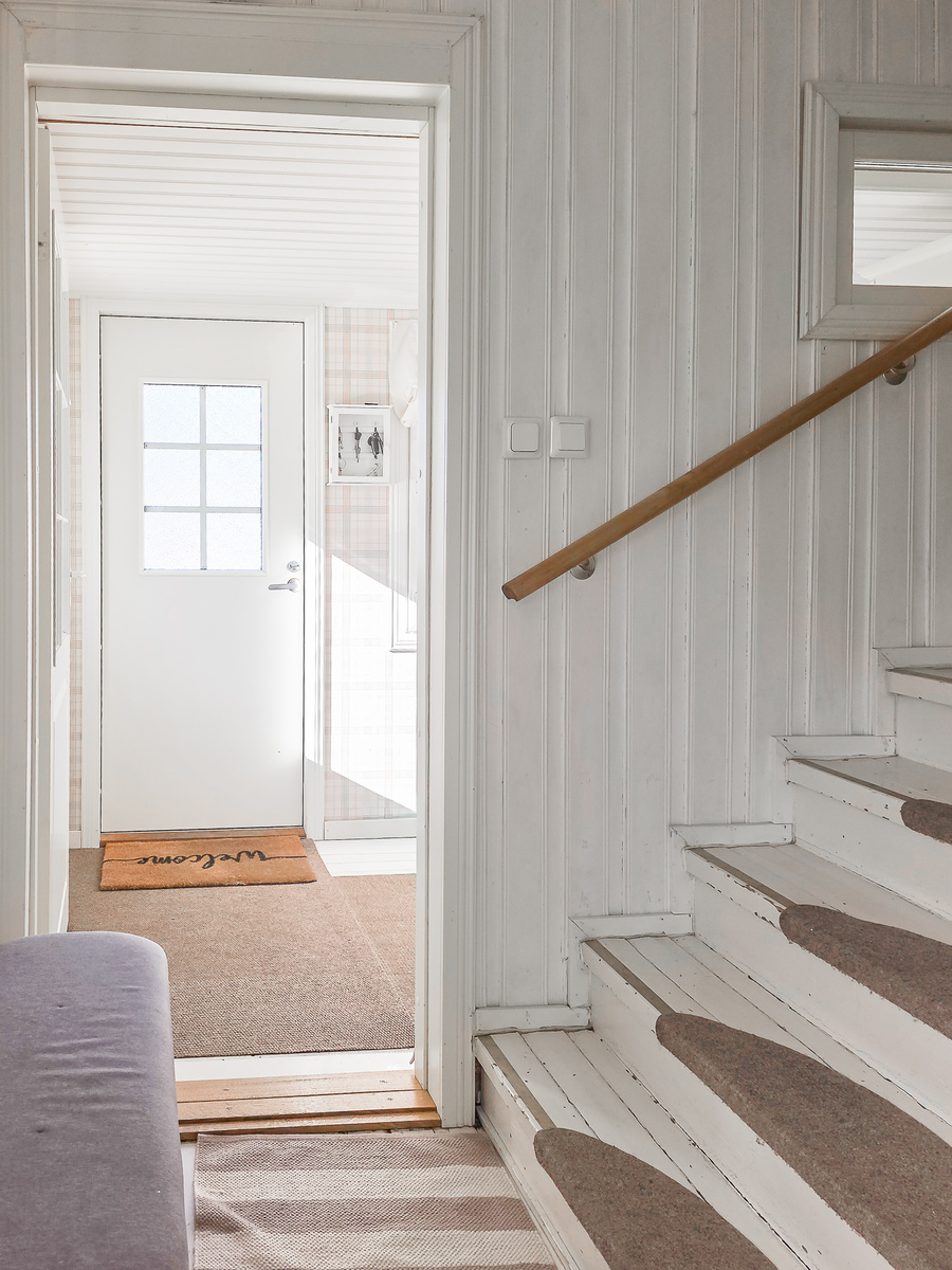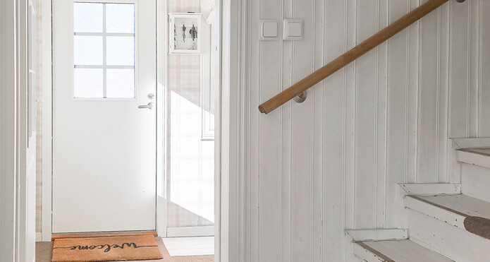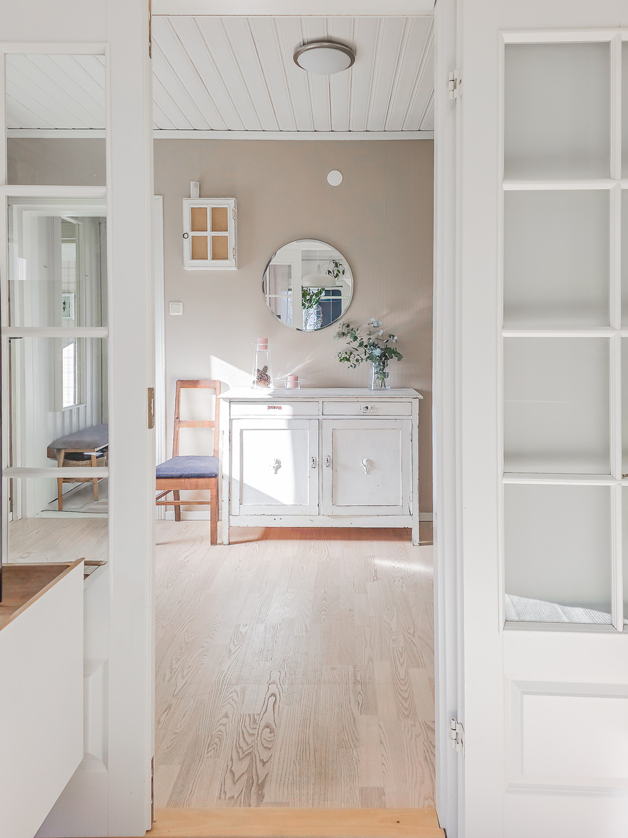 Astuessasi sisään, aistit heti idyllisen, mutta nykyaikaisen tunnelman. Vaaleat sävyt ja modernit, mutta vanhaa kunnioittaen remontoidut pinnat tuovat heti tunteen valoisasta kodista.