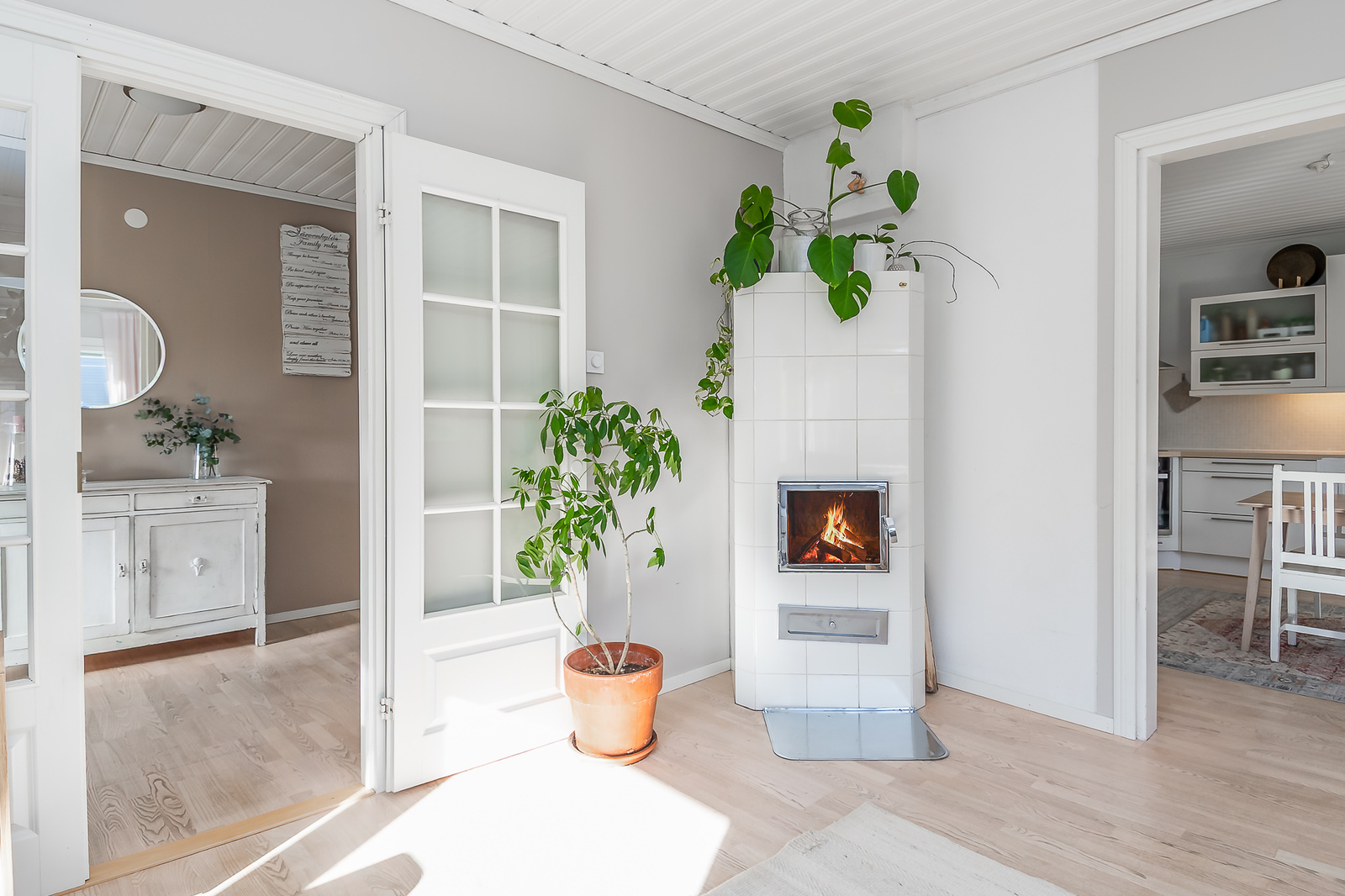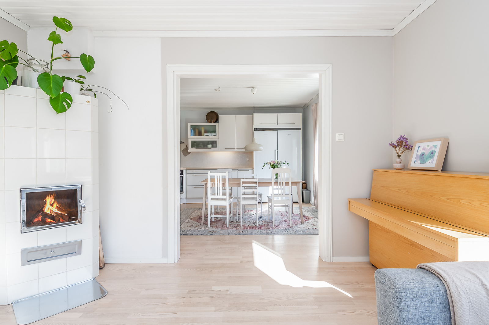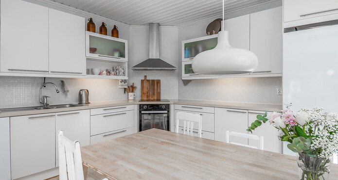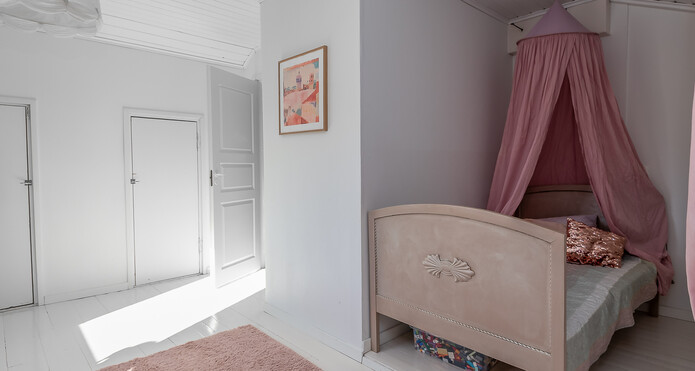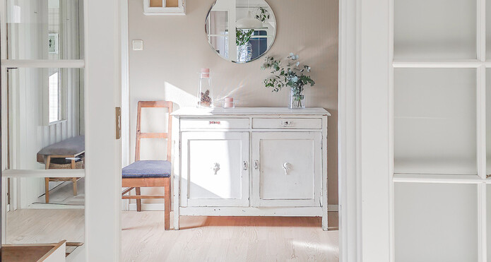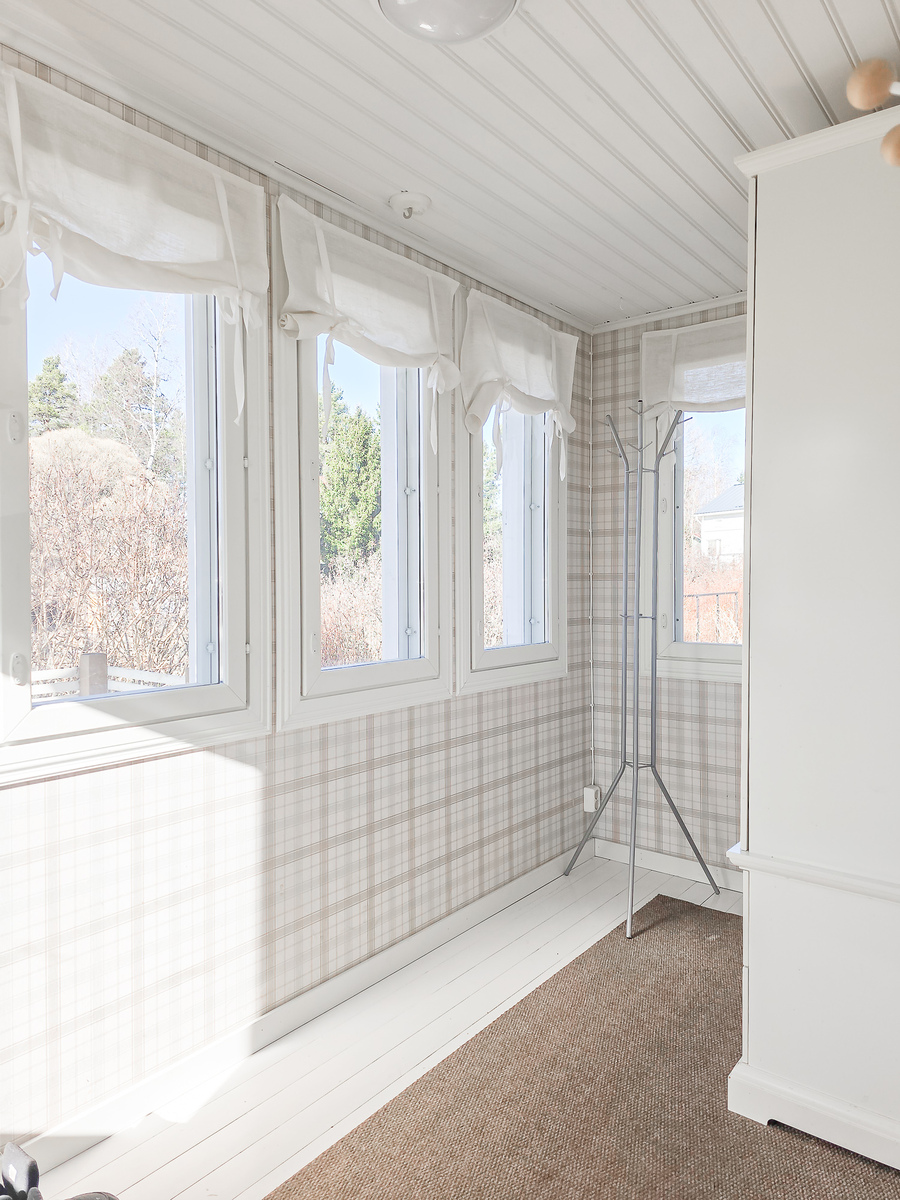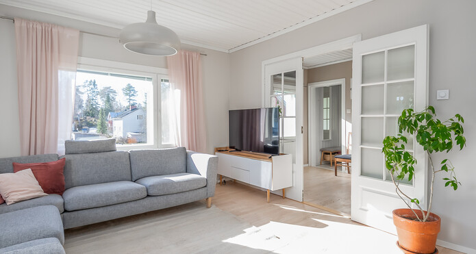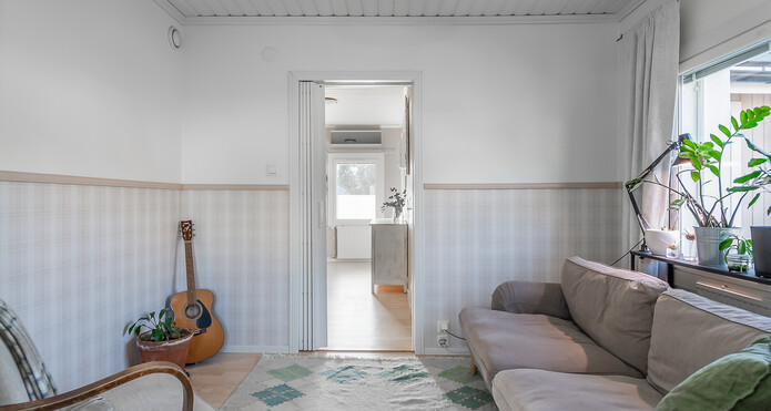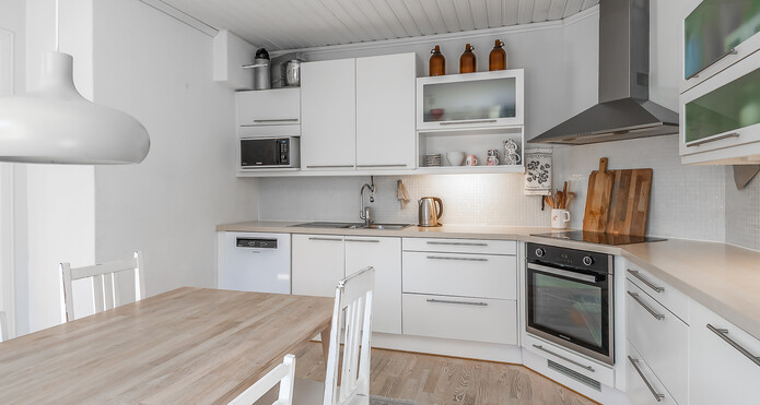 Astuessasi sisään, aistit heti idyllisen, mutta nykyaikaisen tunnelman. Vaaleat sävyt ja modernit, mutta vanhaa kunnioittaen remontoidut pinnat tuovat heti tunteen valoisasta kodista.