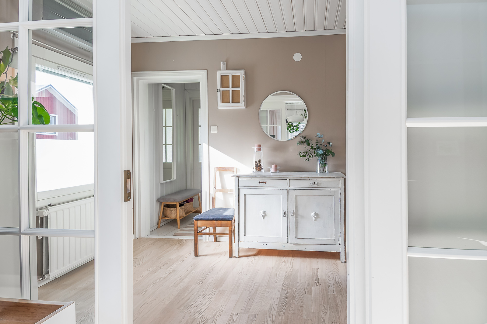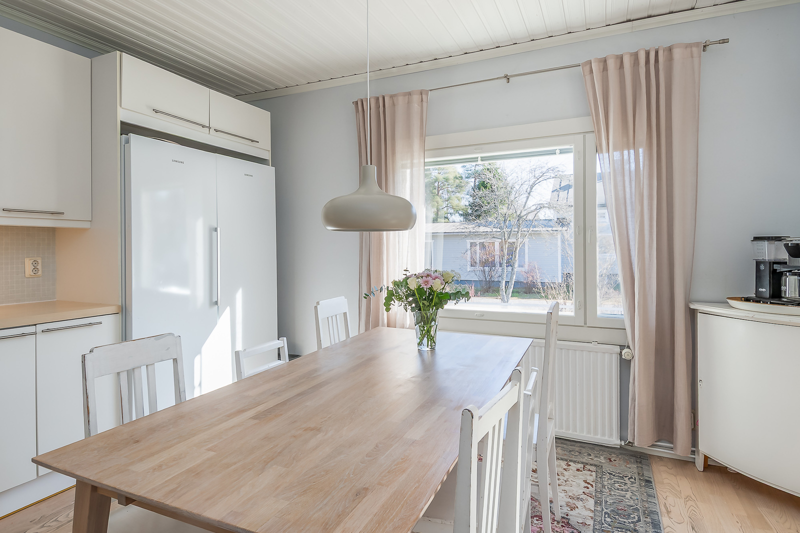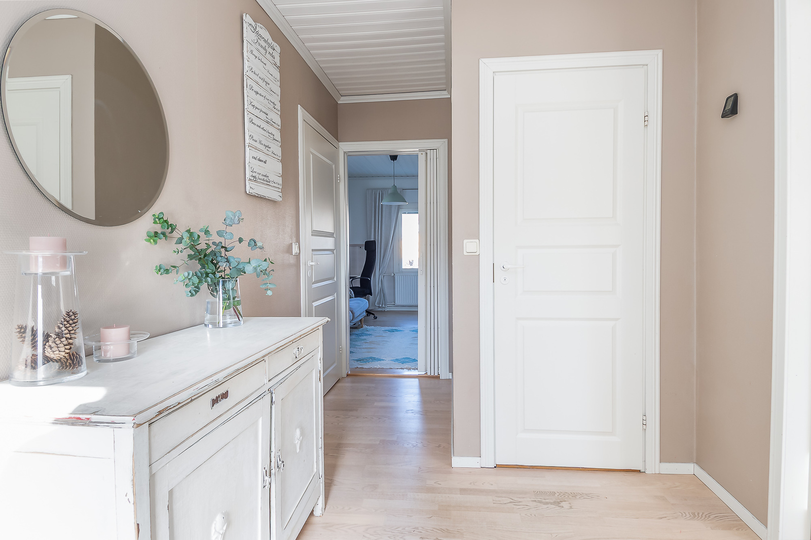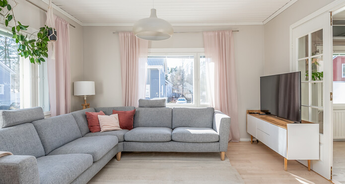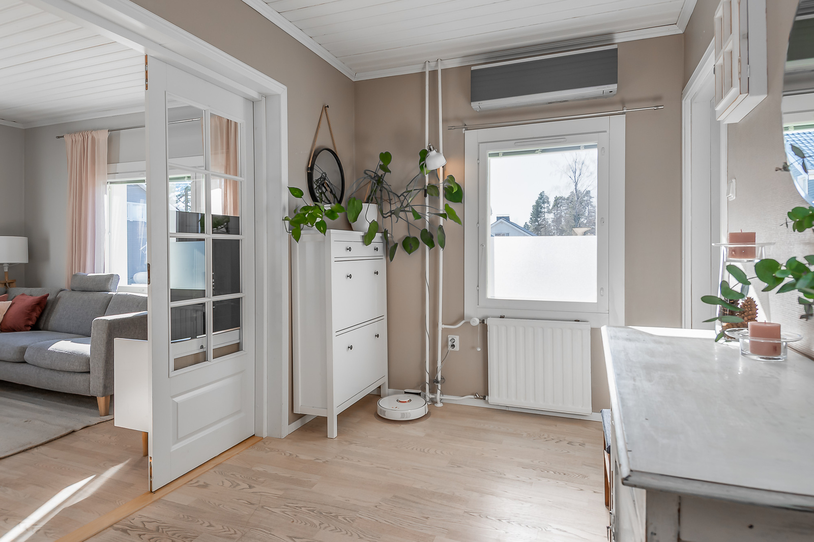 Astuessasi sisään, aistit heti idyllisen, mutta nykyaikaisen tunnelman. Vaaleat sävyt ja modernit, mutta vanhaa kunnioittaen remontoidut pinnat tuovat heti tunteen valoisasta kodista.