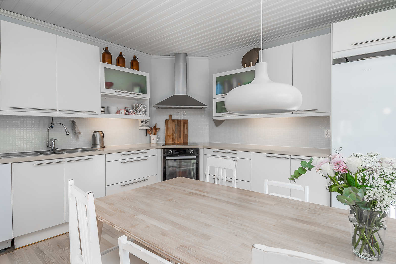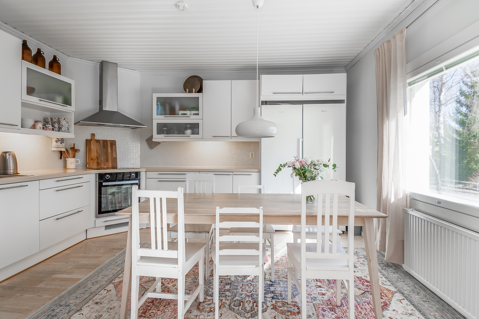 Keittiön kuvausSaarniparketti, maalatut seinät ja laatta, Puustellin kaapistot, Samsungin jääkaappi ja pakastinkaappi, liesituuletin, Grundigin induktioliesi, uuni ja astianpesukone.