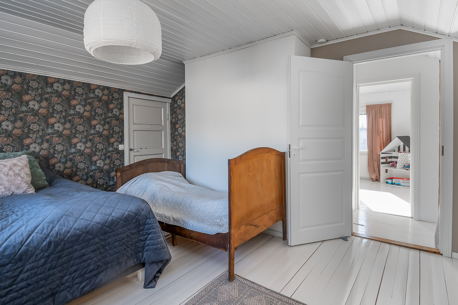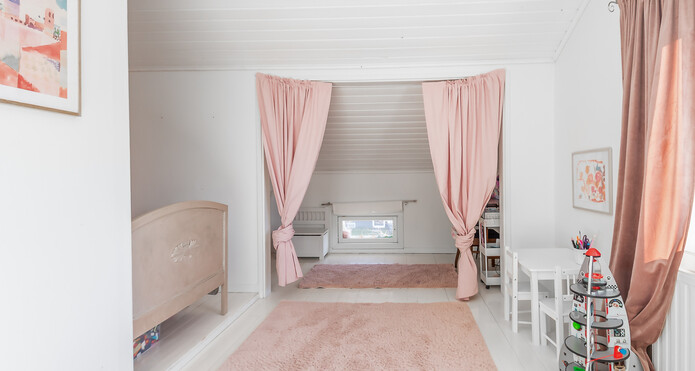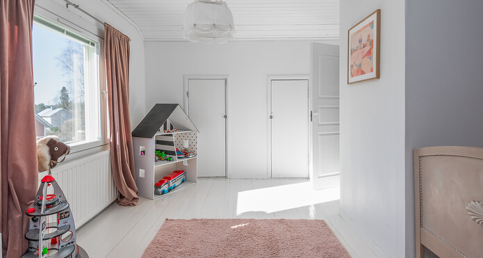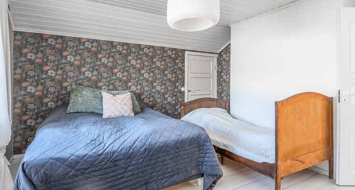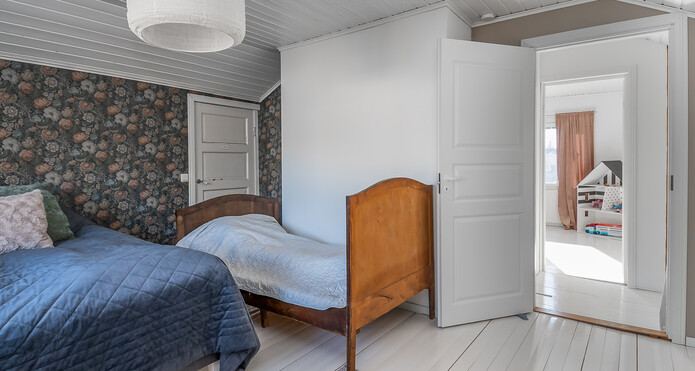 Alakerran makuuhuoneessa parkettilattia, seinät tapetoidut ja osittain maalatut. Yläkerran makuuhuoneissa lautalattiat, toisessa seinät tapetoidut, toisessa maalatut. -