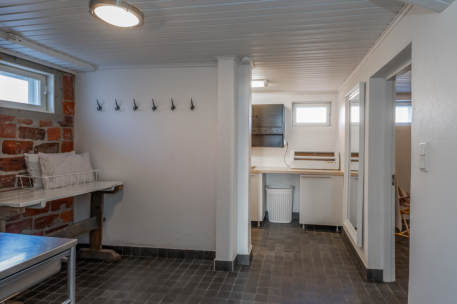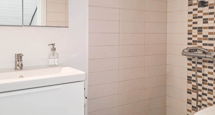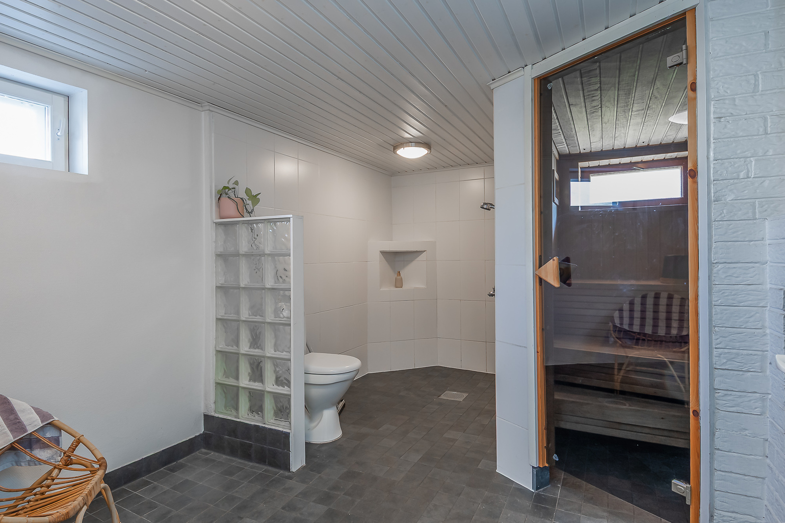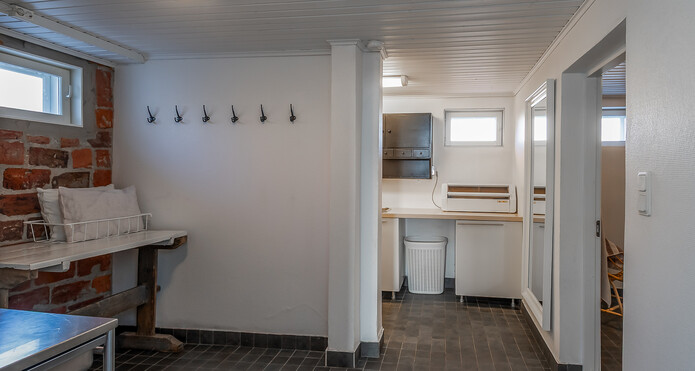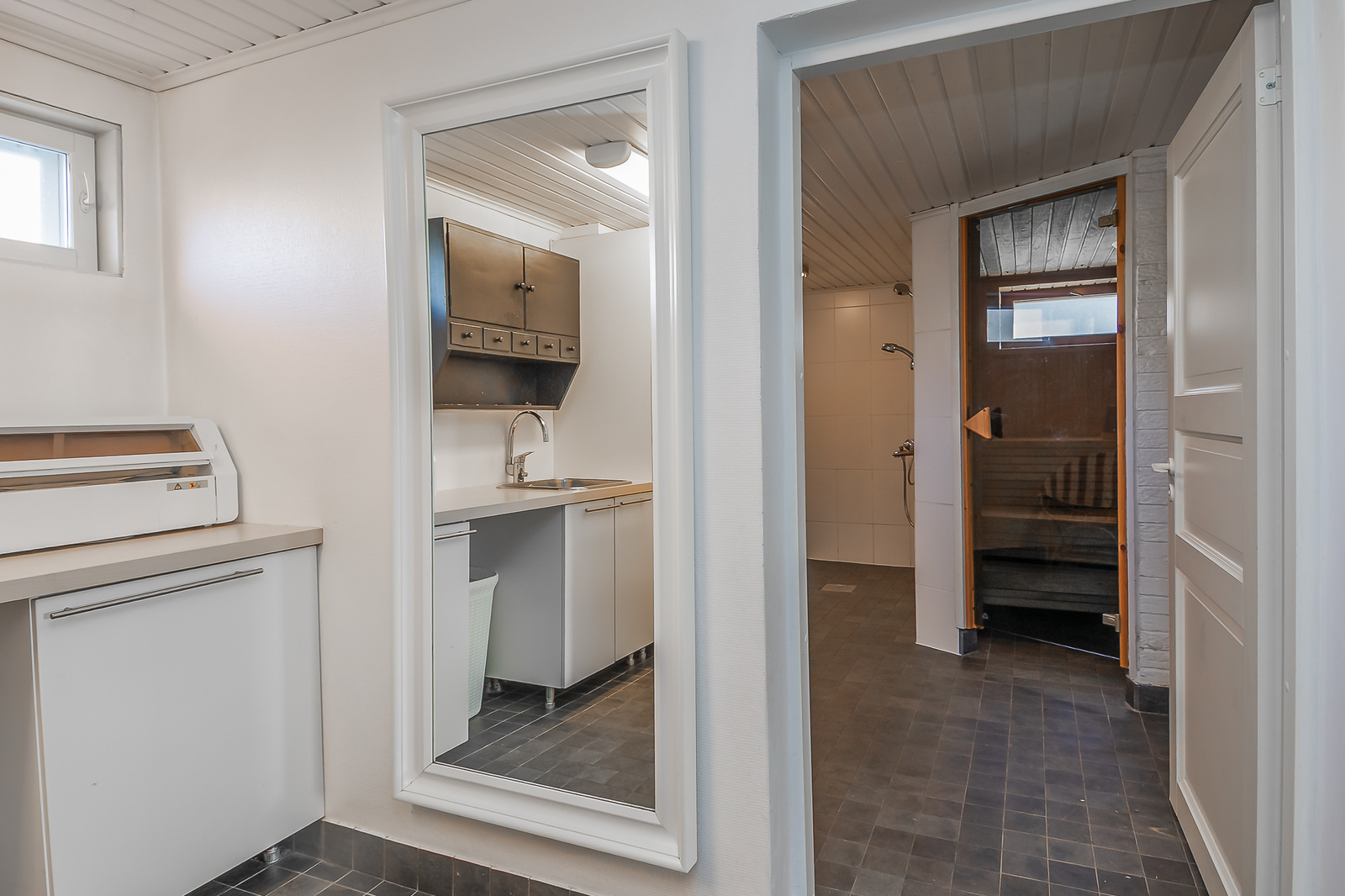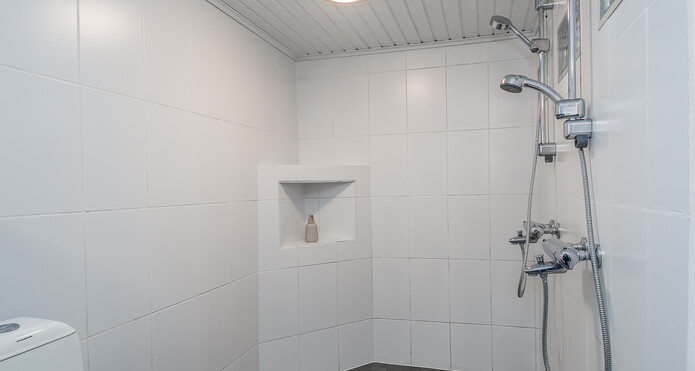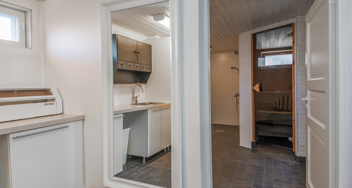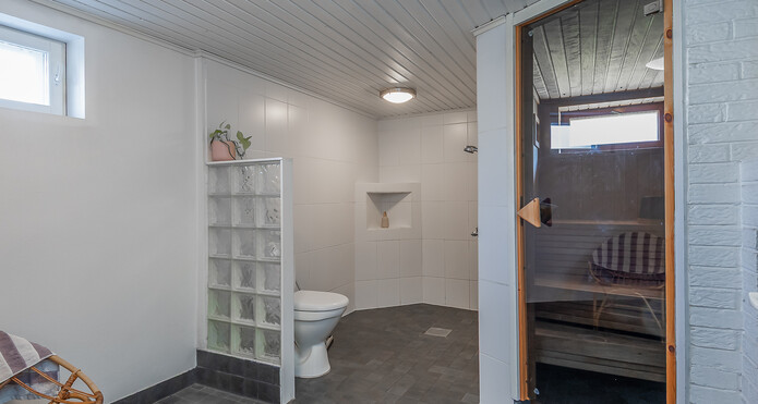 Yläkerrassa wc:ssä suihku ja peilikaappi ja kellarin kylpyhuoneessa 2 suihkua ja paikka poreammeelle. -