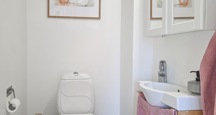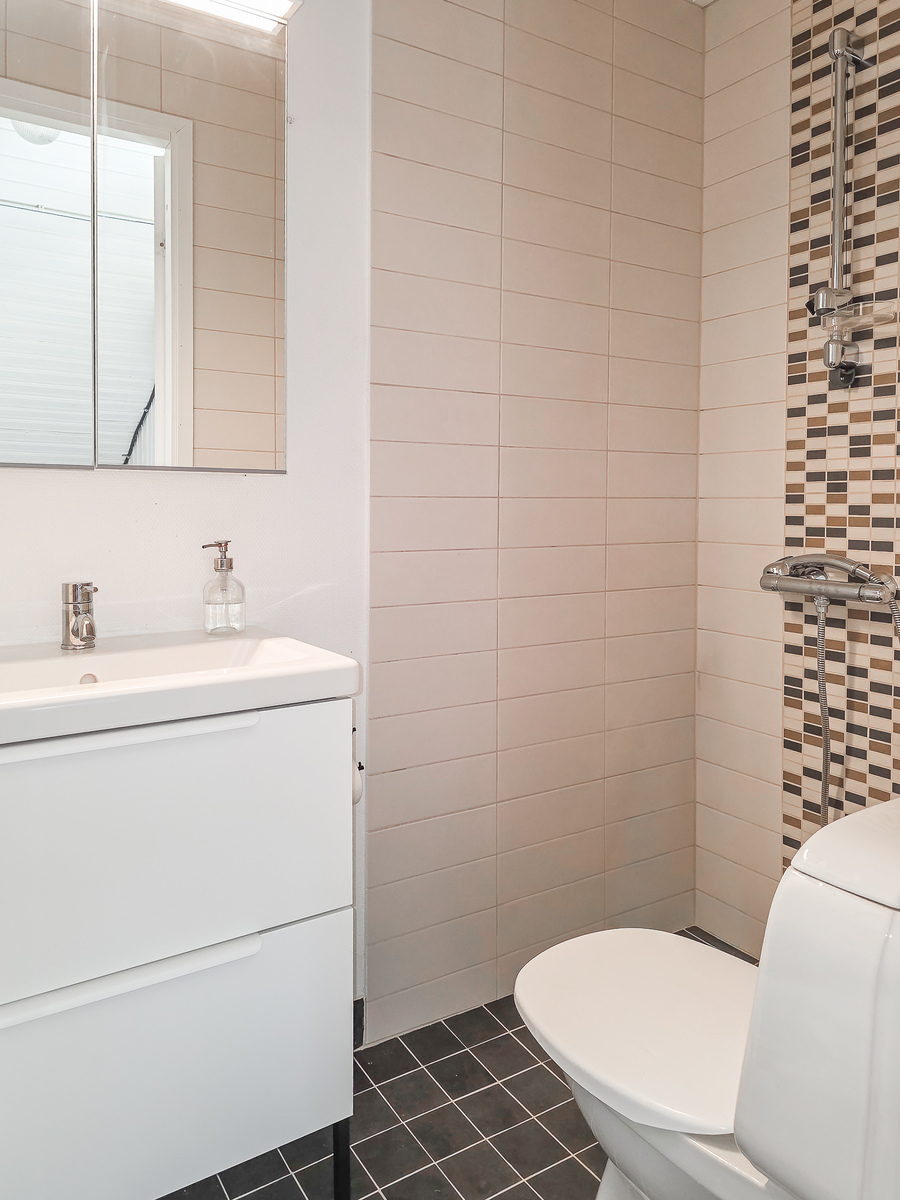 Erilliset wc:t 1. ja 2. kerroksessa. Yläkerrassa suihku, molemmissa kaappitilaa. Laatoitetut lattiat. -