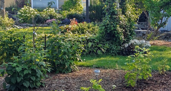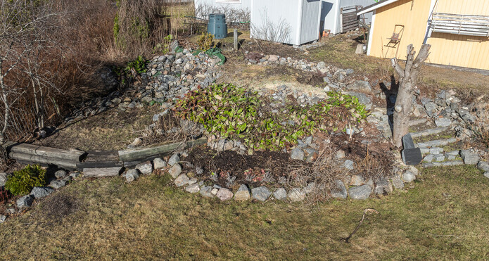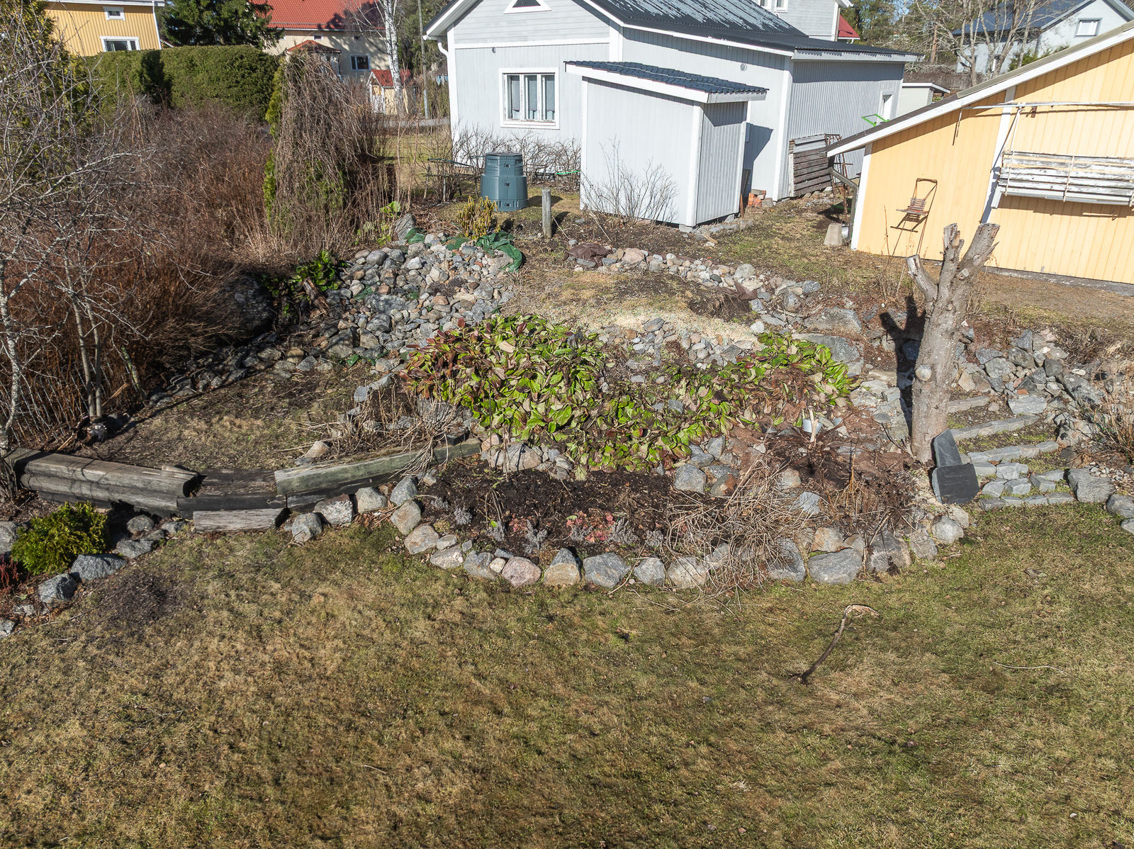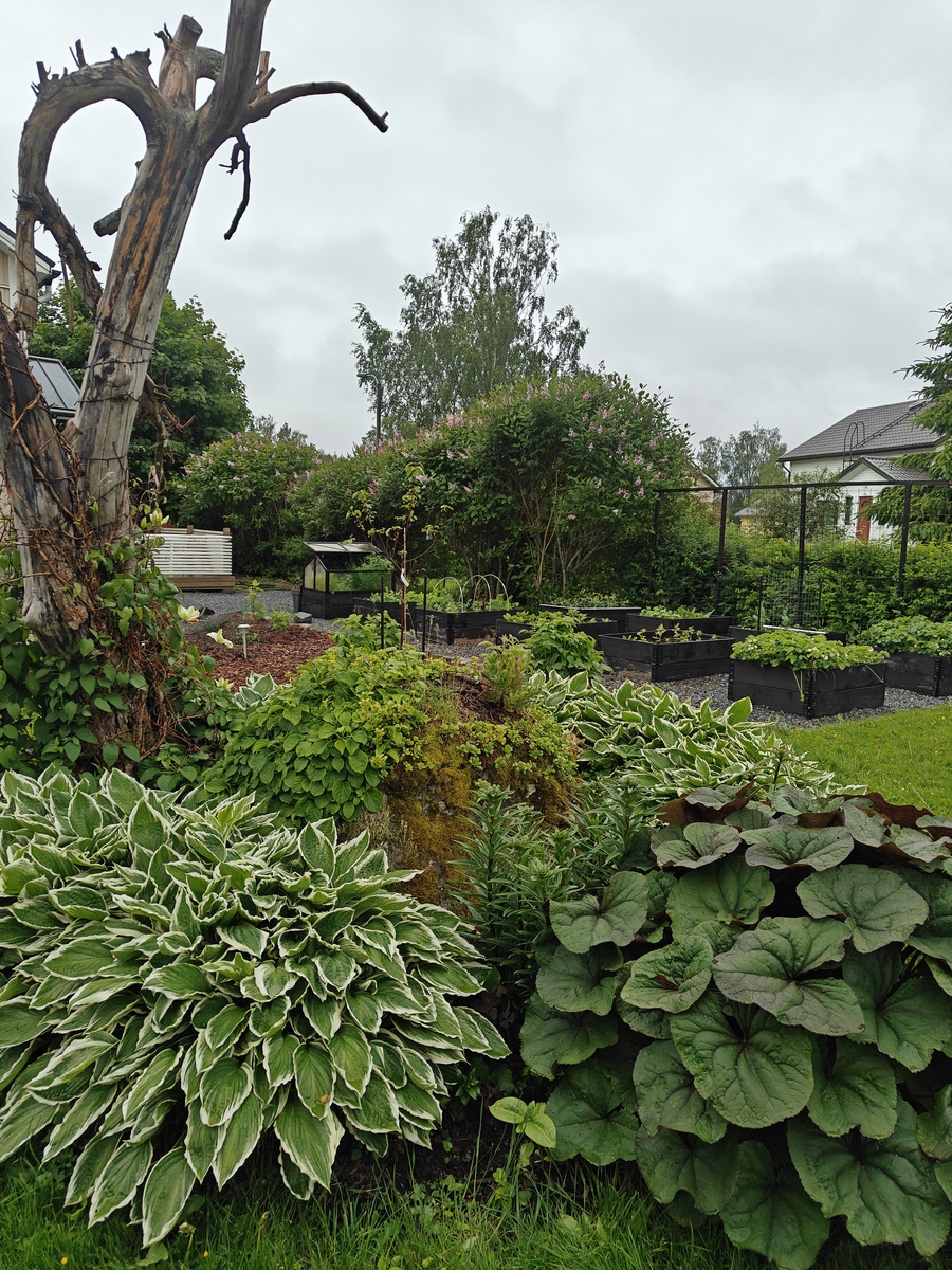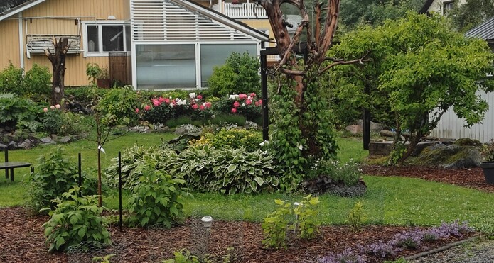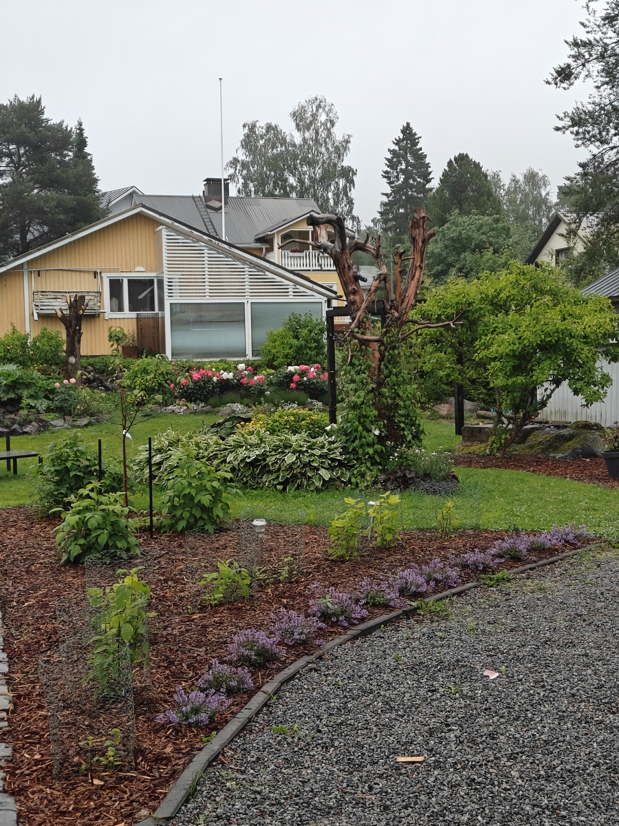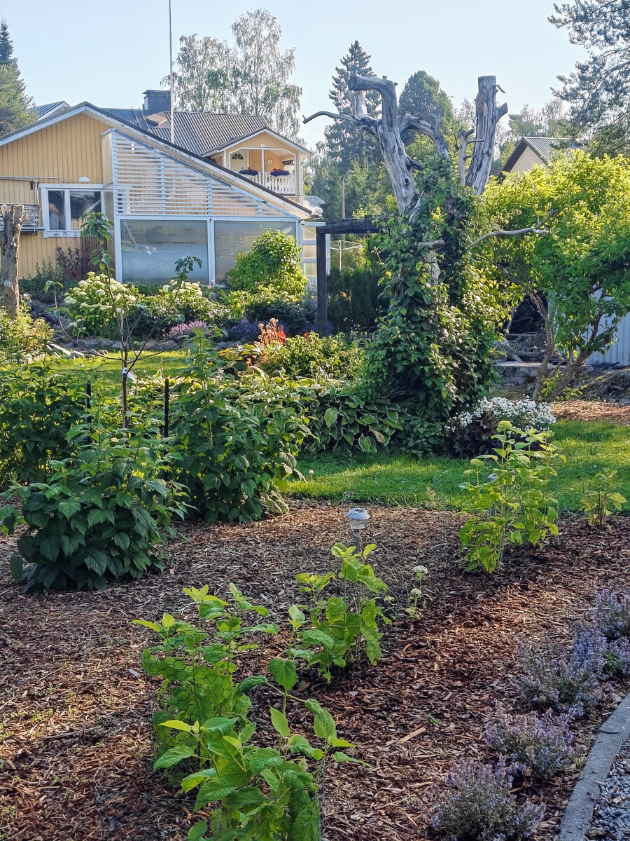 Talon piha on puutarhaihmisen paratiisi. Nykyinen omistaja on suunnitellut ja toteuttanut istutusalueista, perennoista, pensaista ja puista vaikuttavan kokonaisuuden oleskeluterasseja unohtamatta. Pihassa kasvaa mm. paljon pioneja, laventelia ja kuunliljaa. Pihaan on istutettu monivuotisia sipulikukkia, kuten narsisseja, krookuksia, pikarililjoja ja keisarililjoja. Polun varteen (ja muuallekin pihaan) on istutettu hortensioita ja mirrinminttua. Lisäksi loppukesään luo loistokkuutta vanha syyshortensia. Pihassa on myös pensasmustikoita ja vadelmapensaita.