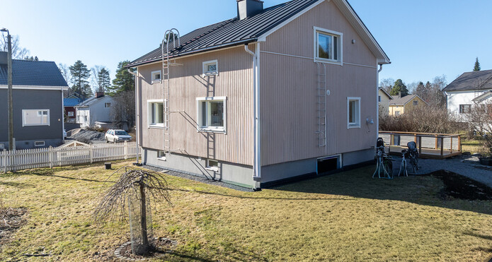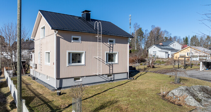 Lisätietoja pinta-alastaAsui pinta-ala 1. ja kerros n. 110 m2. Lisäksi Remontoidut kellaritilat n. 40m2. Pohjakerroksessa kodinhoitotila, suuri kylpyhuone, takka ja sauna sekä säilytystilaa. Autotalli n. 42m2 (lecaharkkoseinärakenne, rak. 1980-l. alussa.