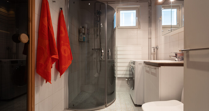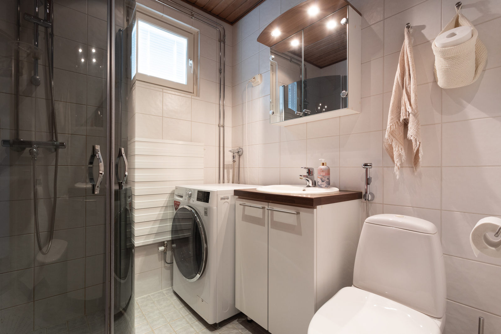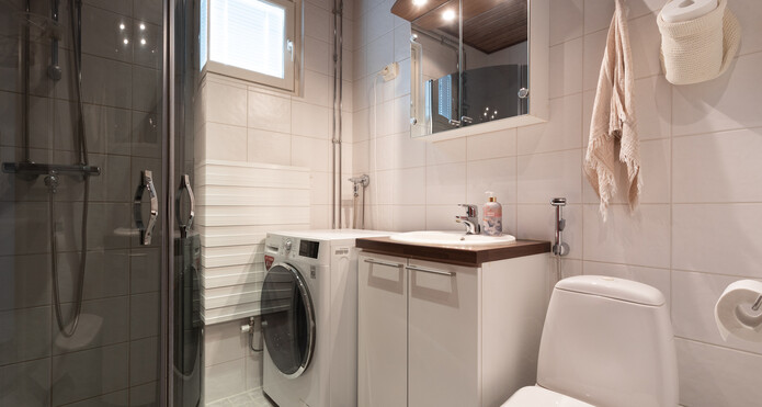 Varusteet: suihkuseinä, pesukoneliitäntä, suihku, peilikaappi -