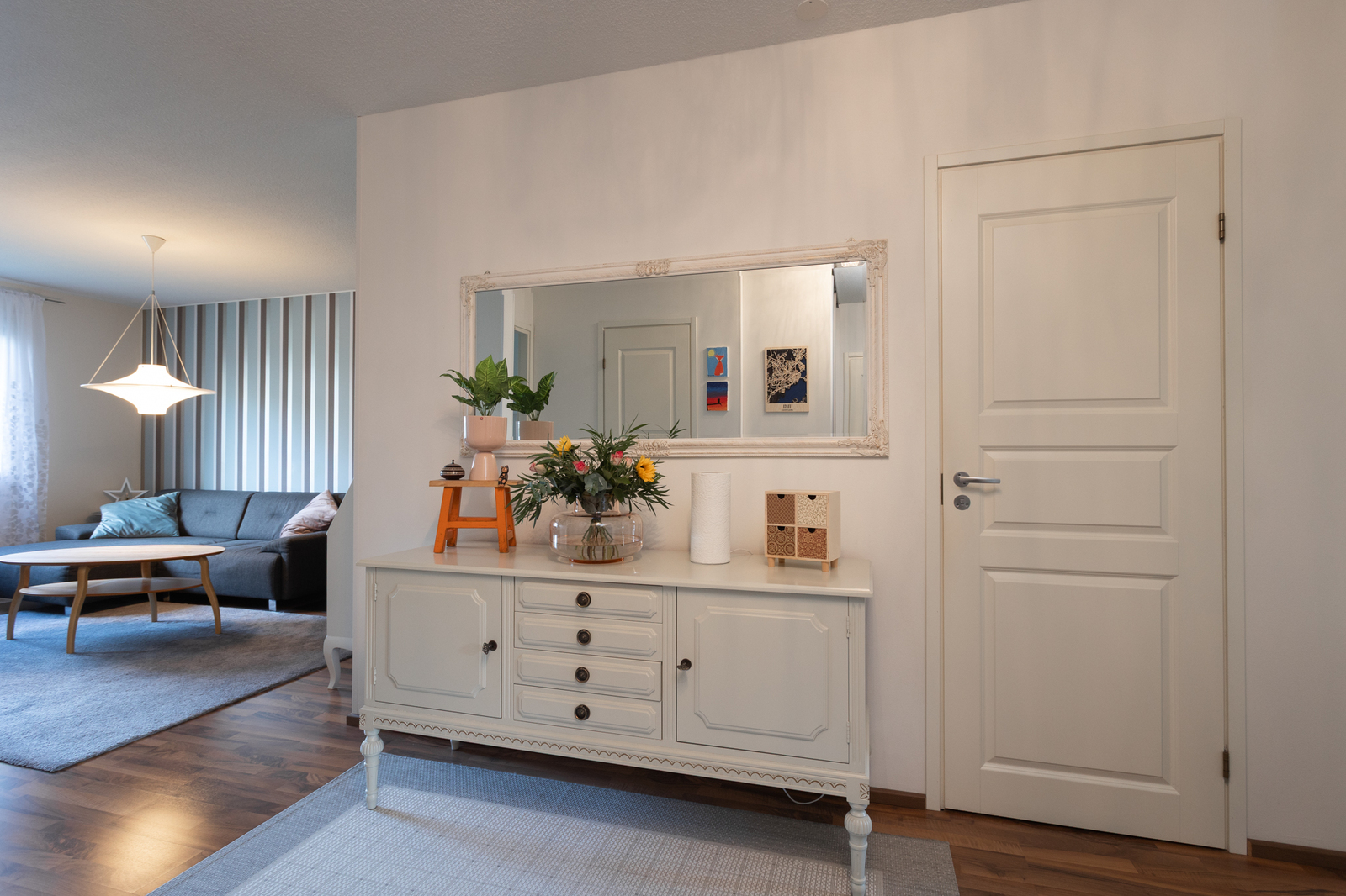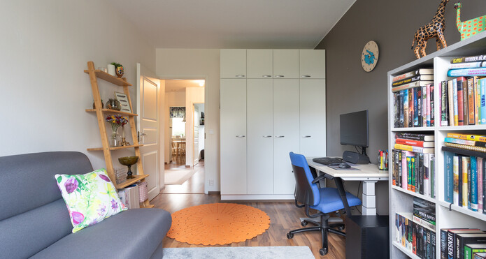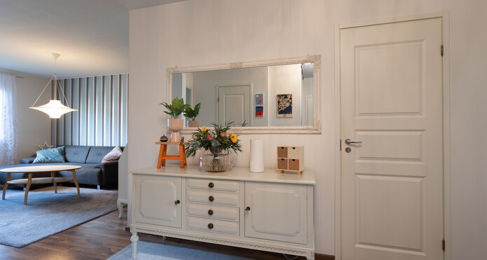 I denna bostad på första våningen är det bekymmersfritt och enkelt att bo och dessutom finns här en sällsynt raritet: en liten terrassgård där du kan njuta av morgonkaffet eller tillbringa kvällen i lugn och ro och njuta av solnedgången.