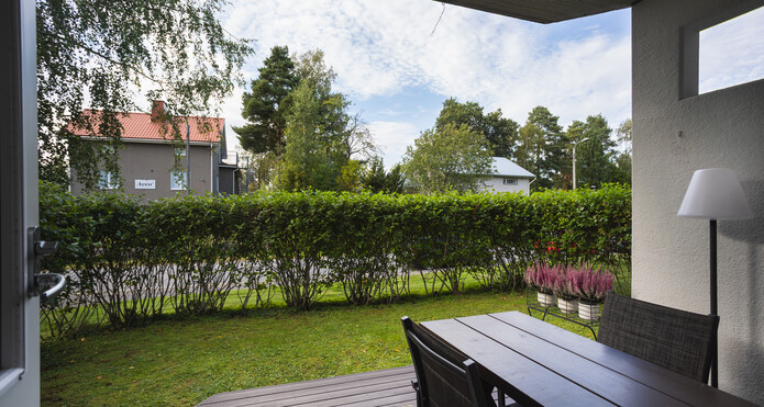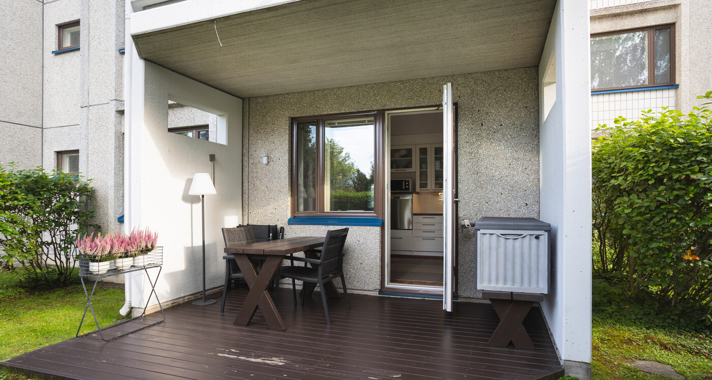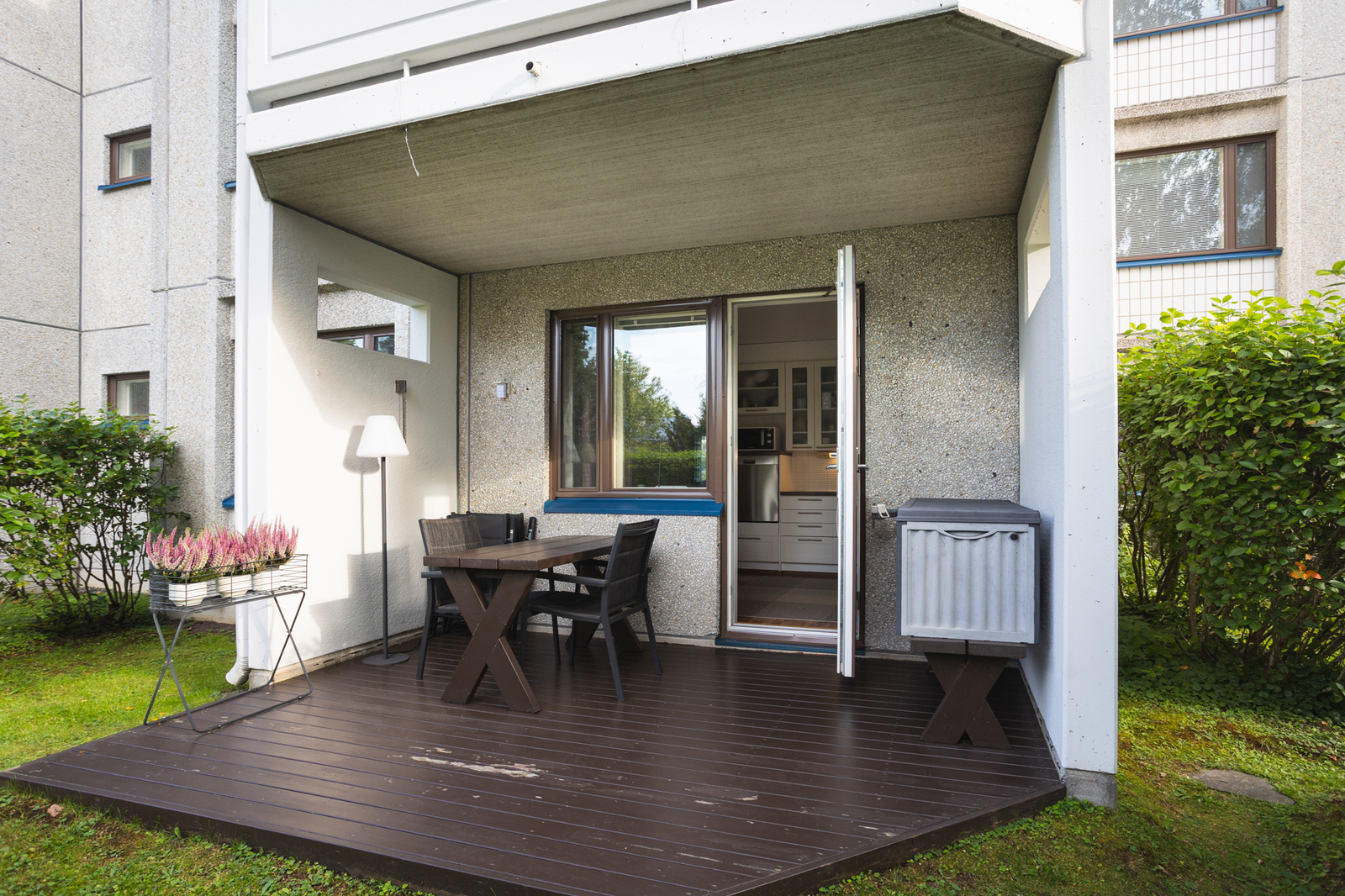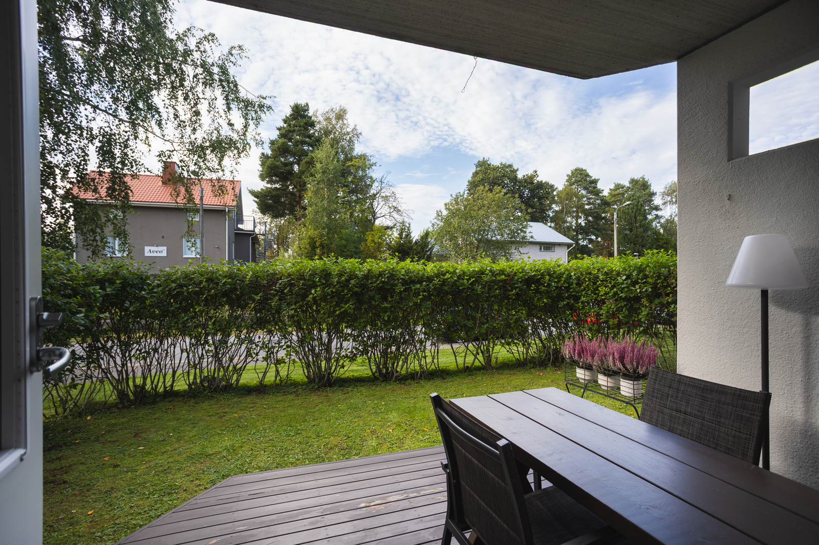 Tämä ensimmäisen kerroksen asunto tarjoaa asumisen helppoutta ja harvinaisen lisän: pienen terassipihan, jossa voit nauttia aamukahvit tai viettää iltaa rauhassa auringonlaskusta nauttien.