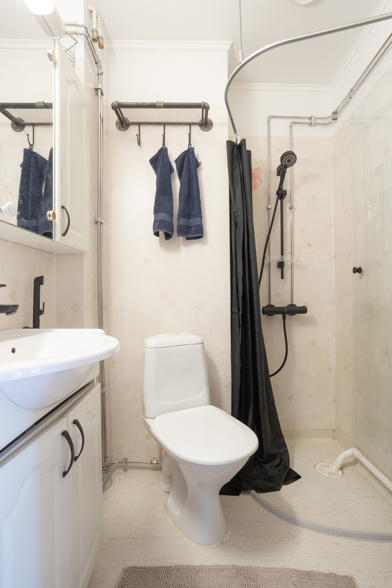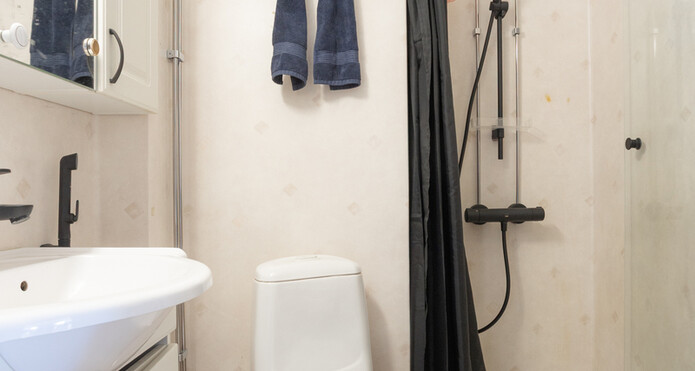 Varusteet: suihkuseinä, pesukoneliitäntä, lattialämmitys, suihku, peilikaappi -