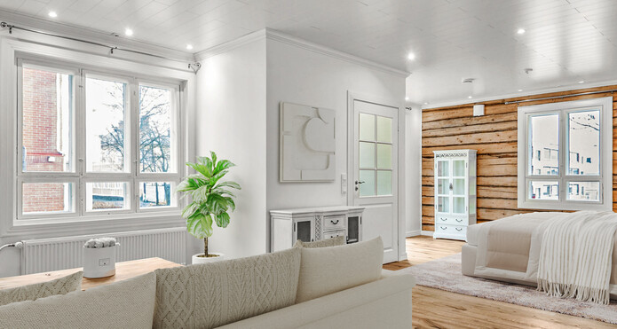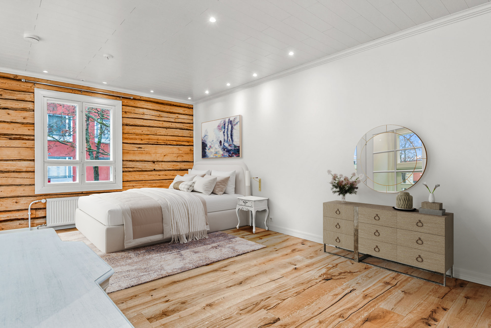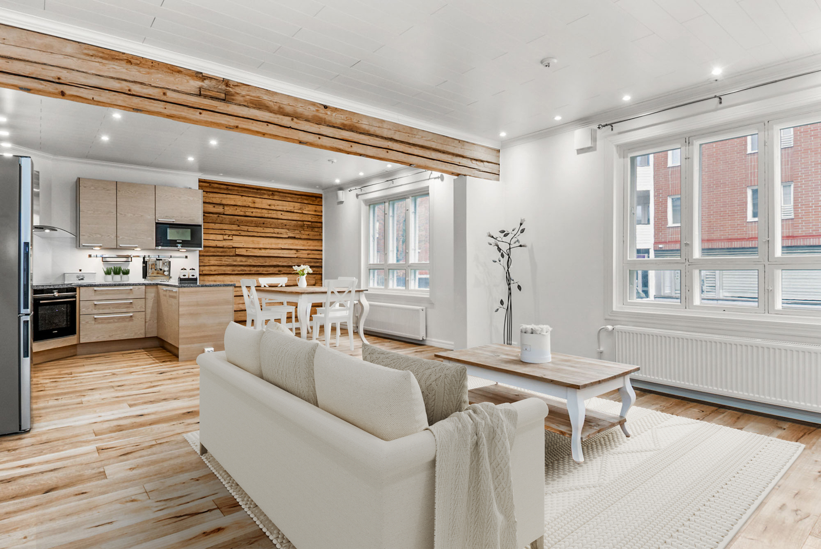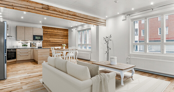 Tämä 1. asuinkerroksen huoneisto on uusittu täydellisesti eristeitä myöden ja saanut uutuuttaan hohtavat pinnat, jotka miellyttävät vaativankin asujan silmää. Loftmainen pohjaratkaisu luo valoa ja avaruutta kuitenkin toisen makuuhuoneen ollessa erillinen. Myös olohuoneen vieressä sijaitsevan makuuhuoneen voit halutessasi erottaa olohuoneesta väliseinällä tai vaikkapa modernilla lasiseinämällä.