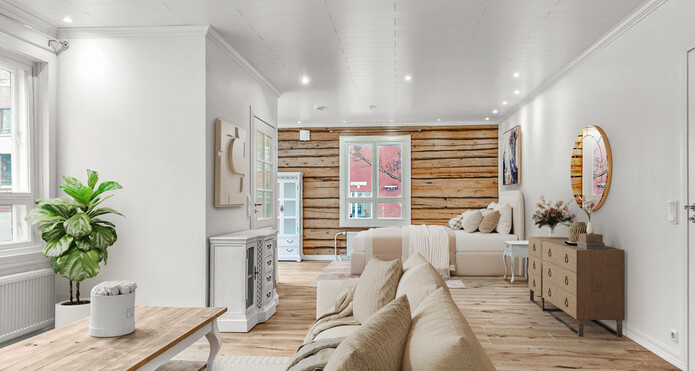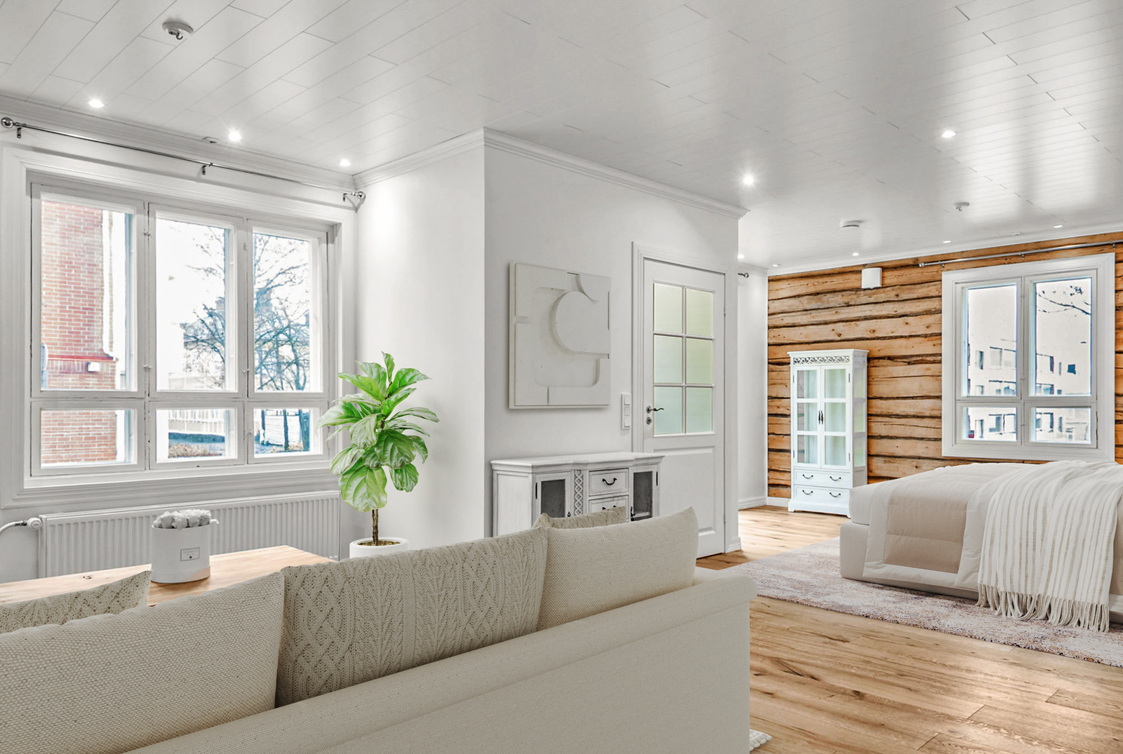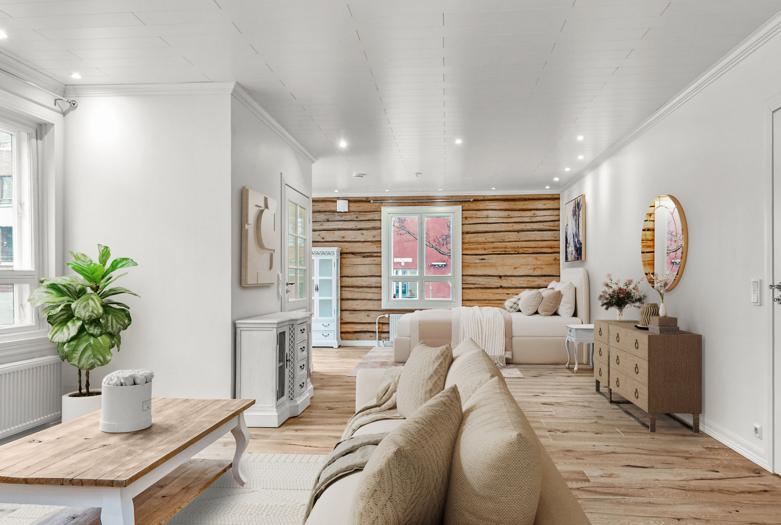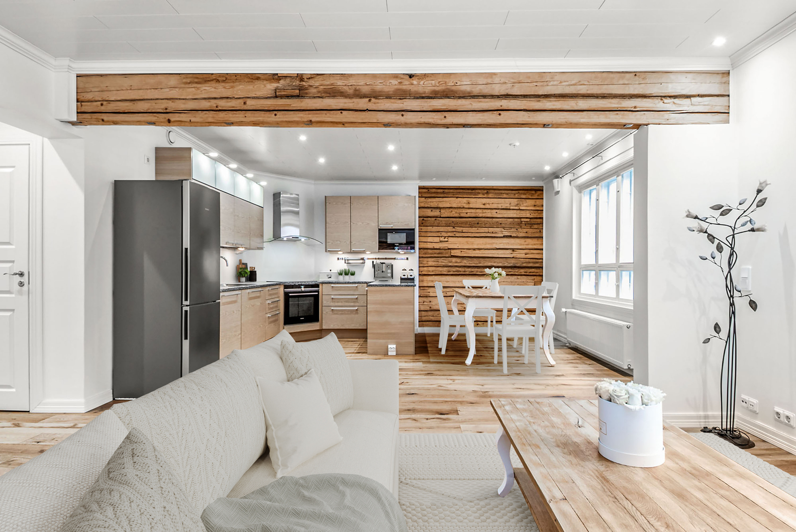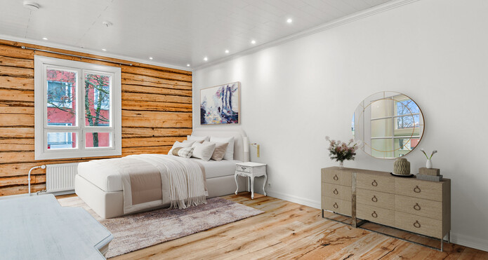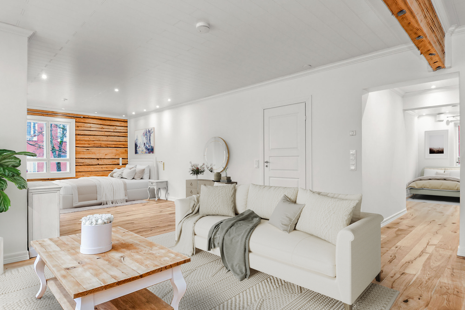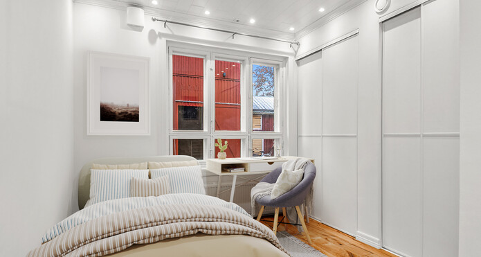 Lägenheten befinner sig på första våningen och har totalrenoverats ända ner till isoleringen och fått skinande nya ytor som tilltalar även den mest kräsna boende. Den loftliknande planlösningen skapar ljus och rymd, samtidigt som det ena sovrummet ändå är separat. Om du önskar kan du även skilja av det andra sovrummet, som ligger intill vardagsrummet, med en mellanvägg eller till exempel en modern glasvägg.