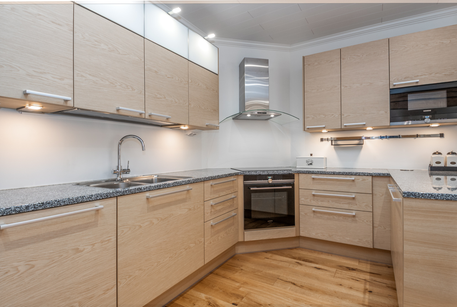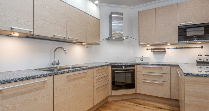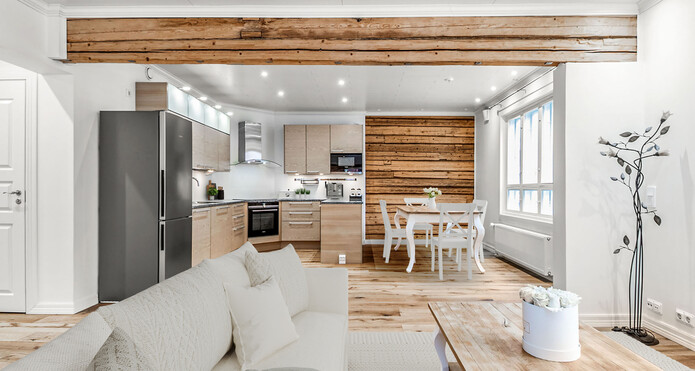 Det högklassiga köket har gott om skåpförvaring och en köksö som ger rikligt med arbetsyta. Vitvarorna är huvudsakligen integrerade och bänkskivorna är av sten. Precis som i resten av lägenheten har man satsat stort på belysningen i både kök och matplats. De framtagna timmerväggarna har en belysning som framhäver den rustika ytan.
