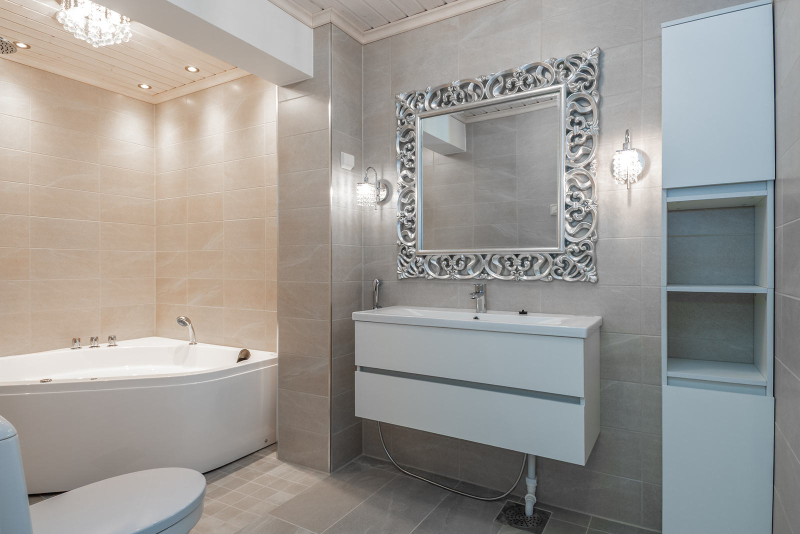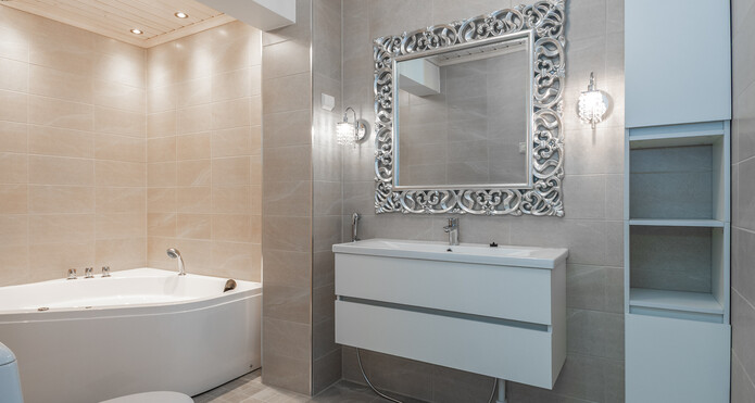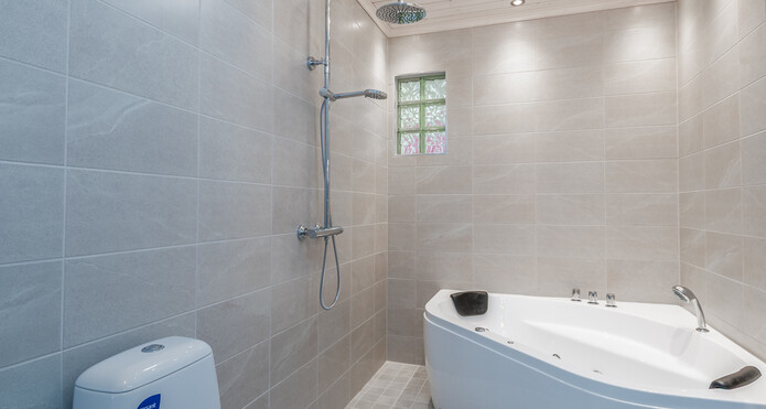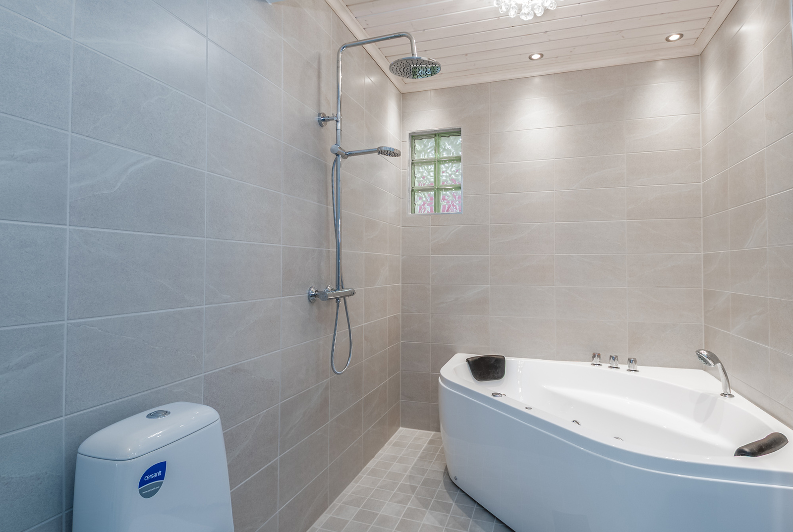 Tilava kylpyhuone huokuu luksusta; harmoninen värimaailma, upeat valaisimet ja poreamme kutsuvat nauttimaan ja rentoutumaan työpäivän jälkeen.