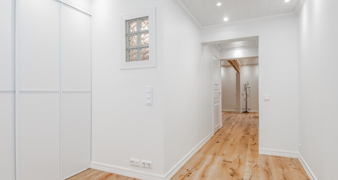 Lägenheten har två ingångar, en från gatan och en från innergården. I hallen mot innergården finns ett praktiskt utrymme för ytterkläder och dessutom en grovköksdel med anslutning för tvättmaskin.